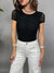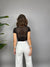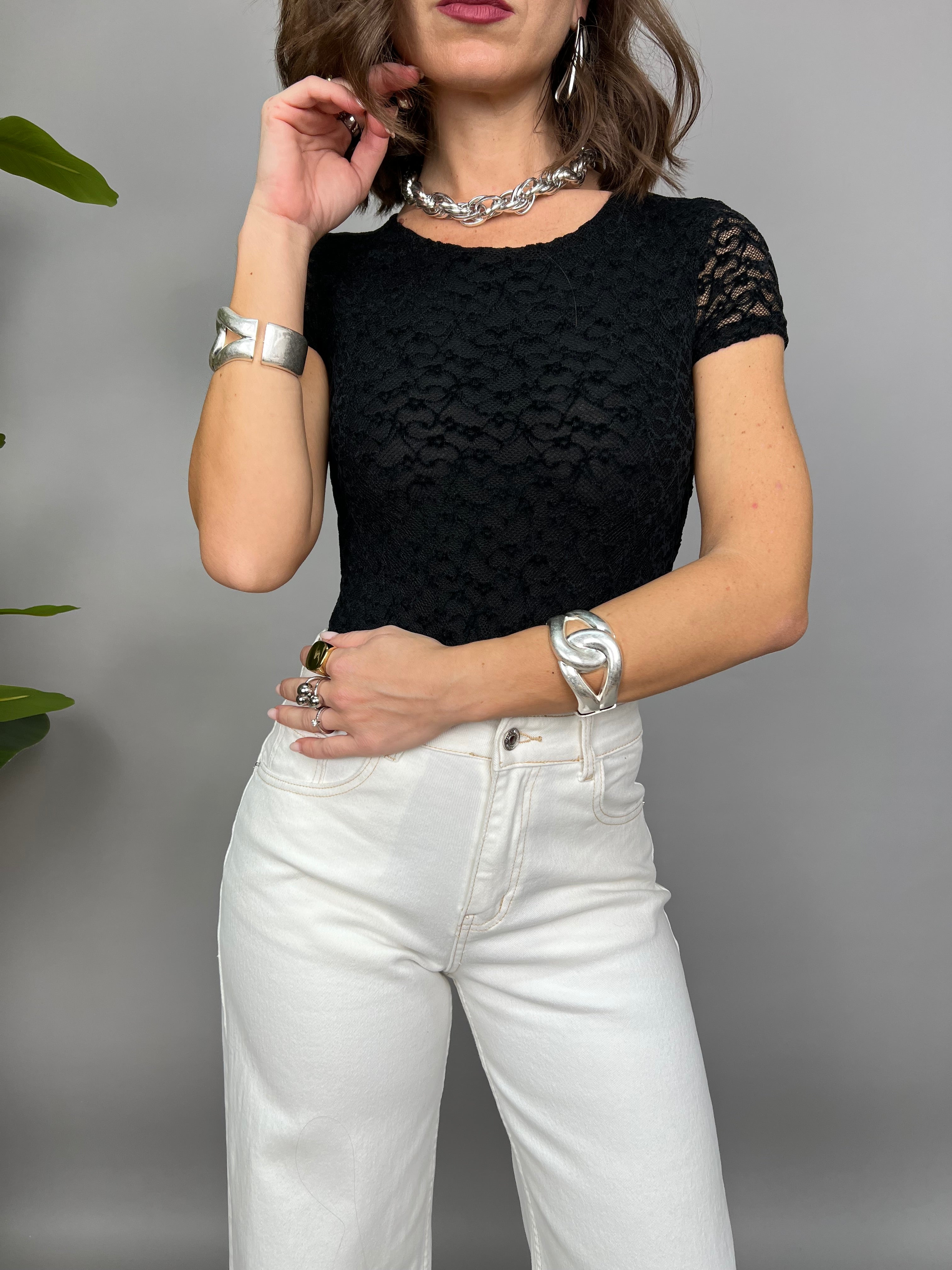Body elasticizzato con fantasia in rilievo in velluto nero. La chiusura è con gancetti. La variante in nero è consigliata per un altezza massima di 1.60 cm