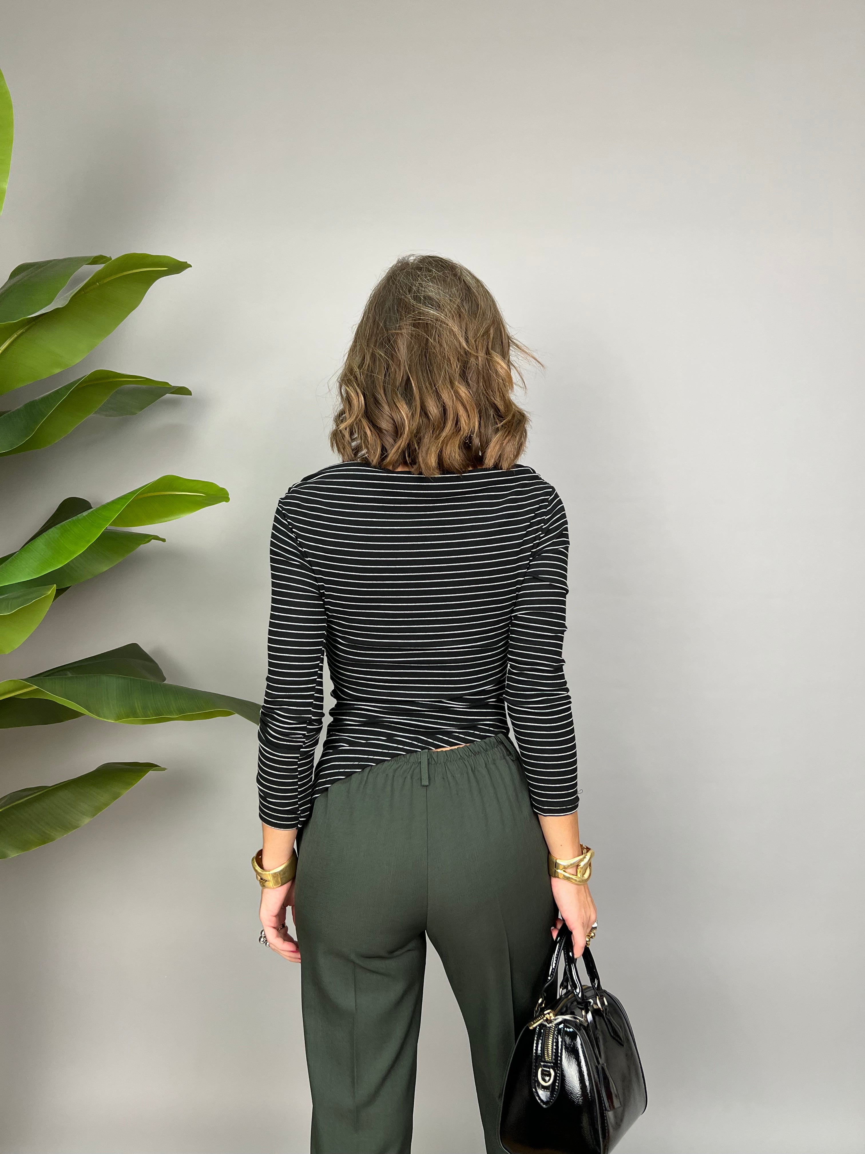 Maglia con scollatura a barca e lunghezza asimmetrica. Il tessuto è elasticizzato.
