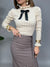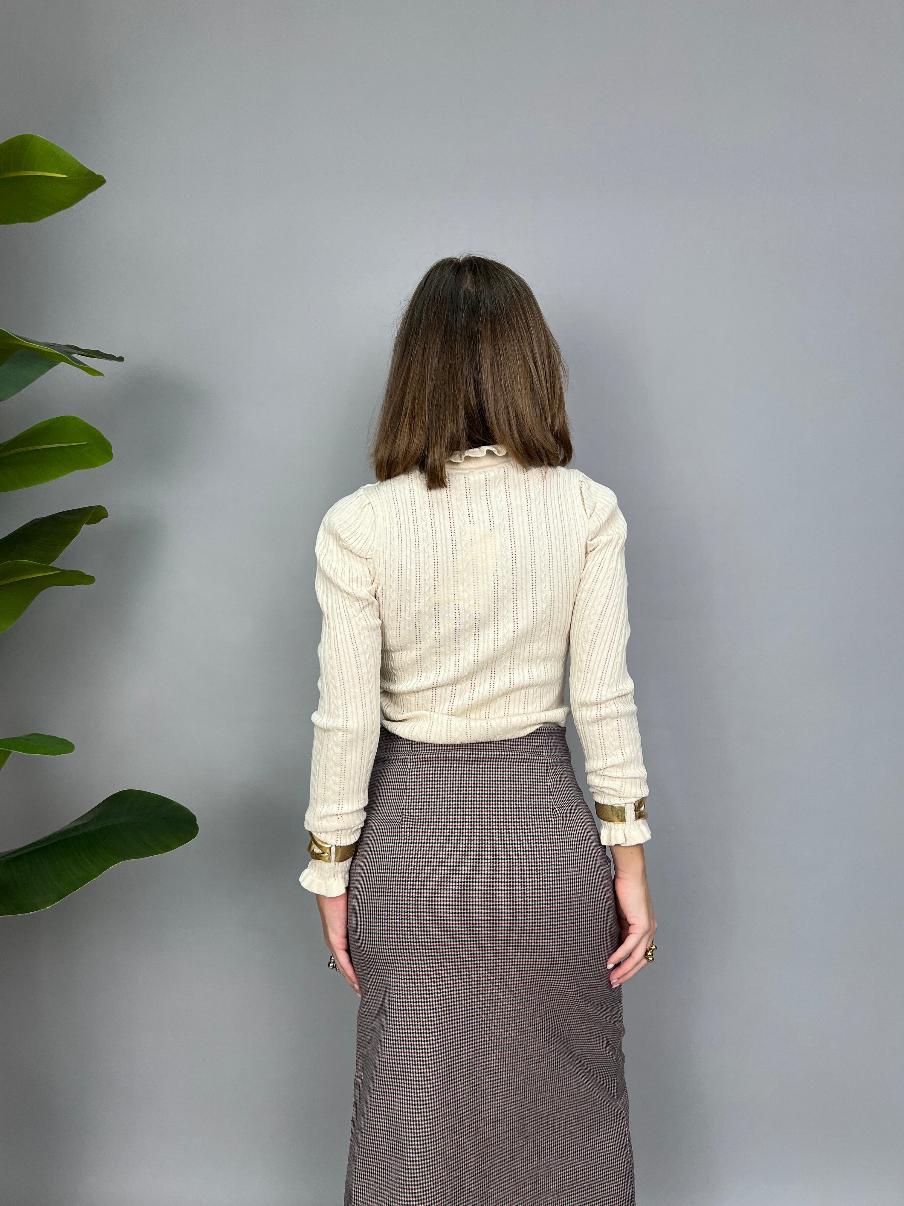 Maglia elasticizzata con spalle a sbuffo e fiocco frontale.