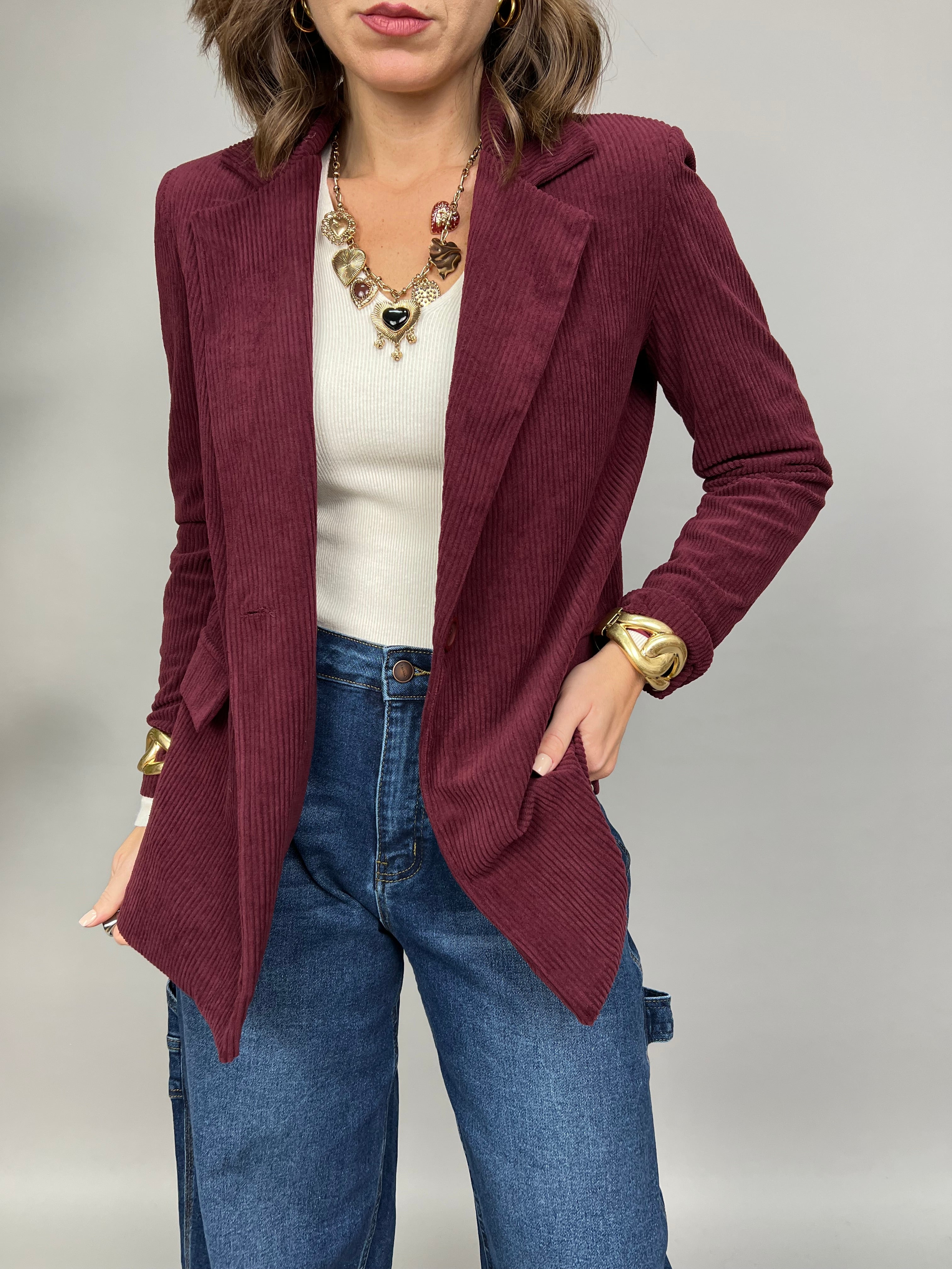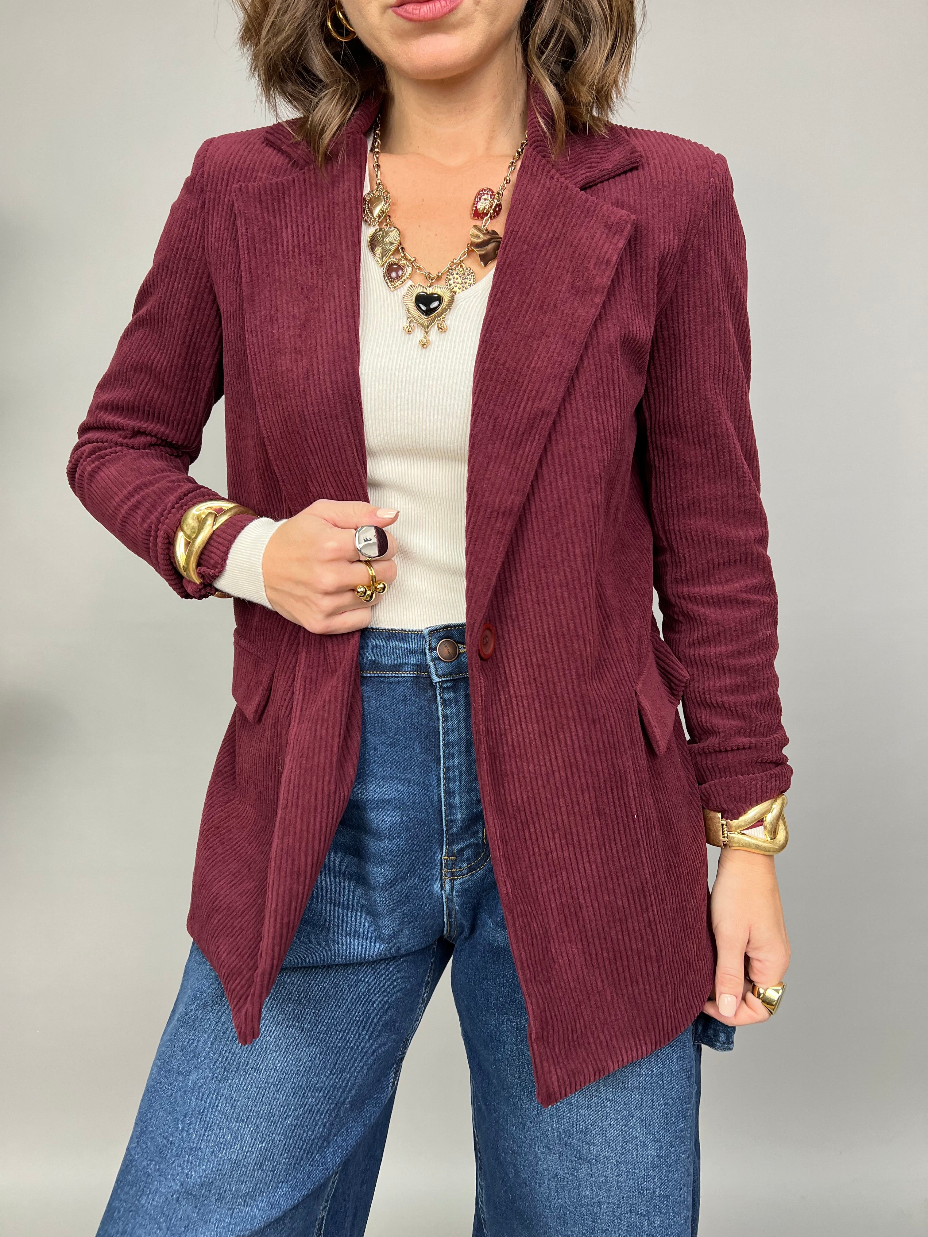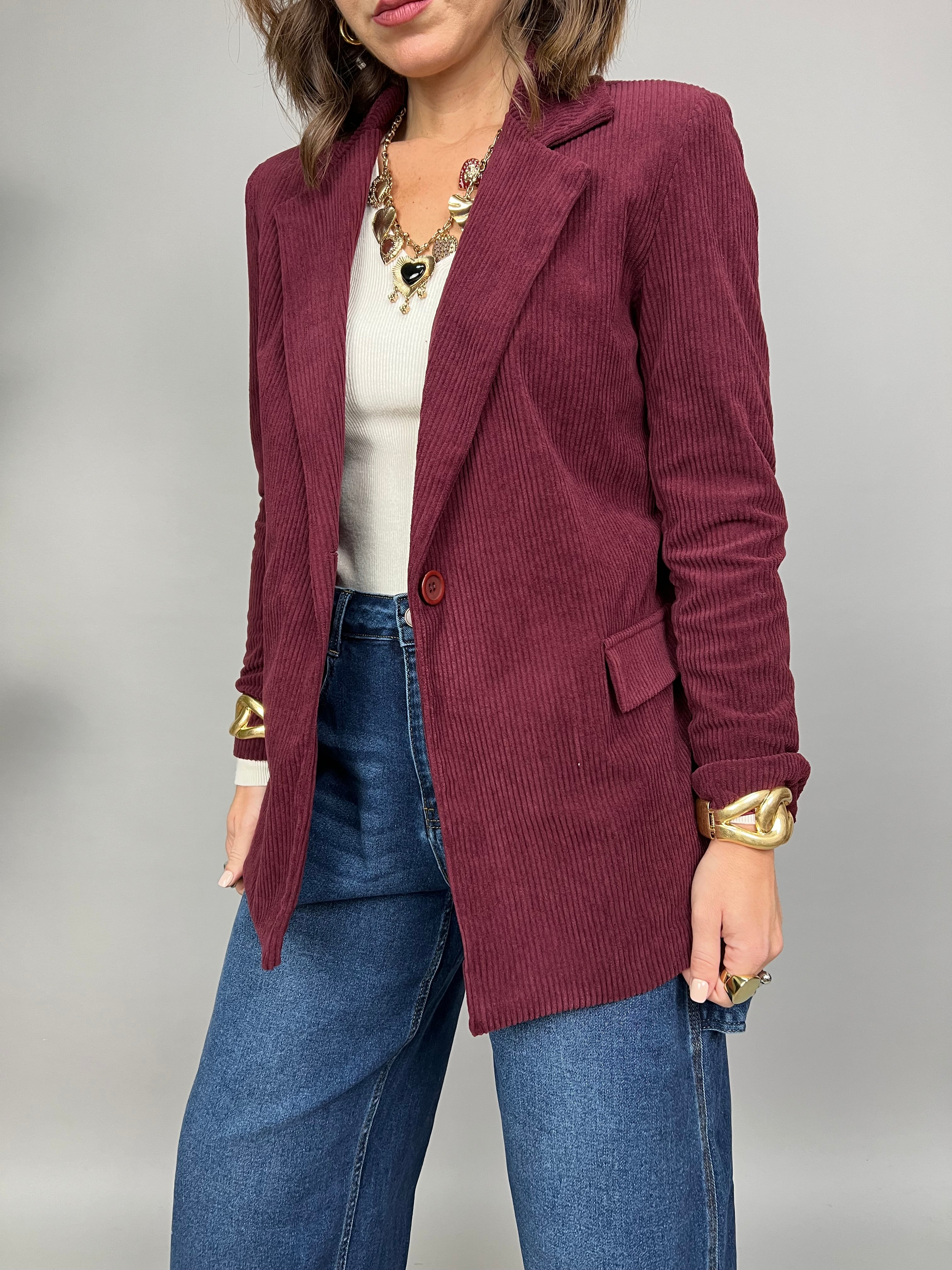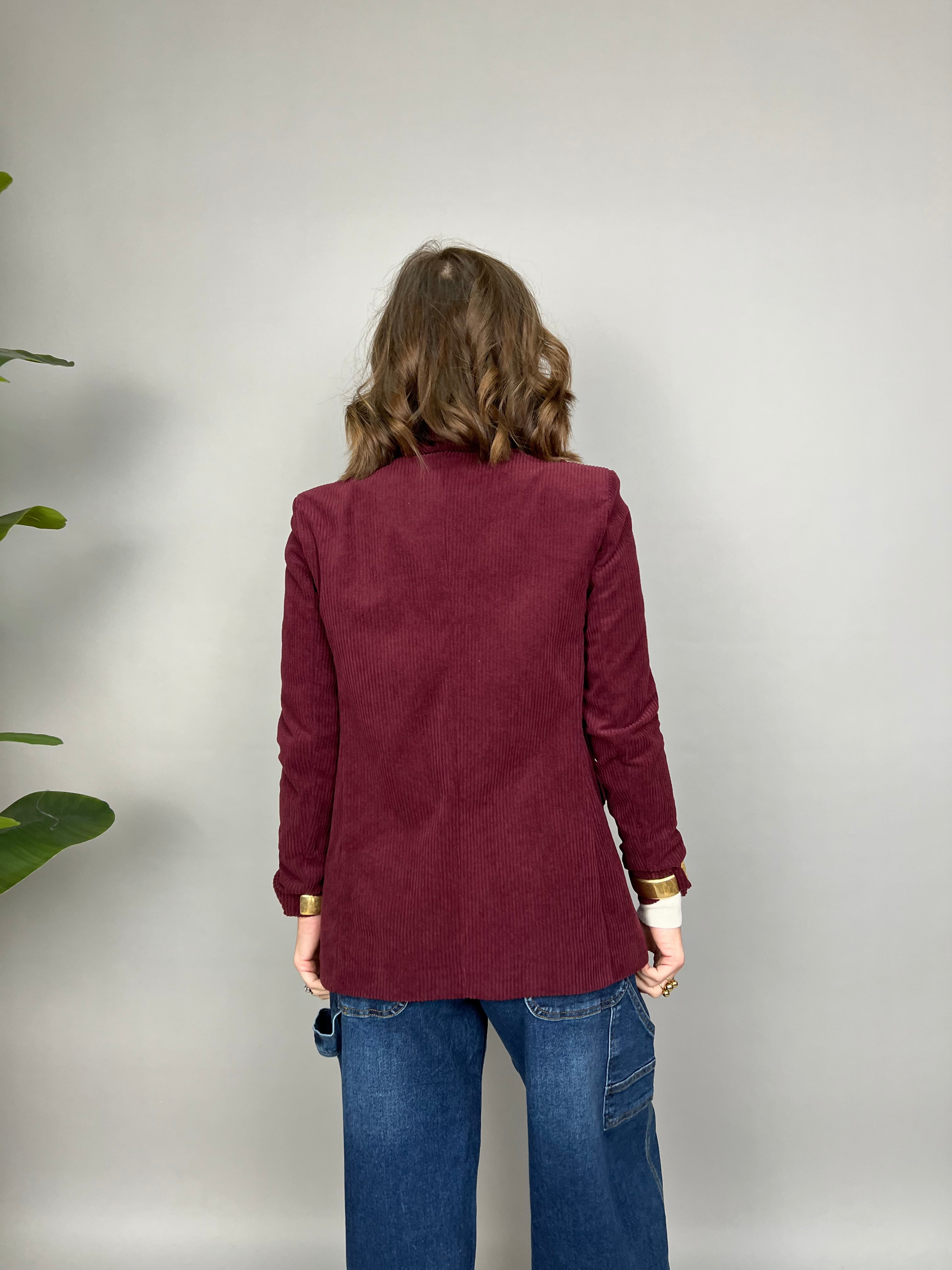Giacca non strutturata con spalline di supporto e fodera interna. Il modello è avvitato con chiusura monopetto.