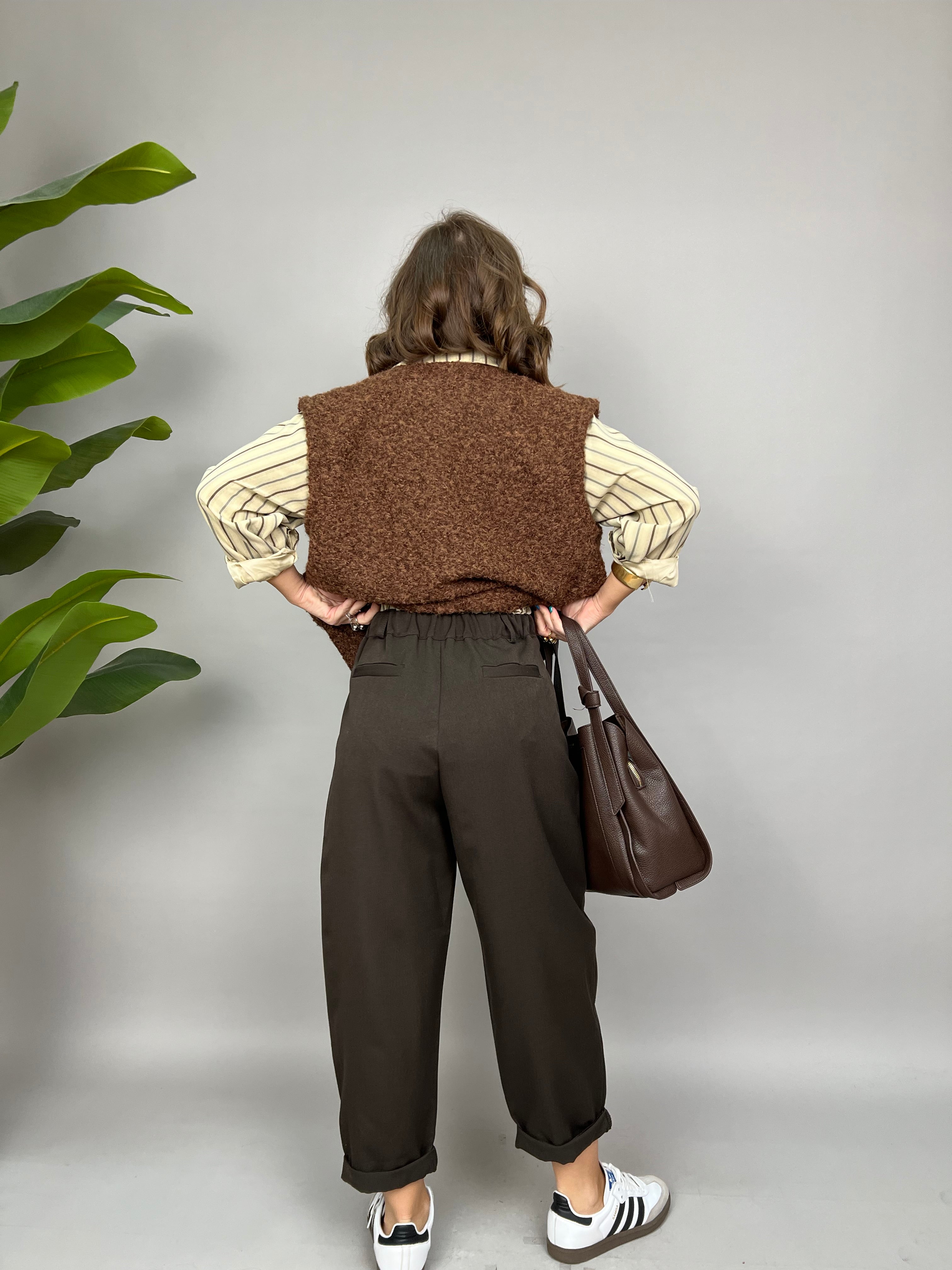 Pantalone dalla vestibilità comoda con pinces frontali, tasche laterali ed elastico in vita.