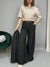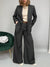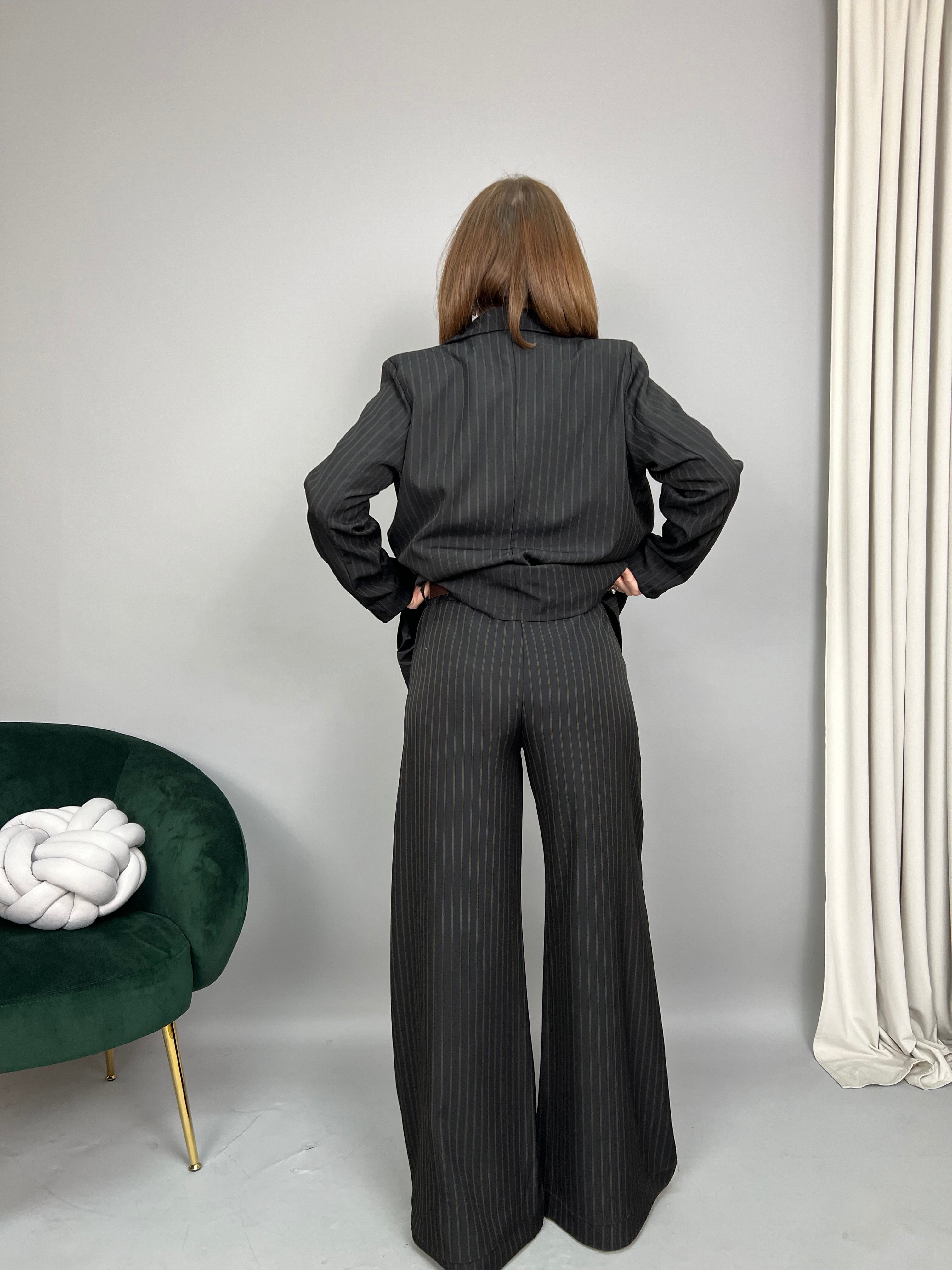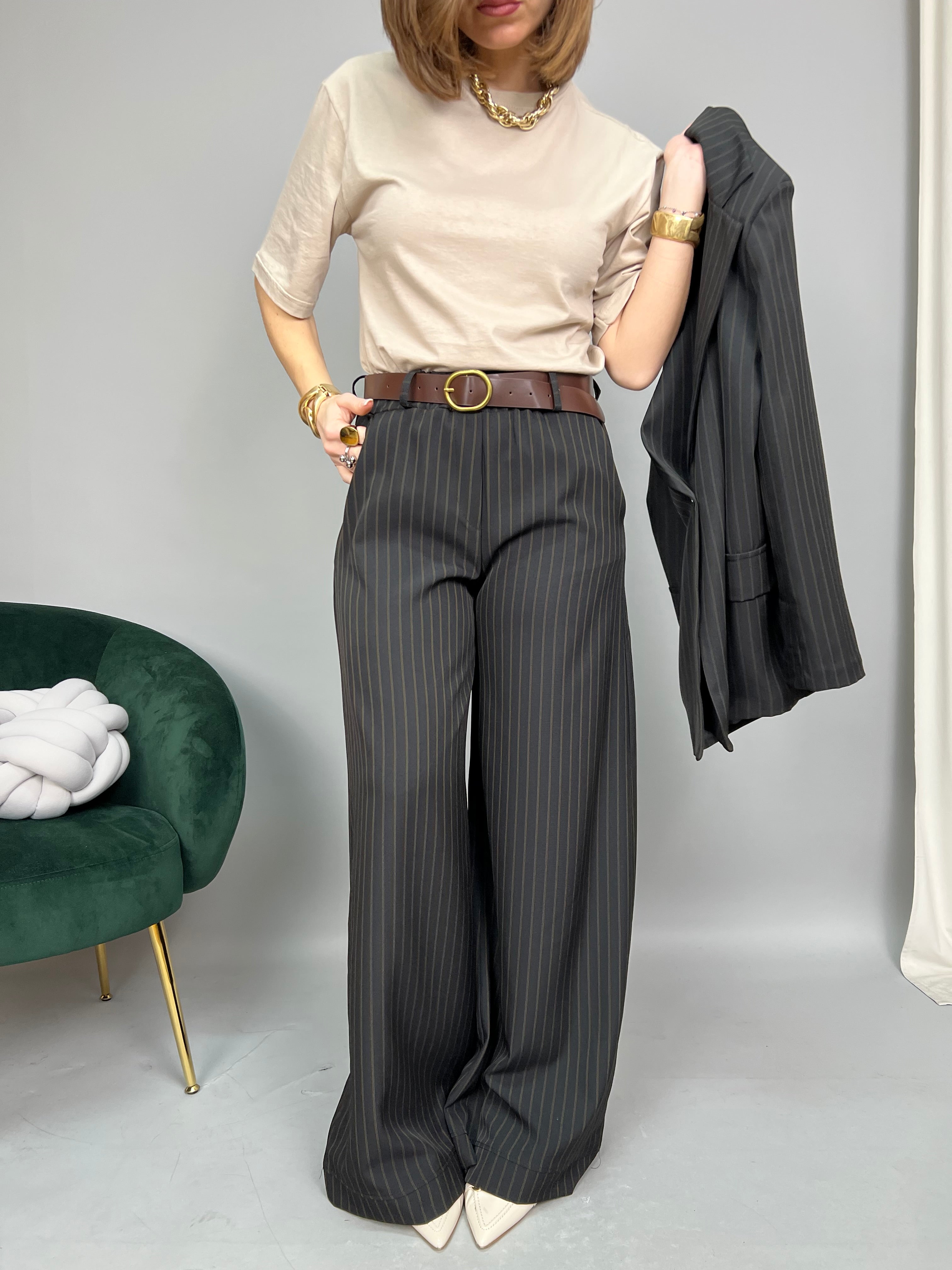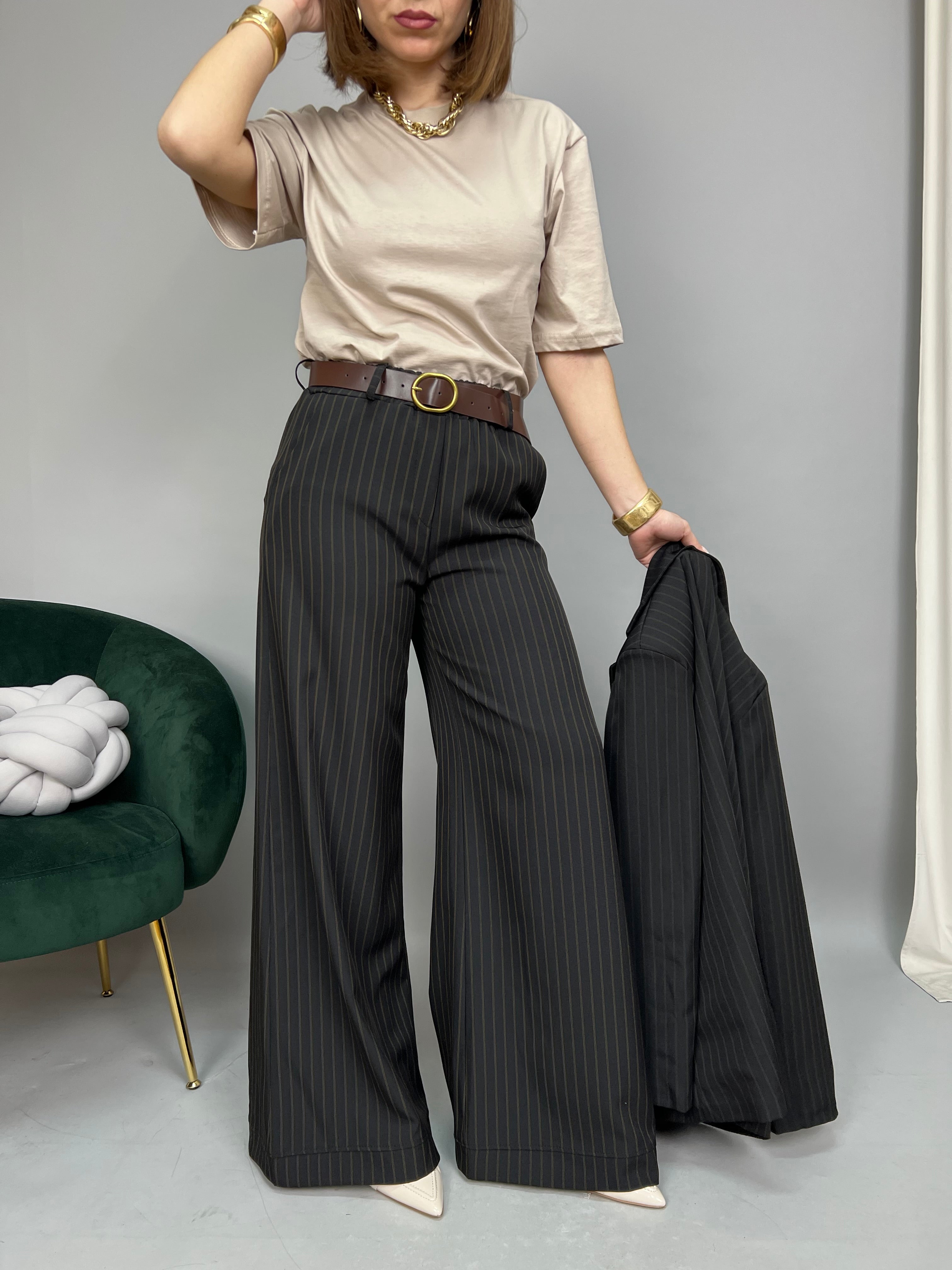 Pantalone gessato, modello palazzo dalla gamba ampia. Presenta elastico in vita e tasche laterali. La vestibilità è comoda. La cintura è inclusa.