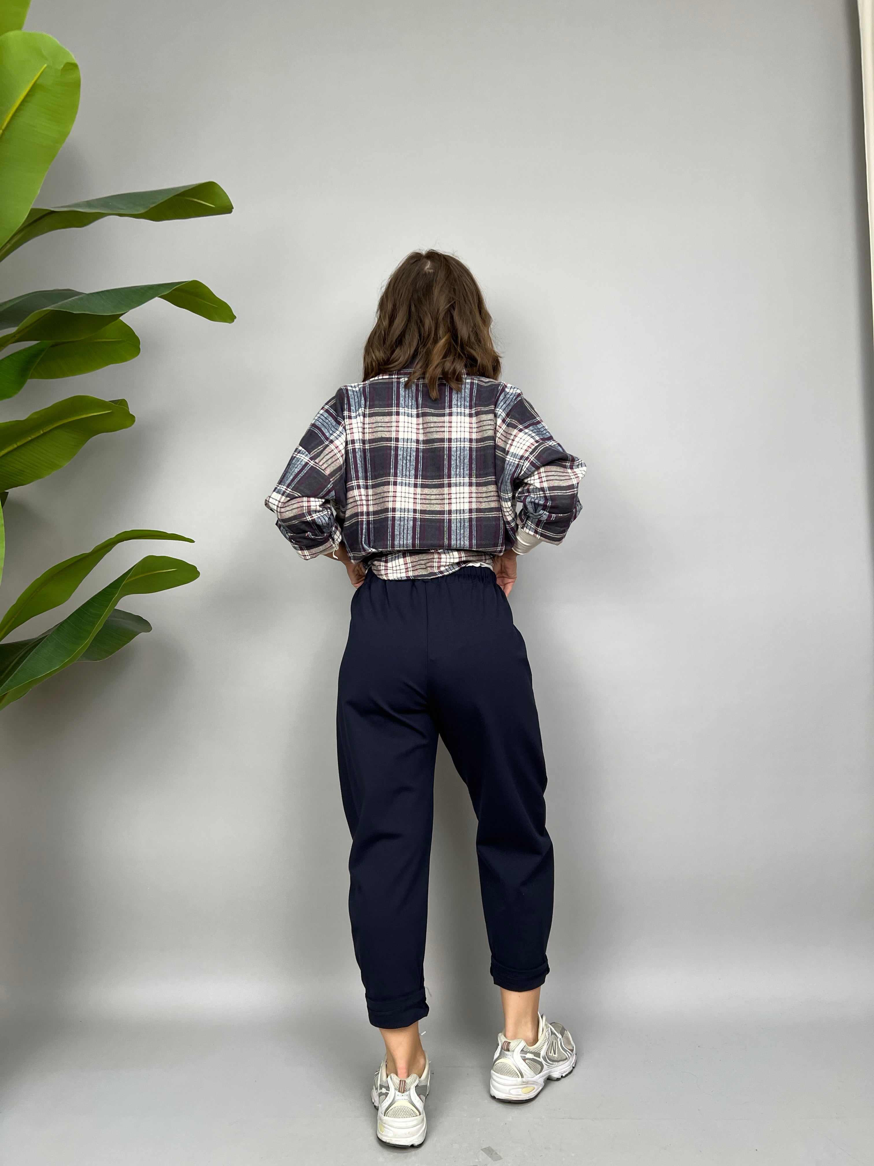 Pantalone in "punto Milano" dalla vestibilità comoda. Il modello presenta un elastico in vita e due tasche laterali.