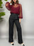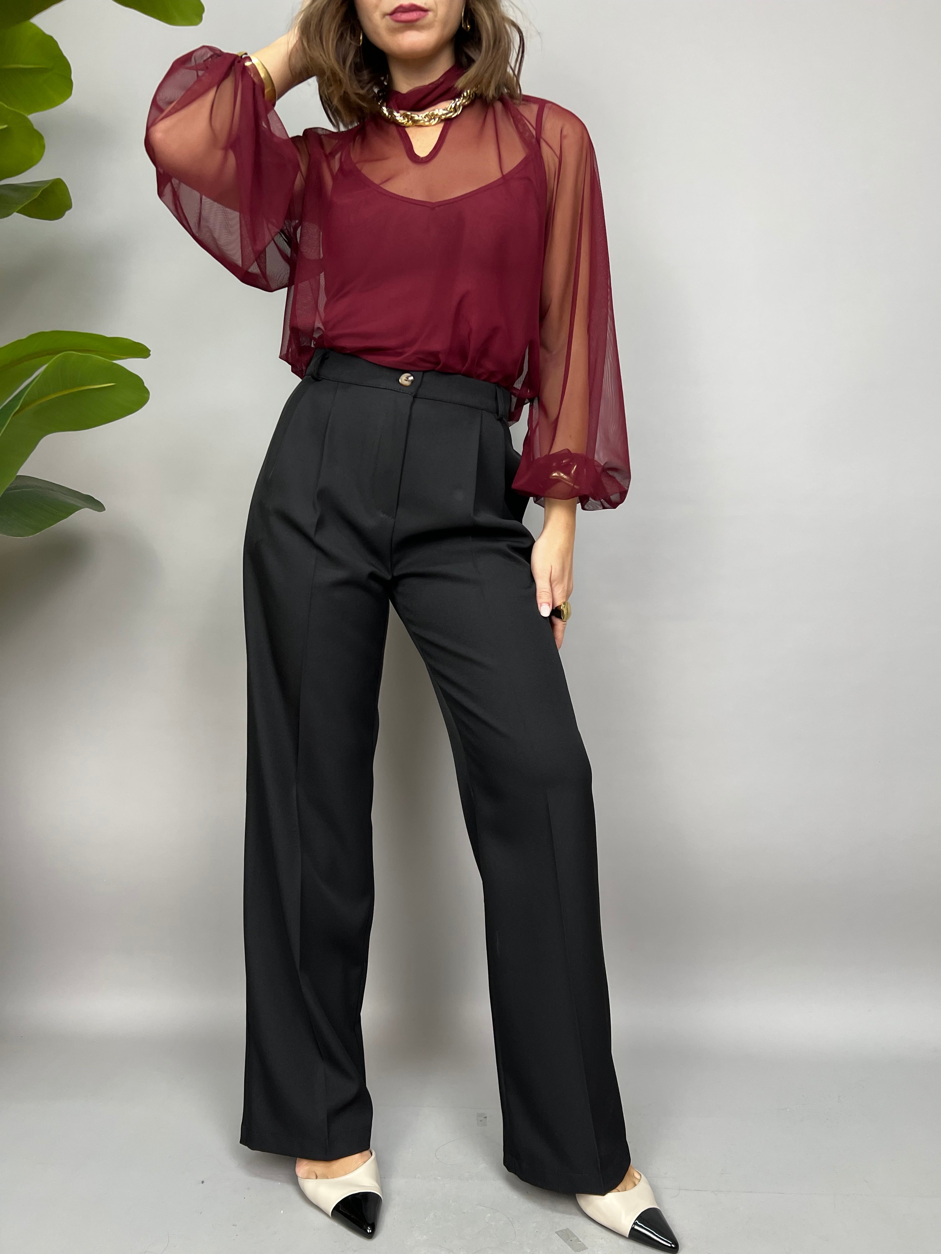 Pantalone modello "palazzo" a vita alta con pinces frontali e tasche laterali.