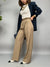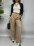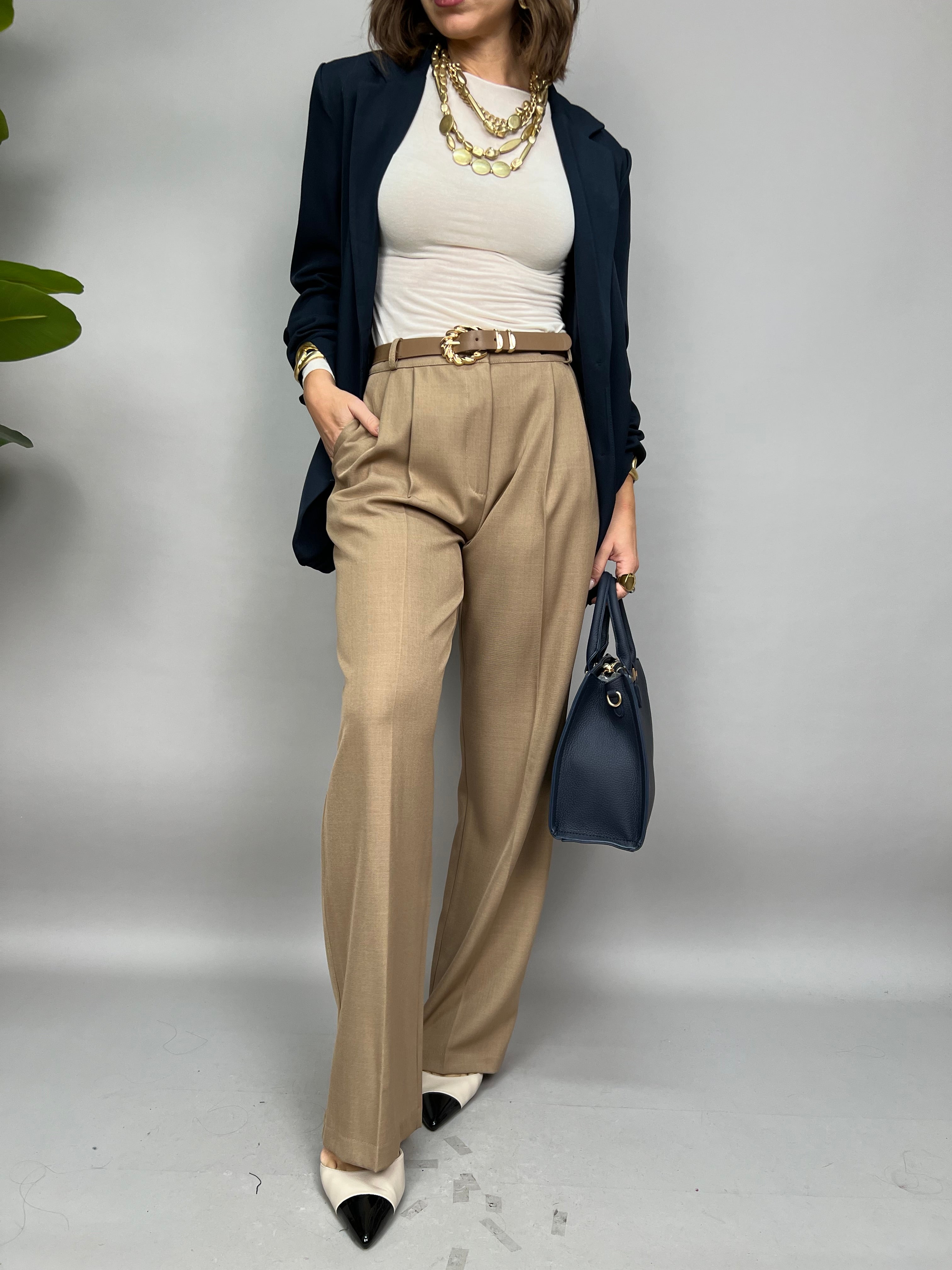 Pantalone modello "palazzo" a vita alta con pinces frontali e tasche laterali.