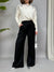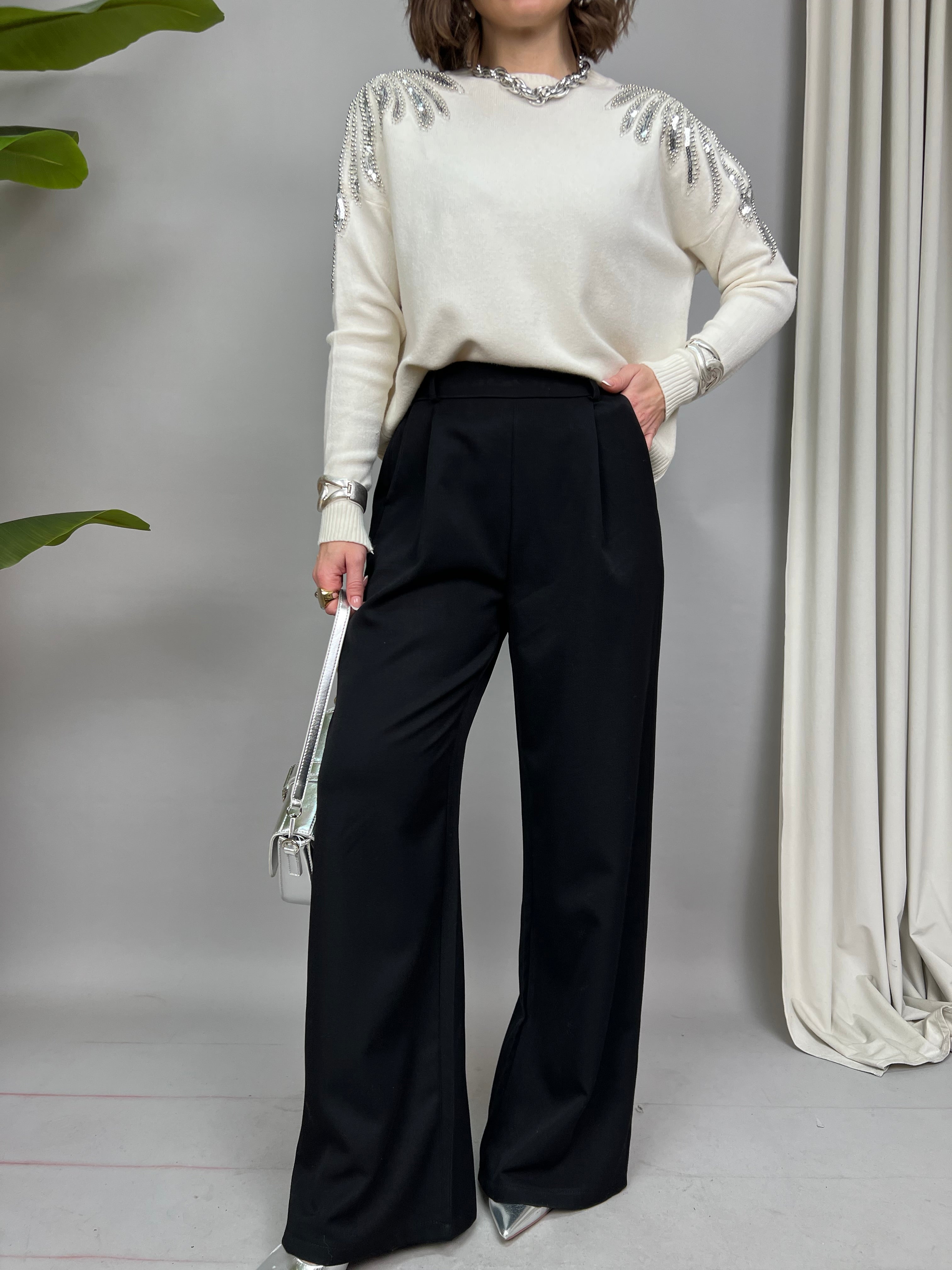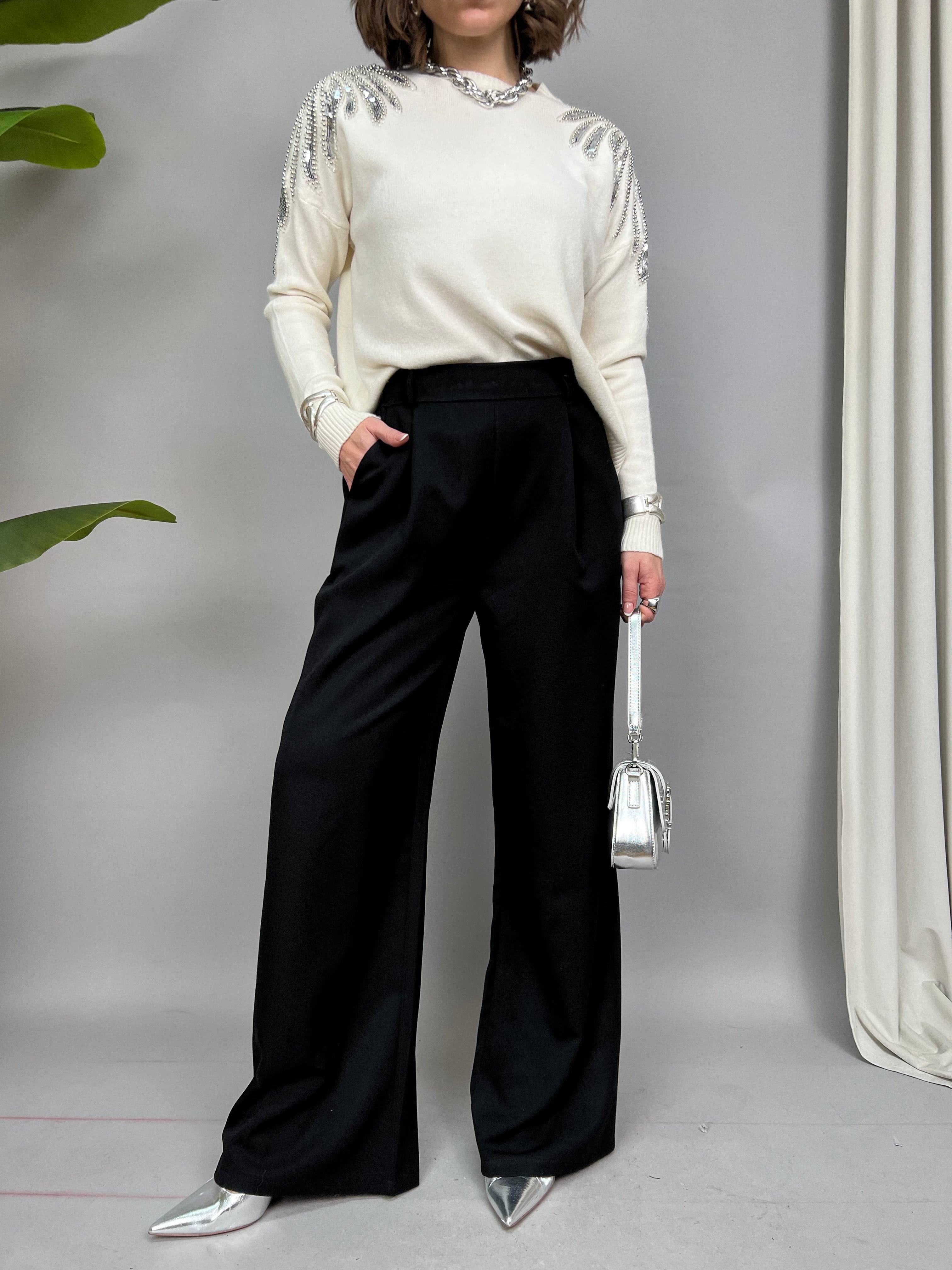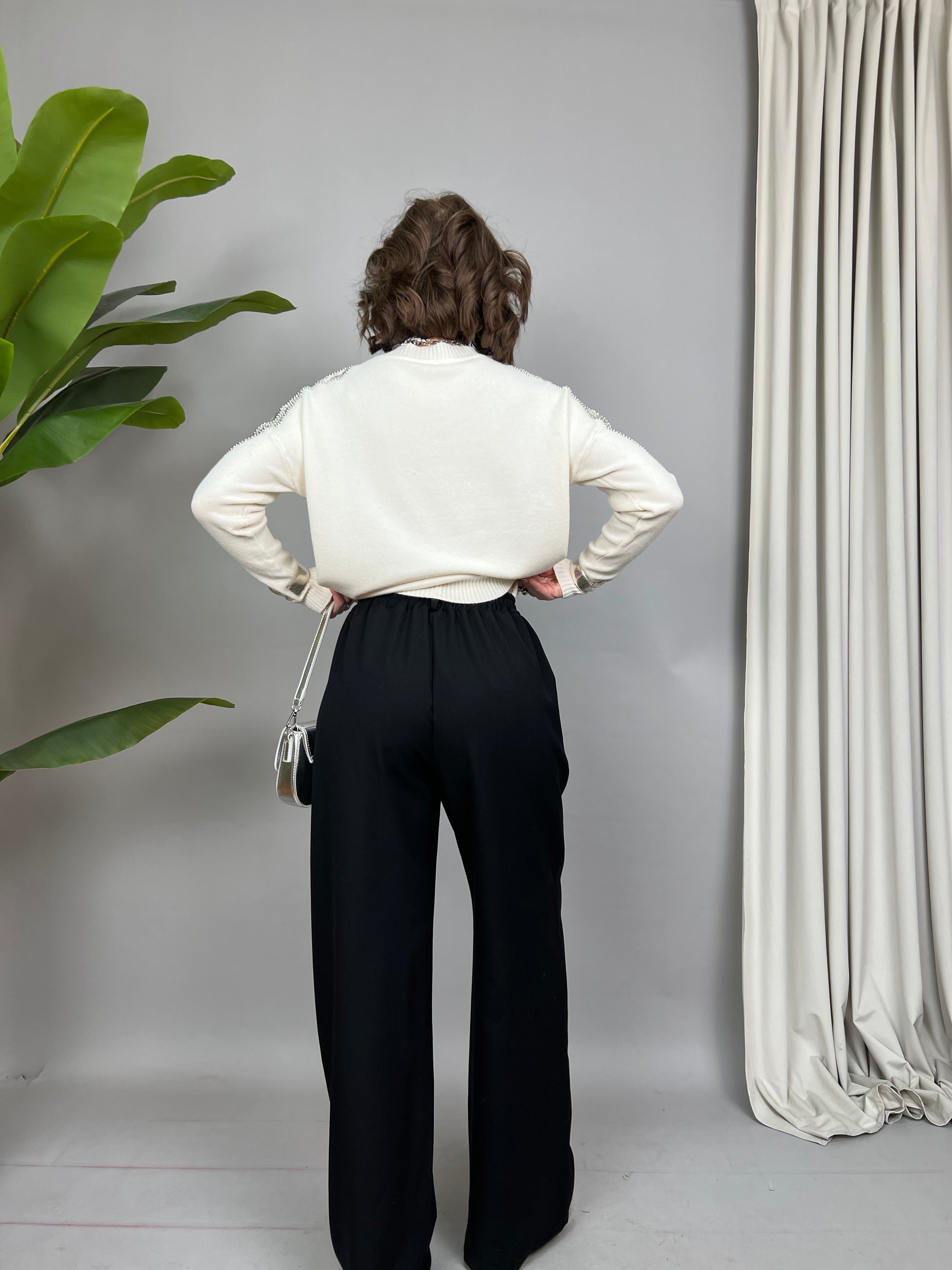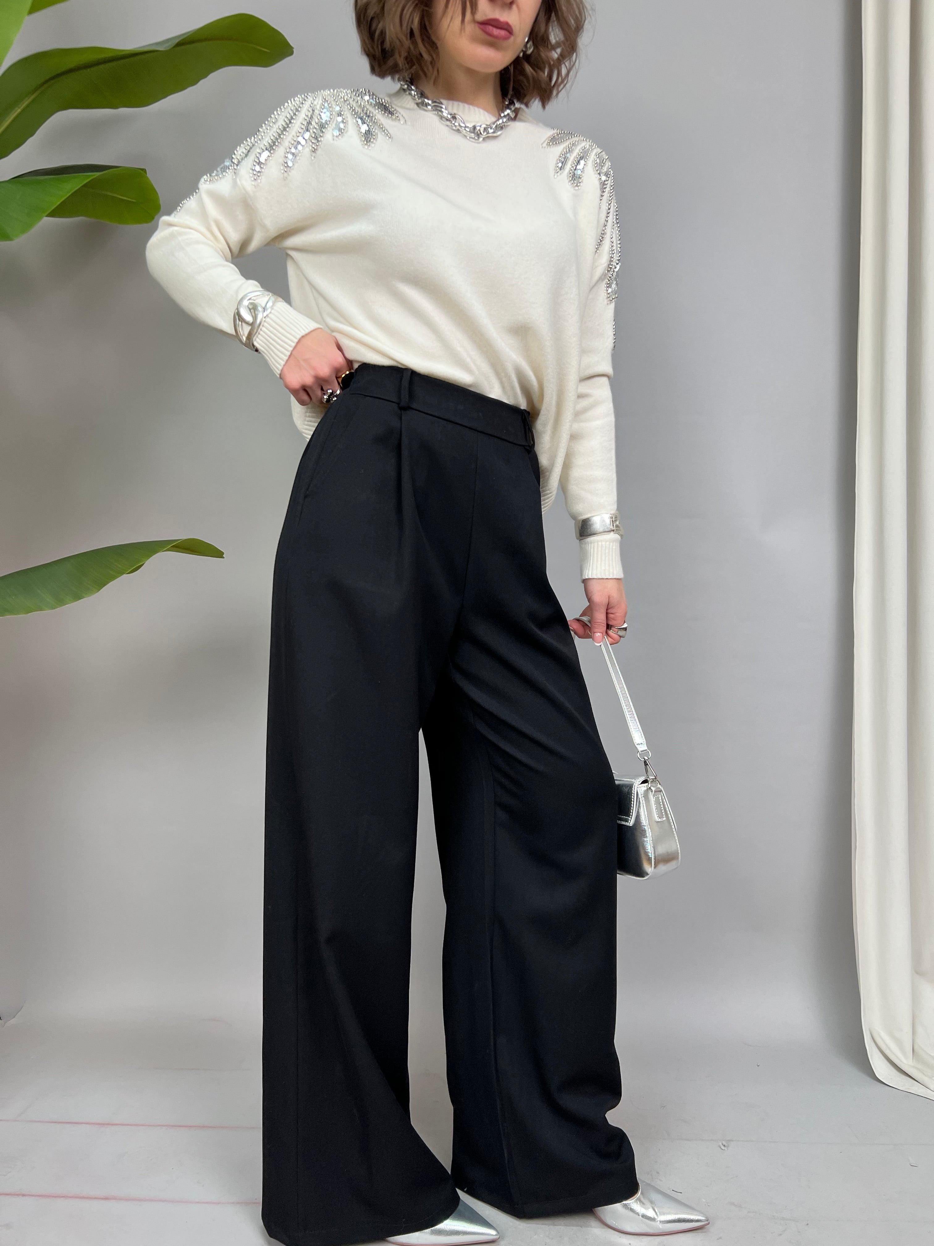 Pantalone a palazzo con pinces frontali ed elastico sul retro. Sono presenti delle tasche laterali.