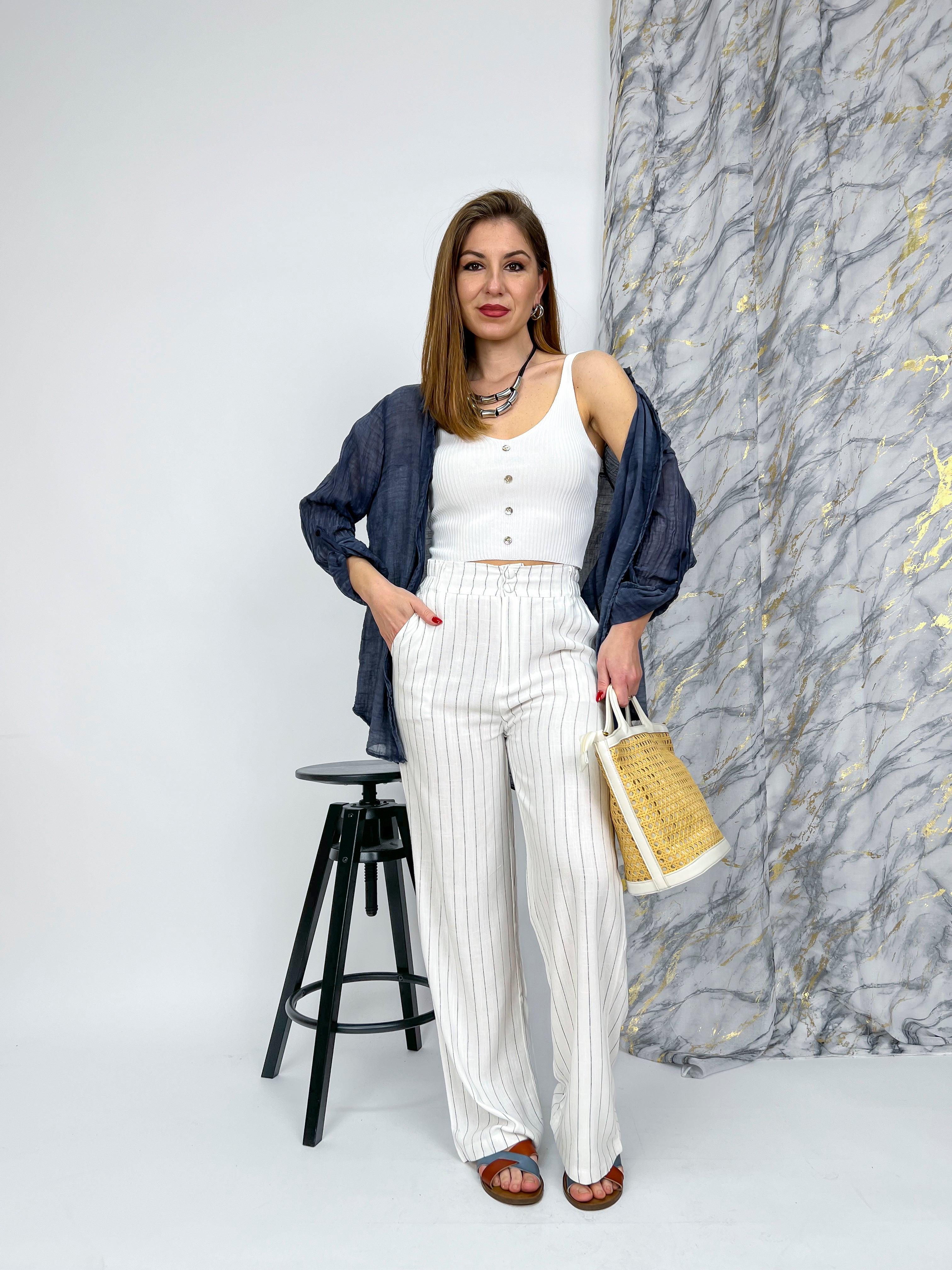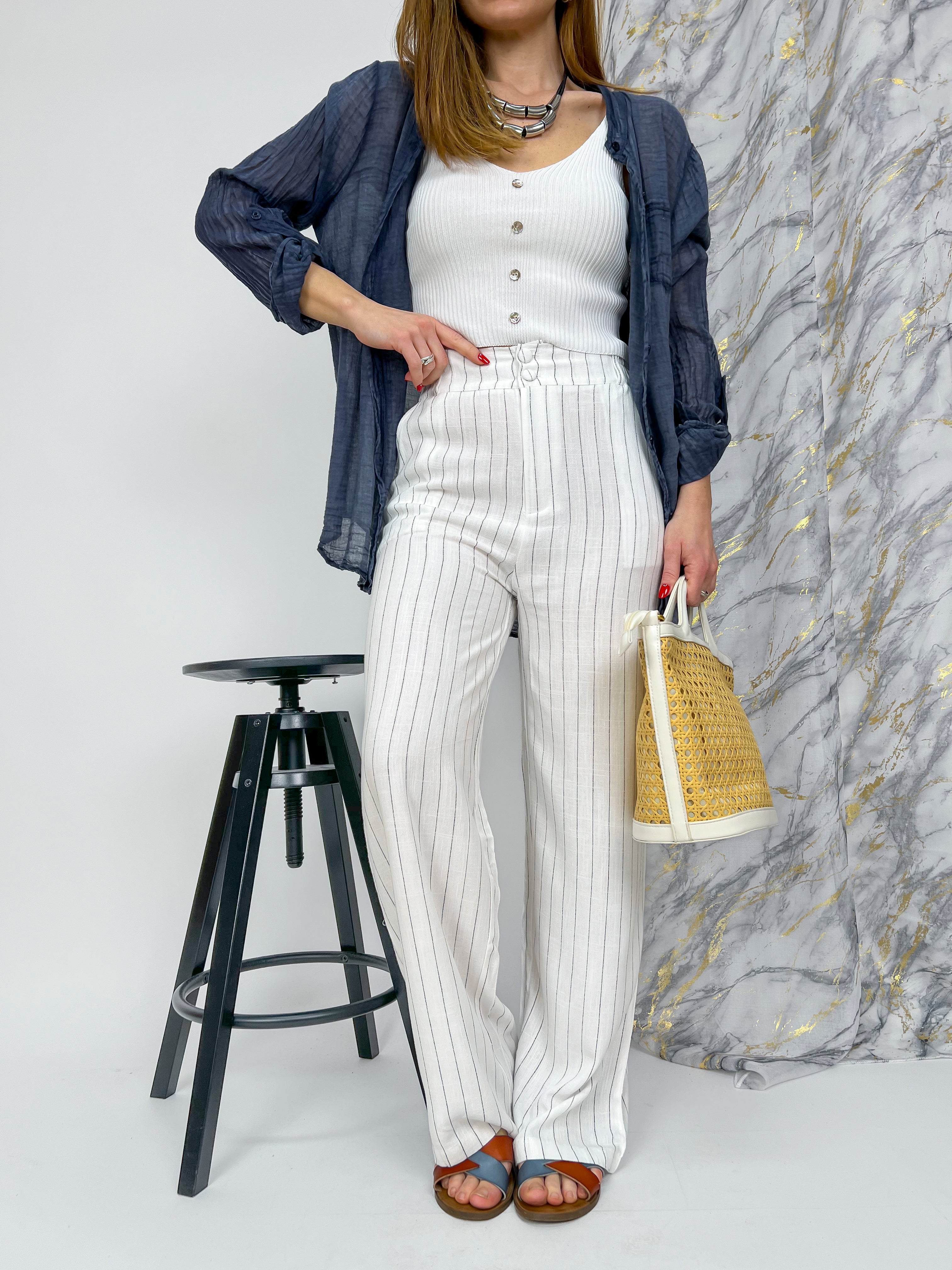 Pantalone palazzo gessato con elastico sul retro.