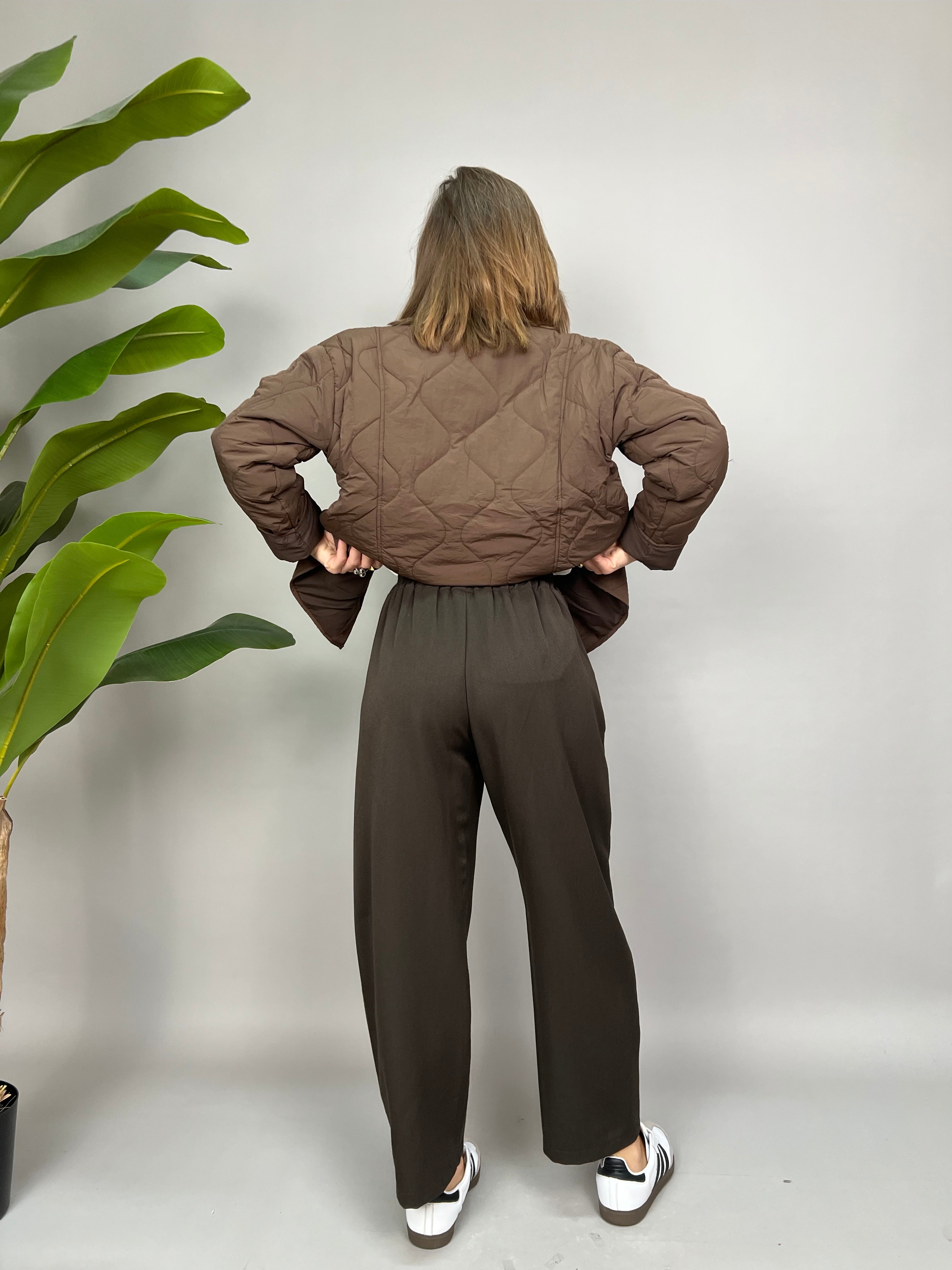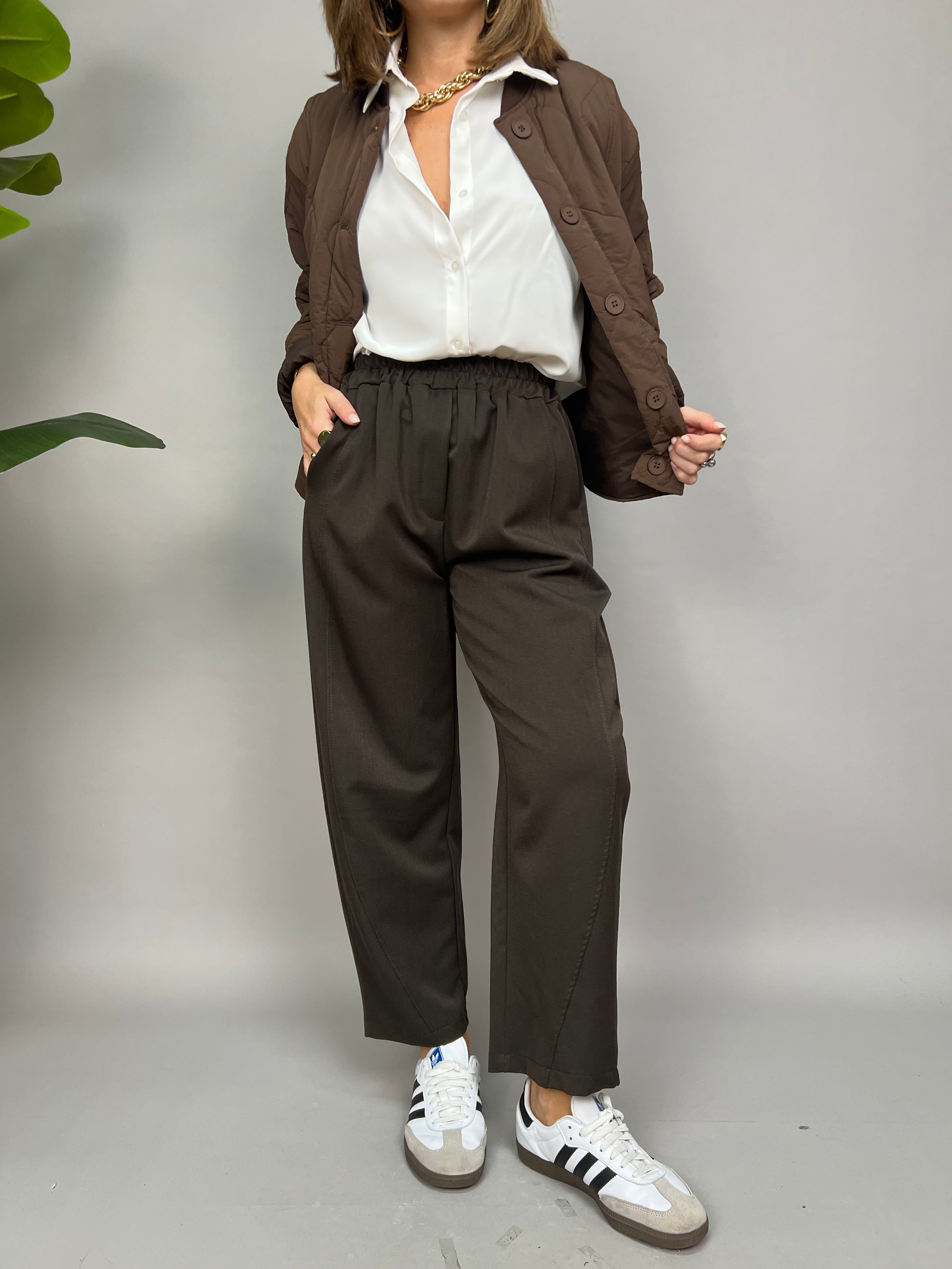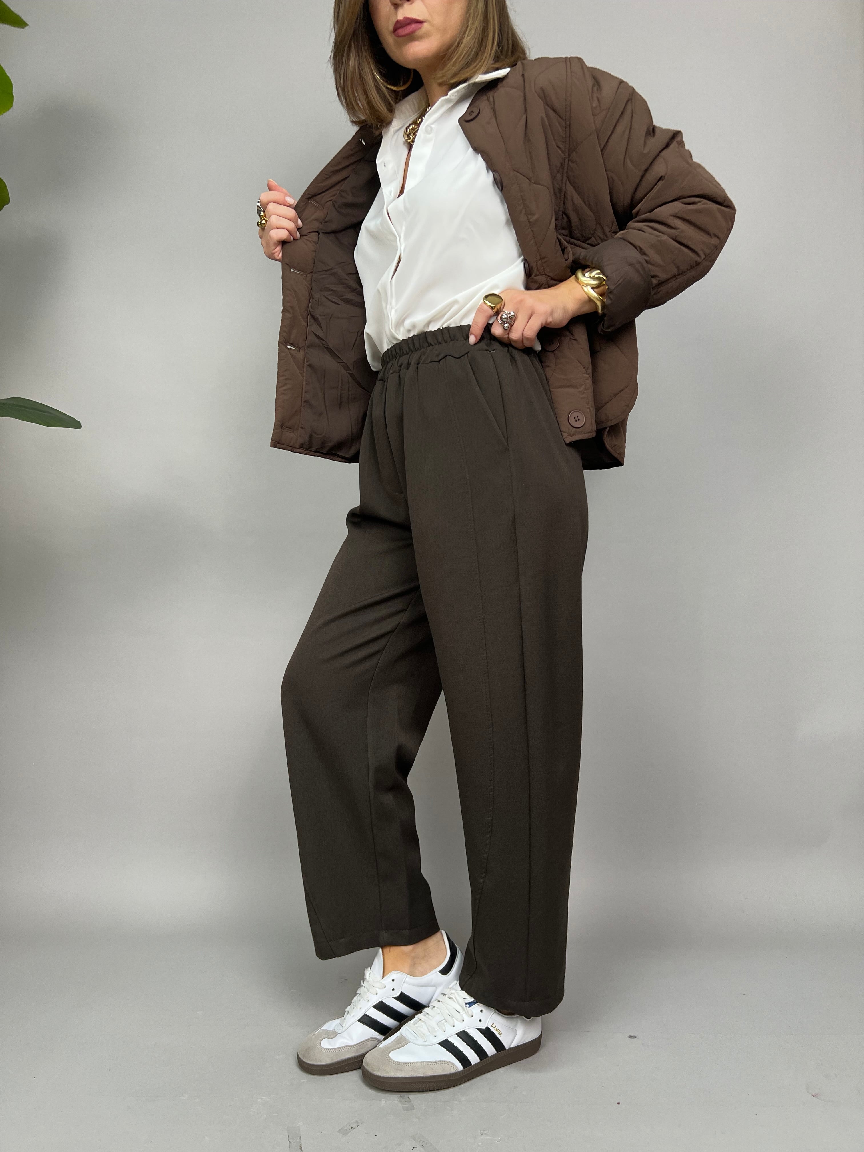 Pantalone comodo con elastico in vita e lunghezza fino alle caviglie. Sono presenti due tasche laterali