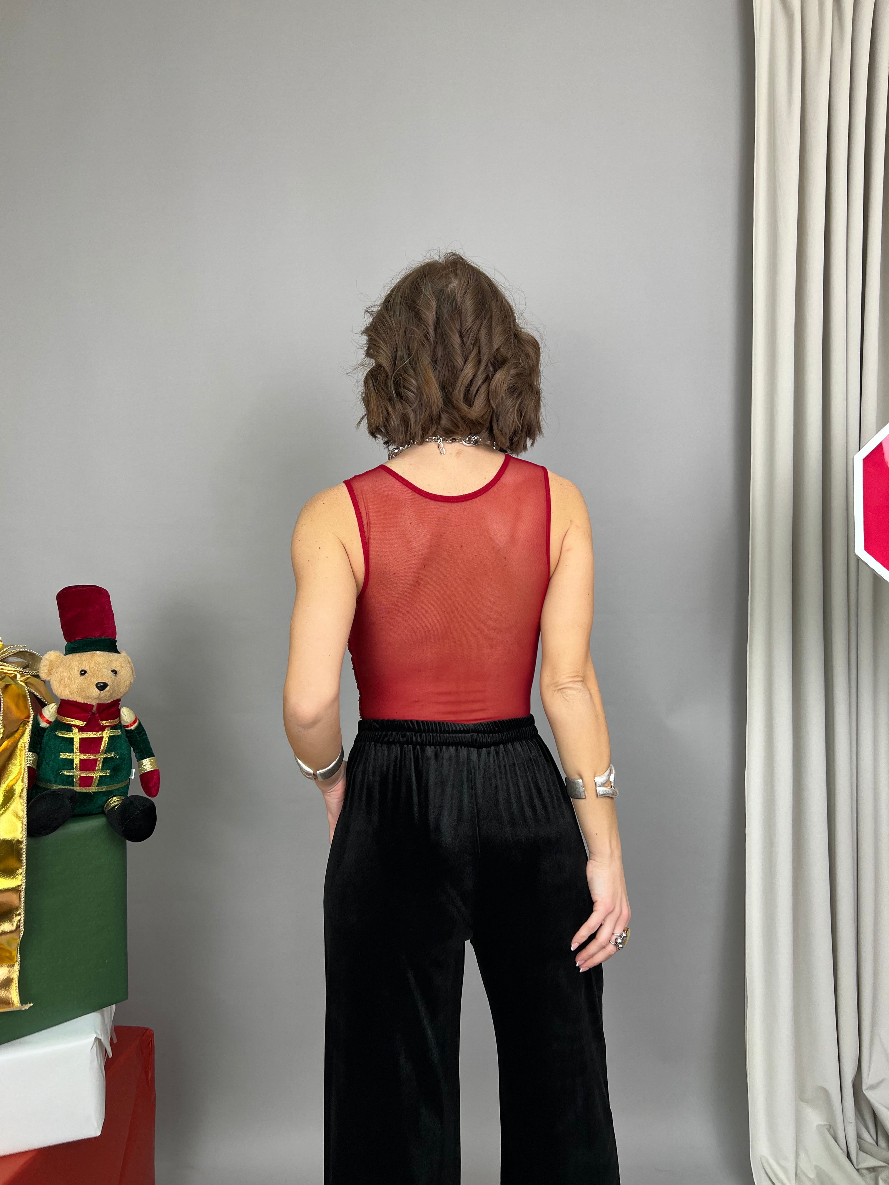 Body con top in tulle trasparente, la parte frontale del busto ha una lavorazione in paillettes tono su tono. La parte inferiore è in tessuto elasticizzato e presenta una chiusura con gancetti. Rimane trasparente sul retro e le coppe sono incorporate.
