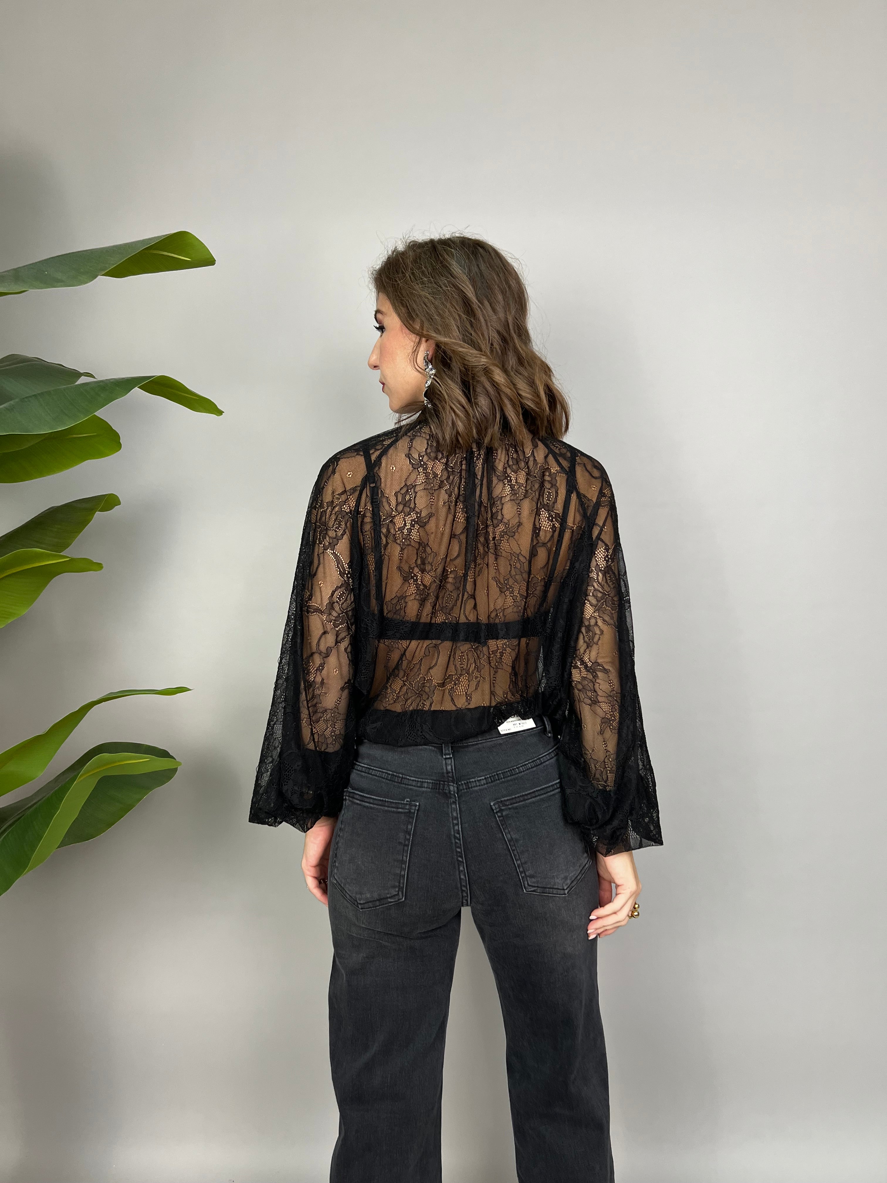 Blusa interamente in pizzo dalla vestibilità comoda. E' presente un fiocco sul collo e le maniche sono a palloncino
