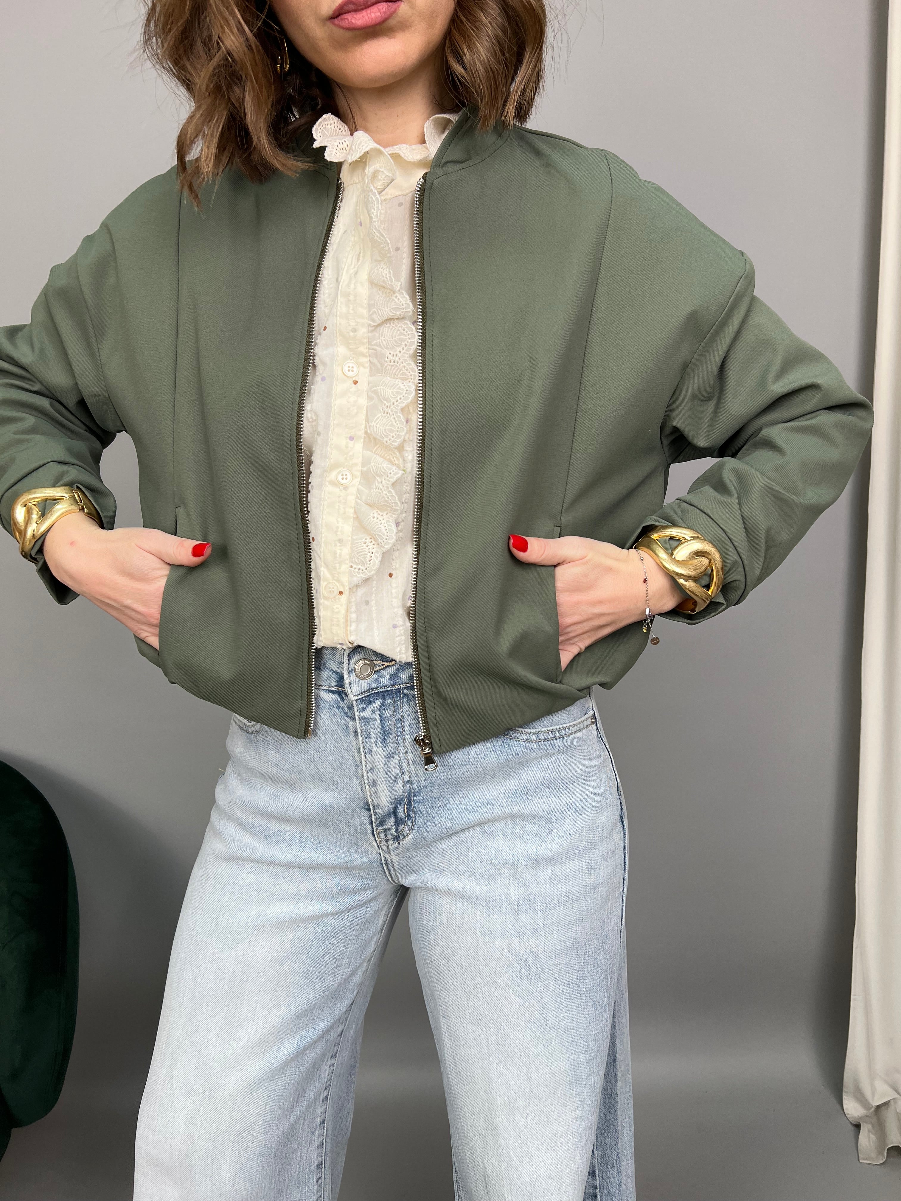 Bomberino con arricciatura elastica sul fondo, per un effetto a palloncino. Un modello con chiusura frontale a zip, tasche laterali inserite e fodera interna. La vestibilità è comoda. dal taglio sportivo.