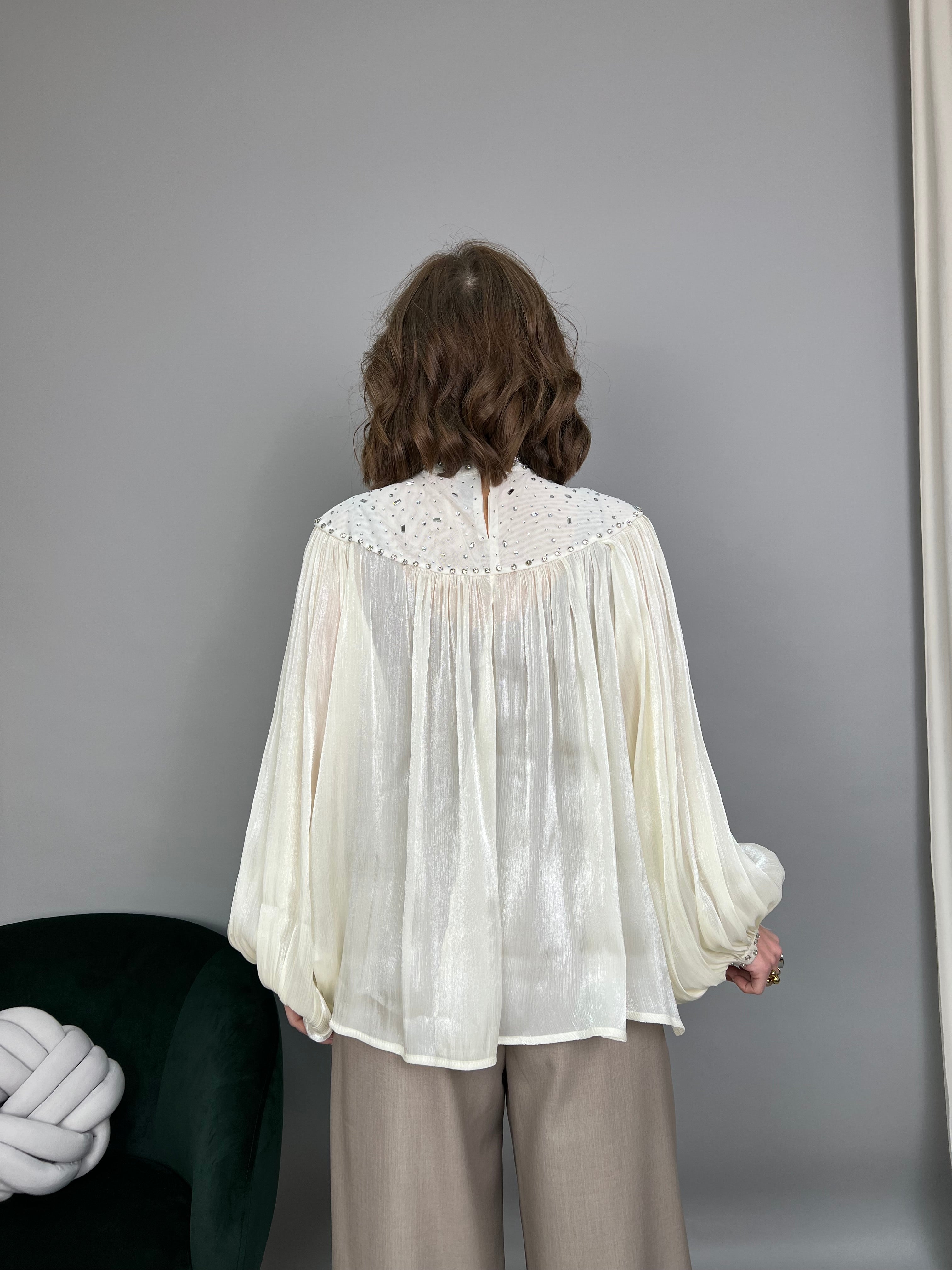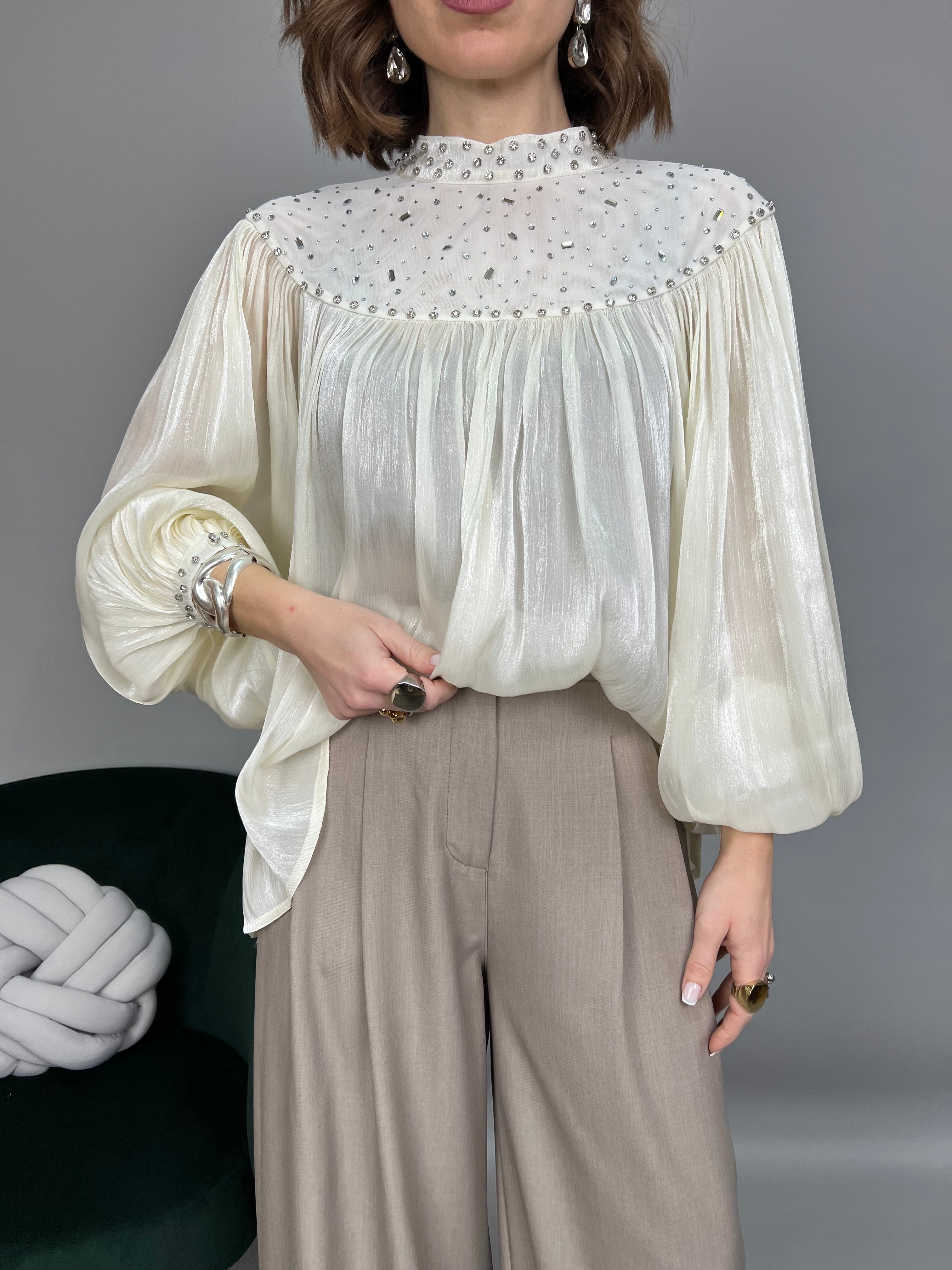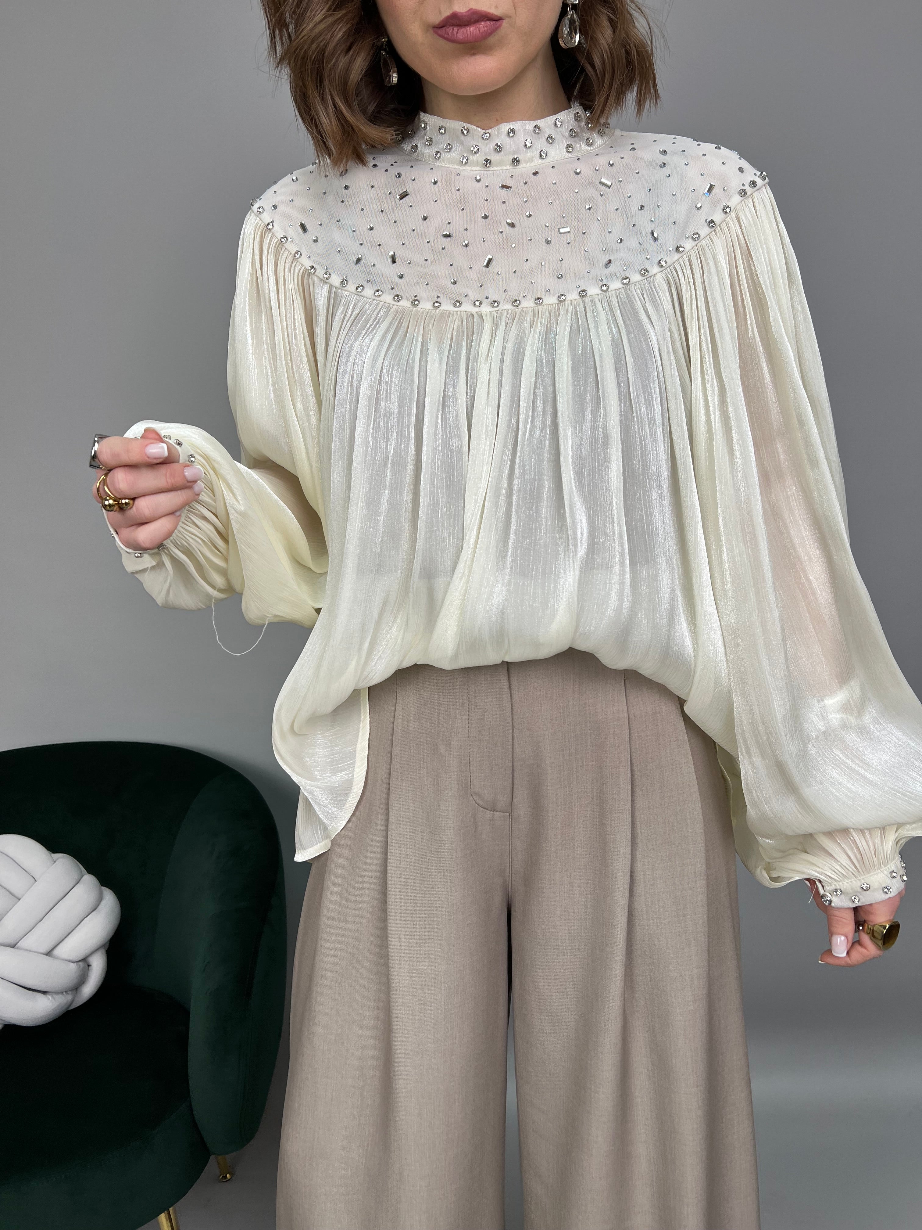 Camicetta in tessuto semitrasparente con effetto lucido e brillante. Collo tondo accollato, impreziosito da un inserto decorato da brillantini e chiusura con bottoncino sul retro. Presenta maniche ampie con arricciatura e polsini rifiniti con applicazioni di brillantini. La vestibilità è molto comoda.