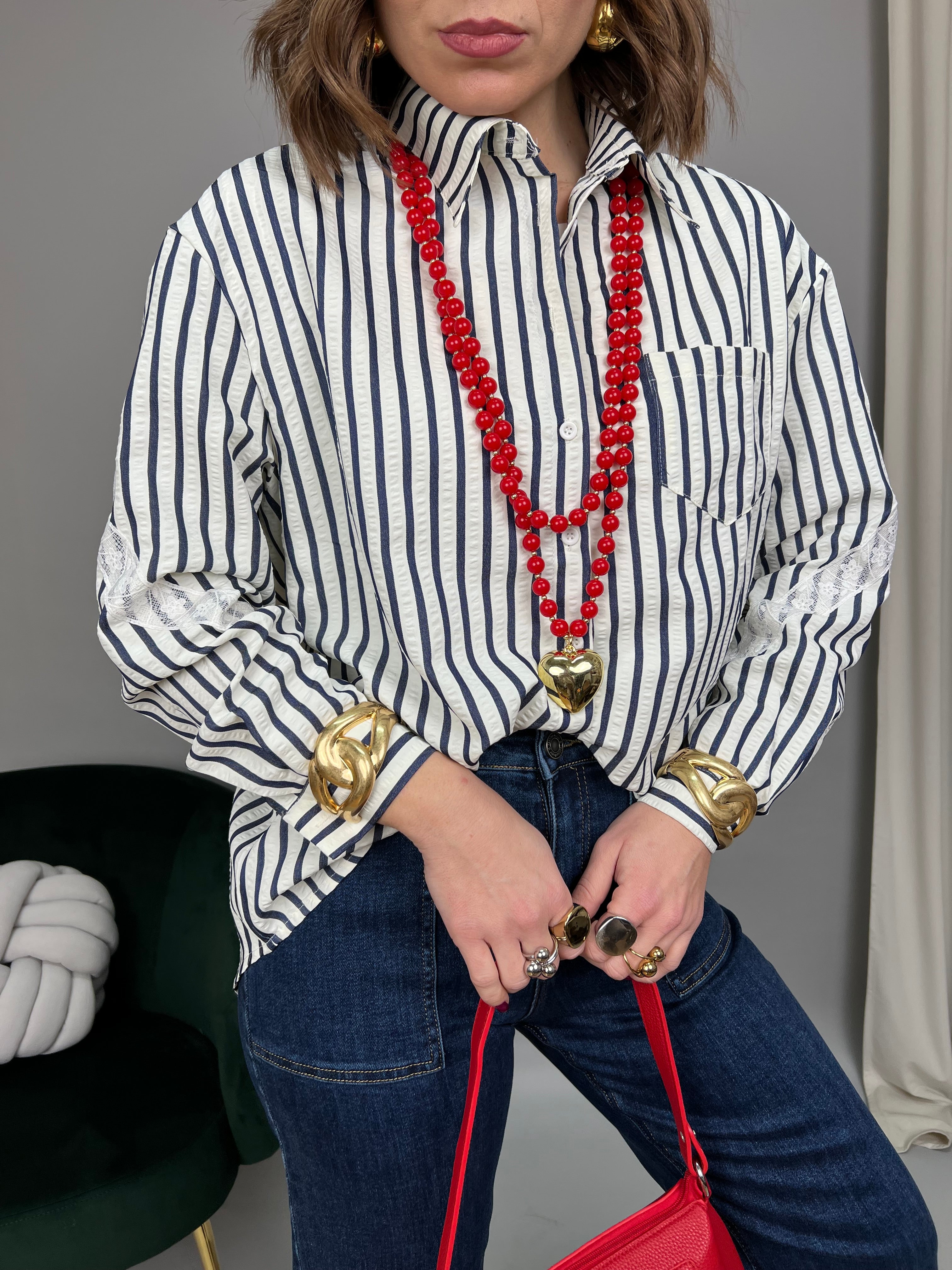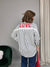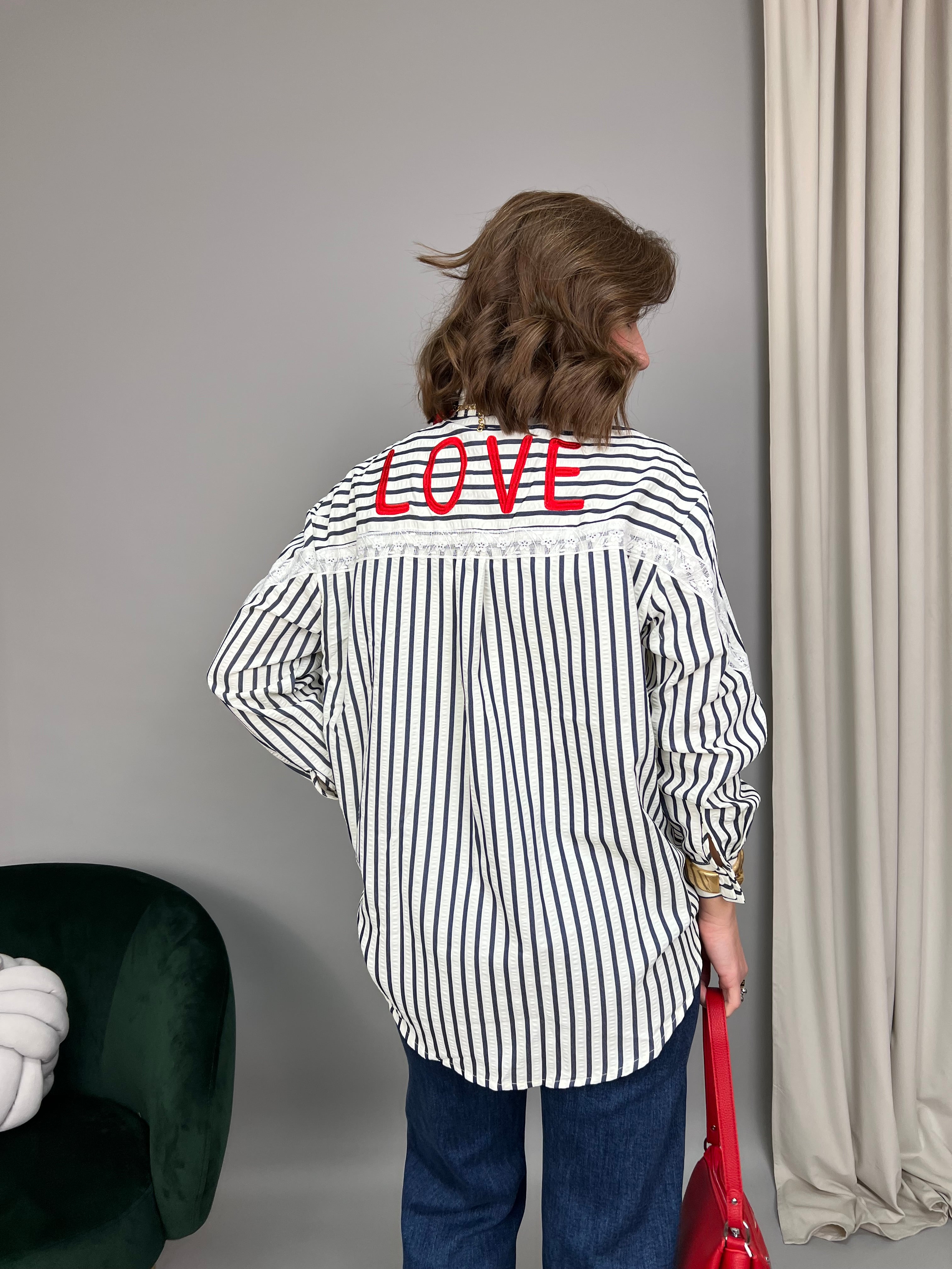 Camicia in cotone a righe verticali, con lunghezza più accentuata sul retro. Il modello è caratterizzato da una scritta ricamata sul retro delle spalle. La vestibilità è comoda.