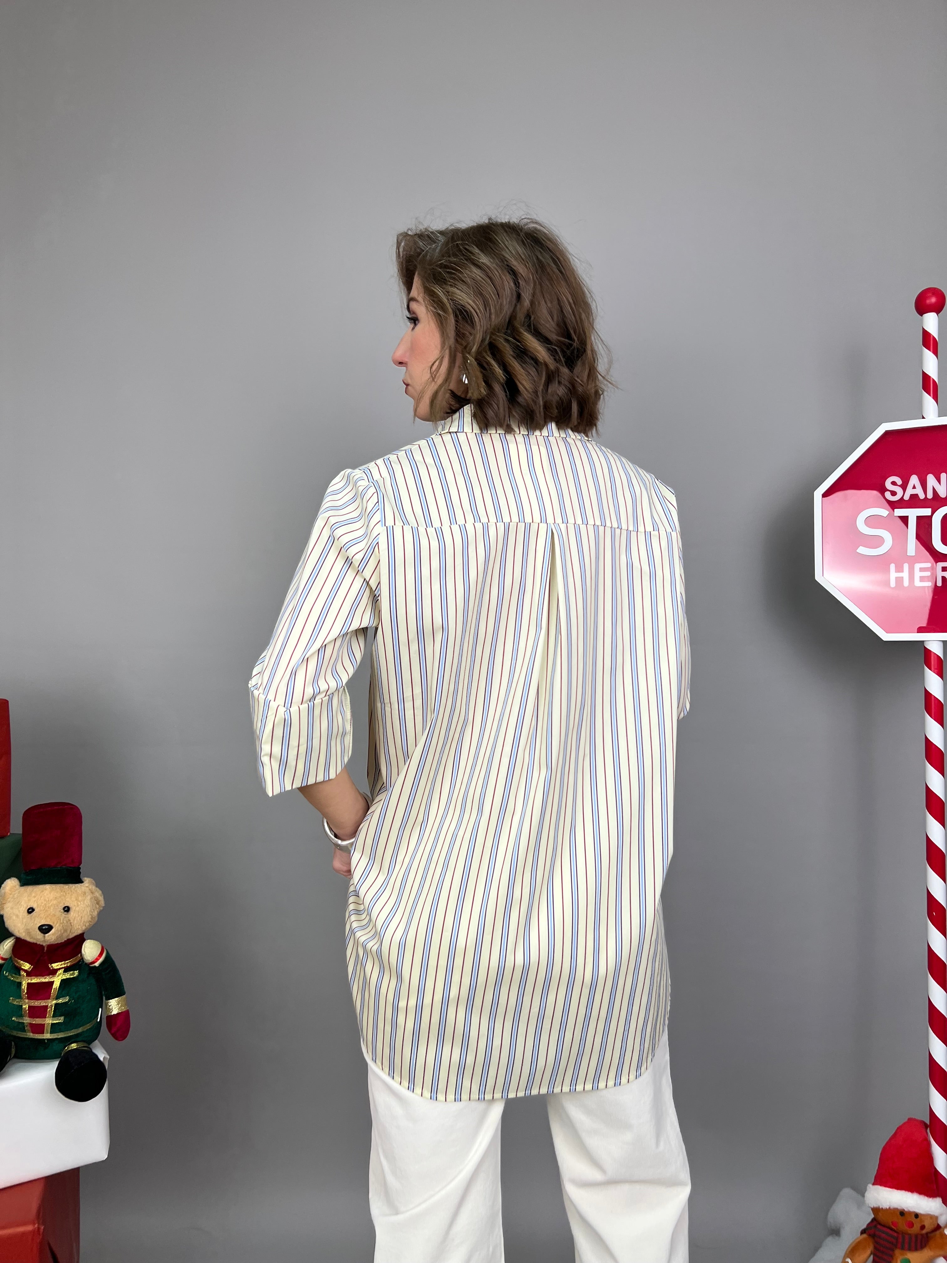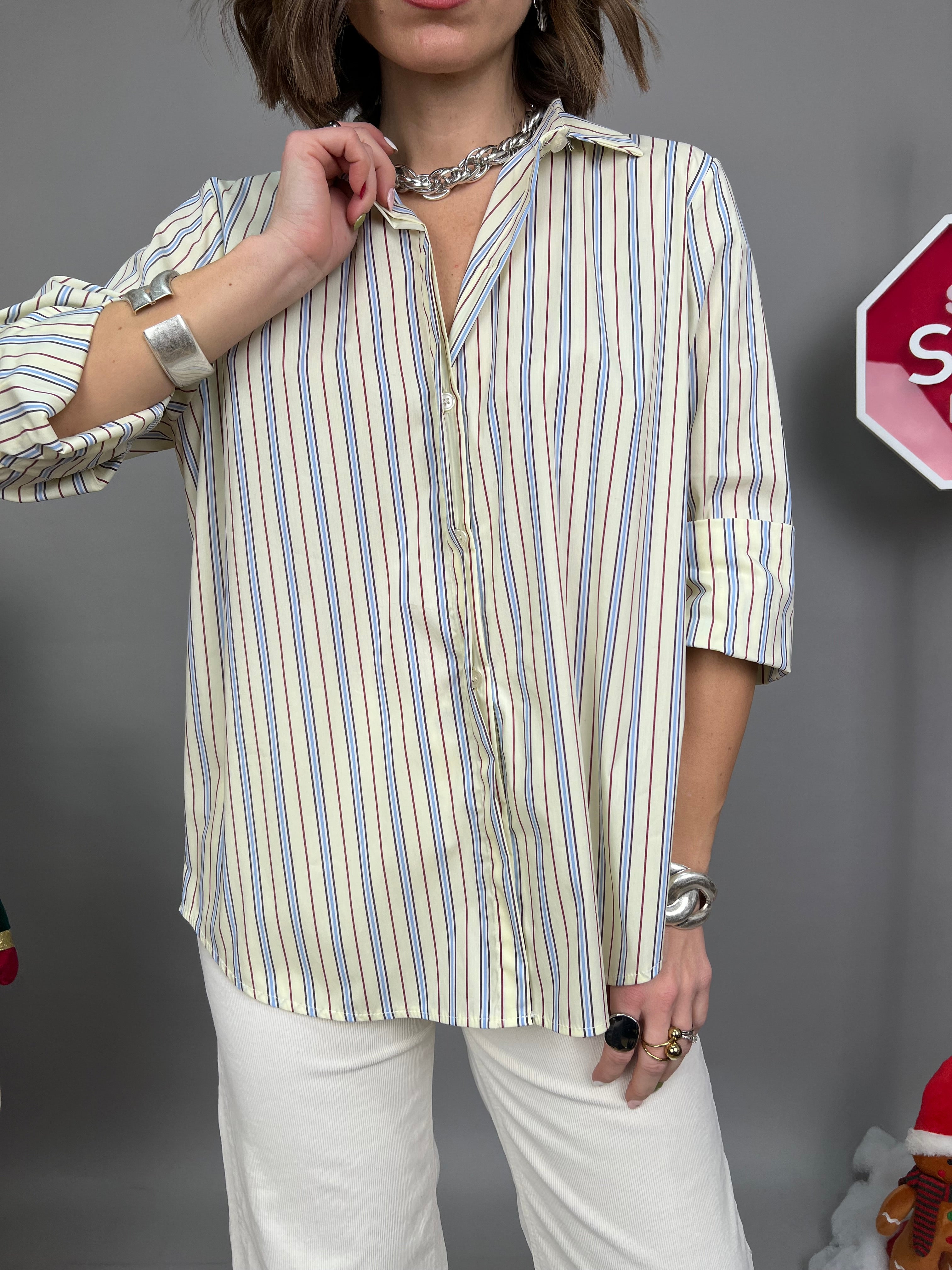 Camicia dalla vestibilità comoda e lunghezza più accentuata sul retro. Il modello presenta una fantasia a righe verticali a contrasto.