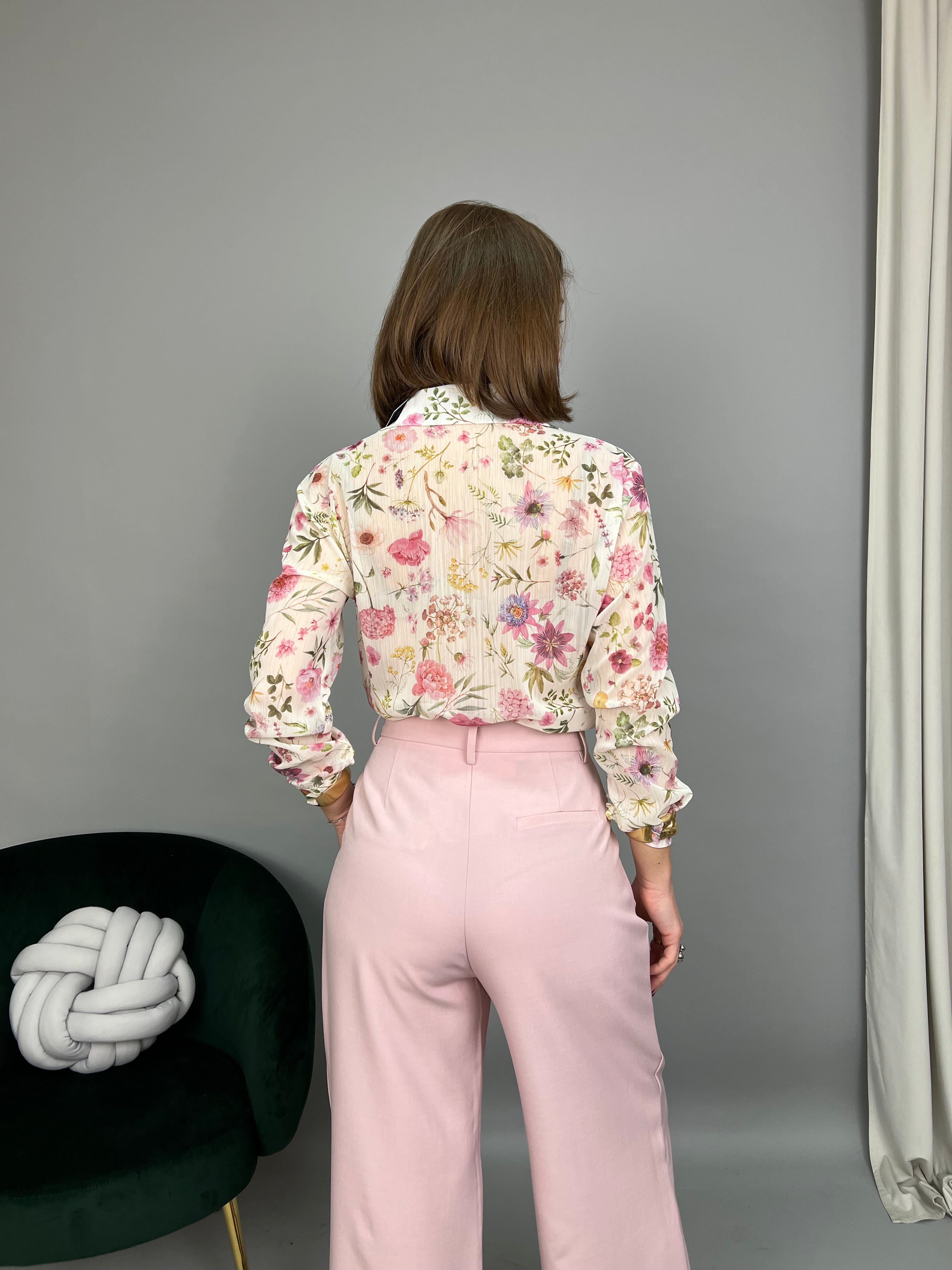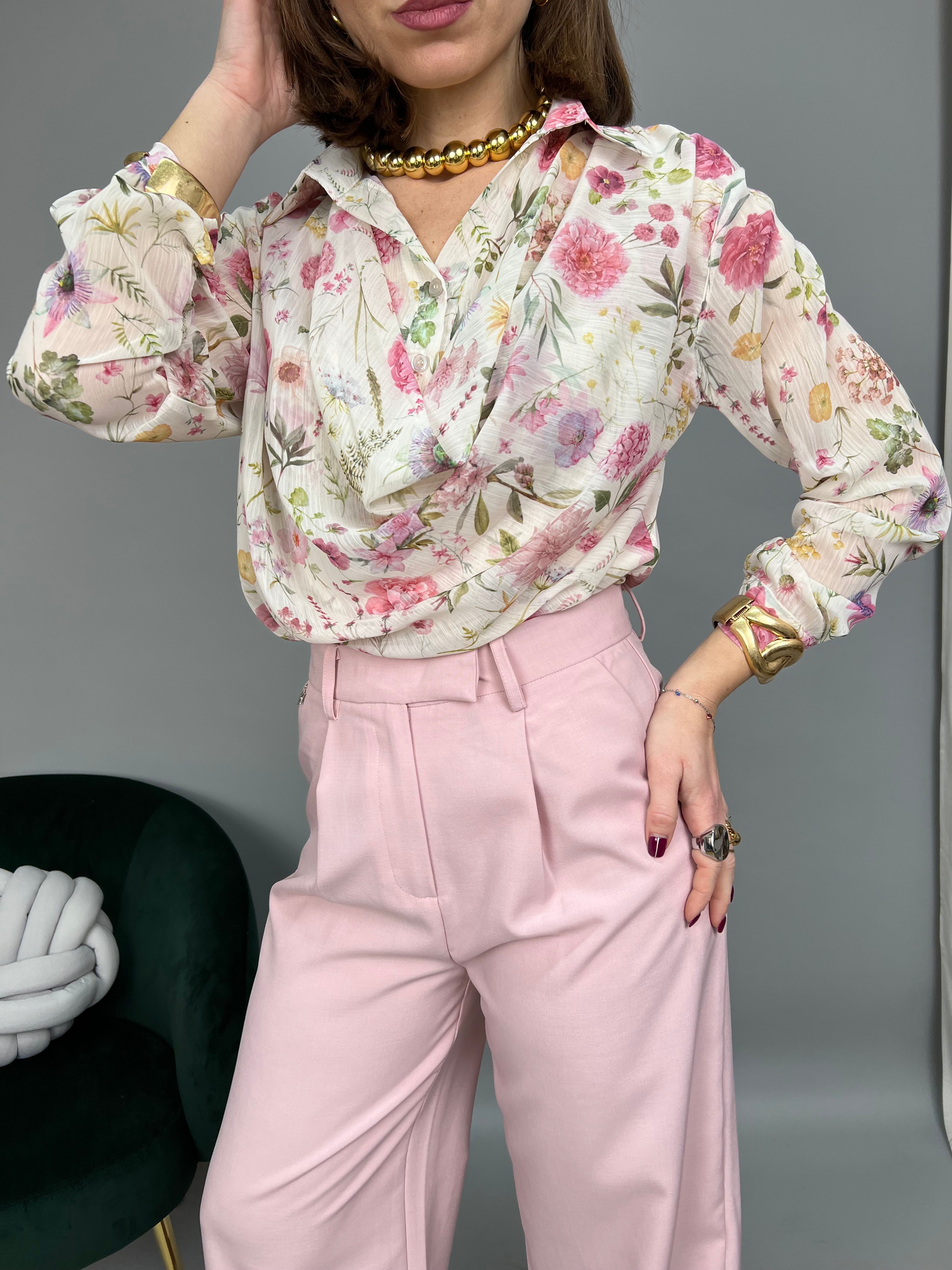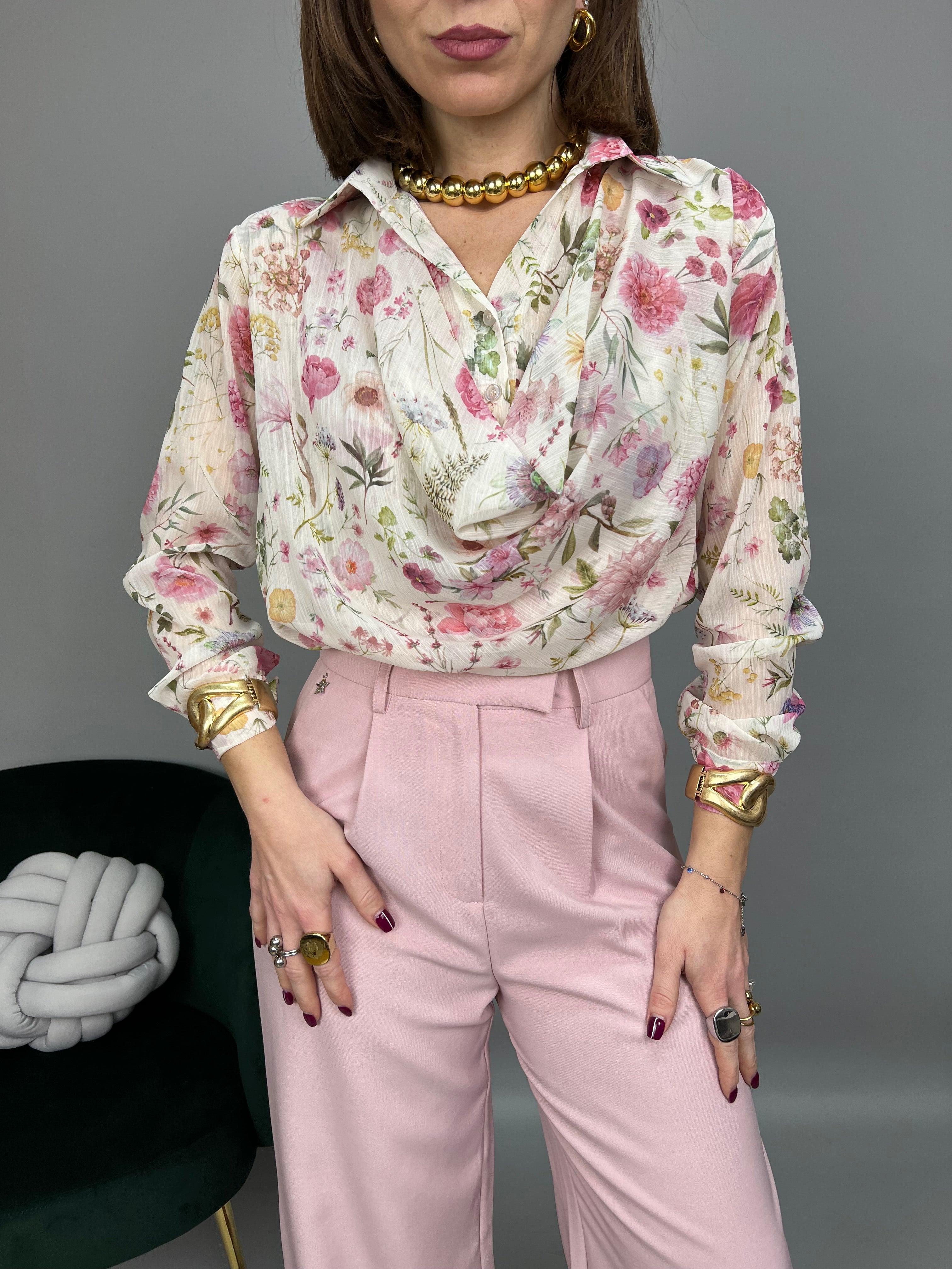 Camicia in chiffon dalla fantasia a fiori. Il modello è caratterizzato da un chiusura a bottoni sullo scollo con il dettaglio morbido "effetto blusa" sul davanti. La vestibilità è regolare.
