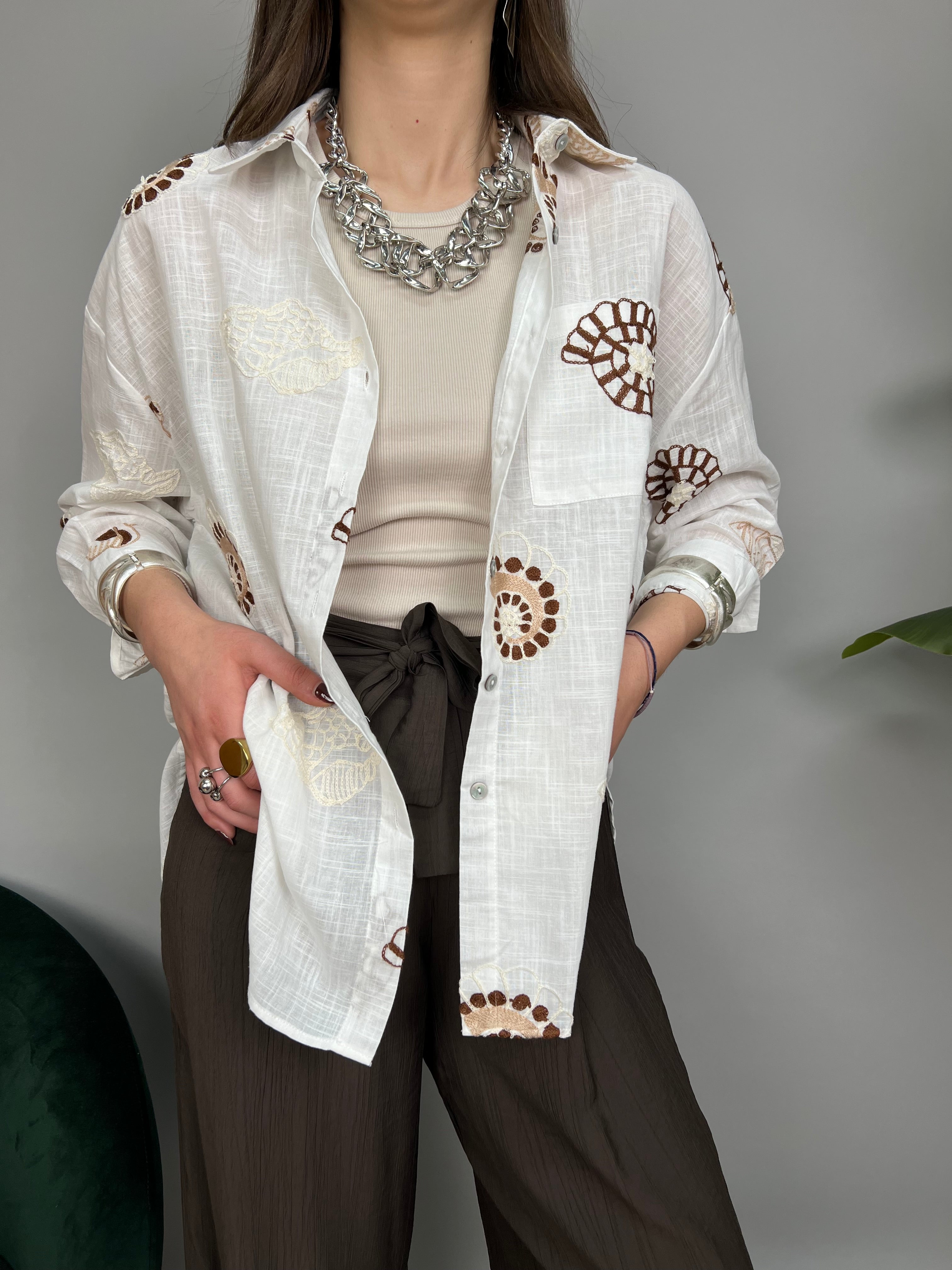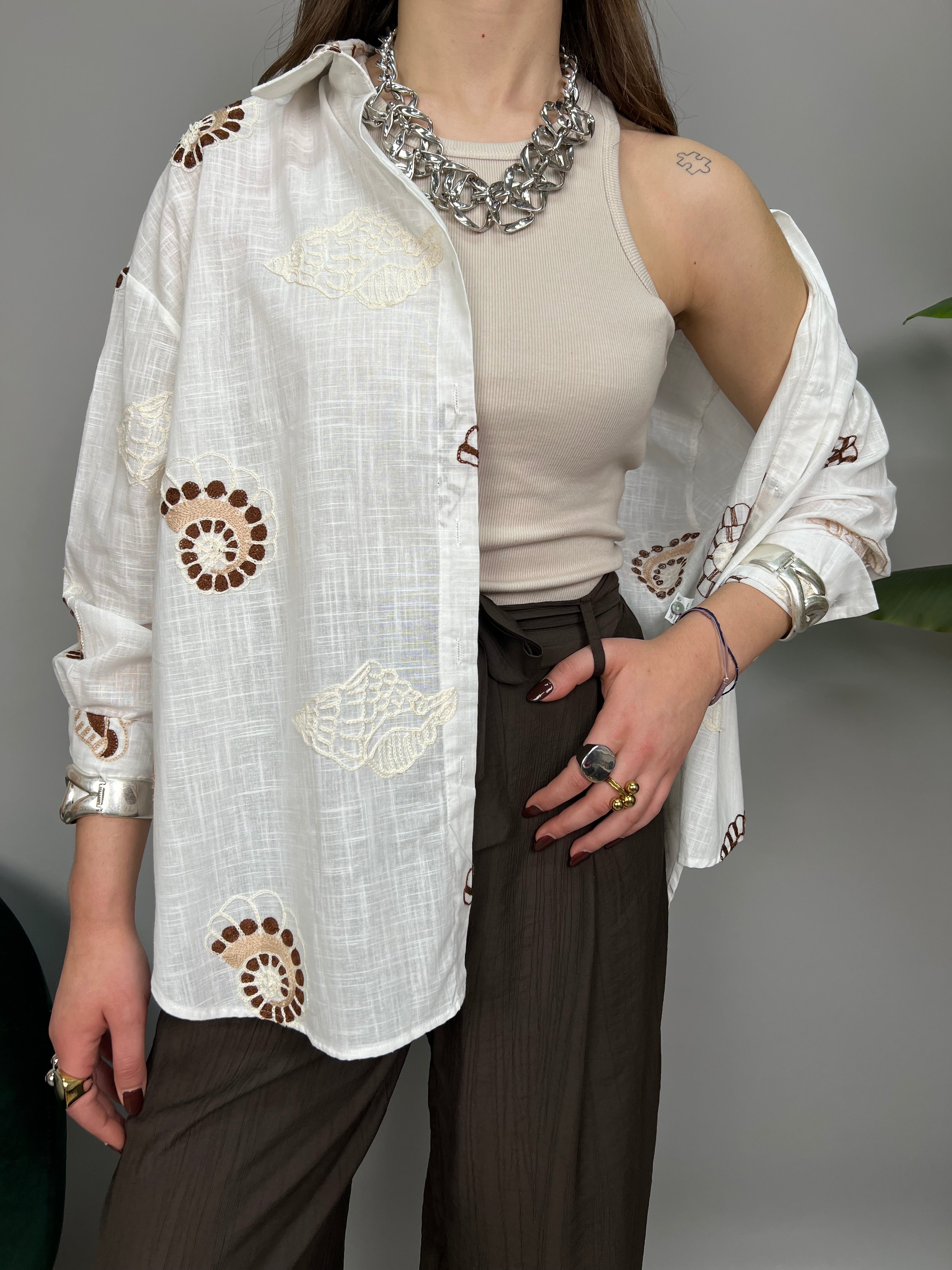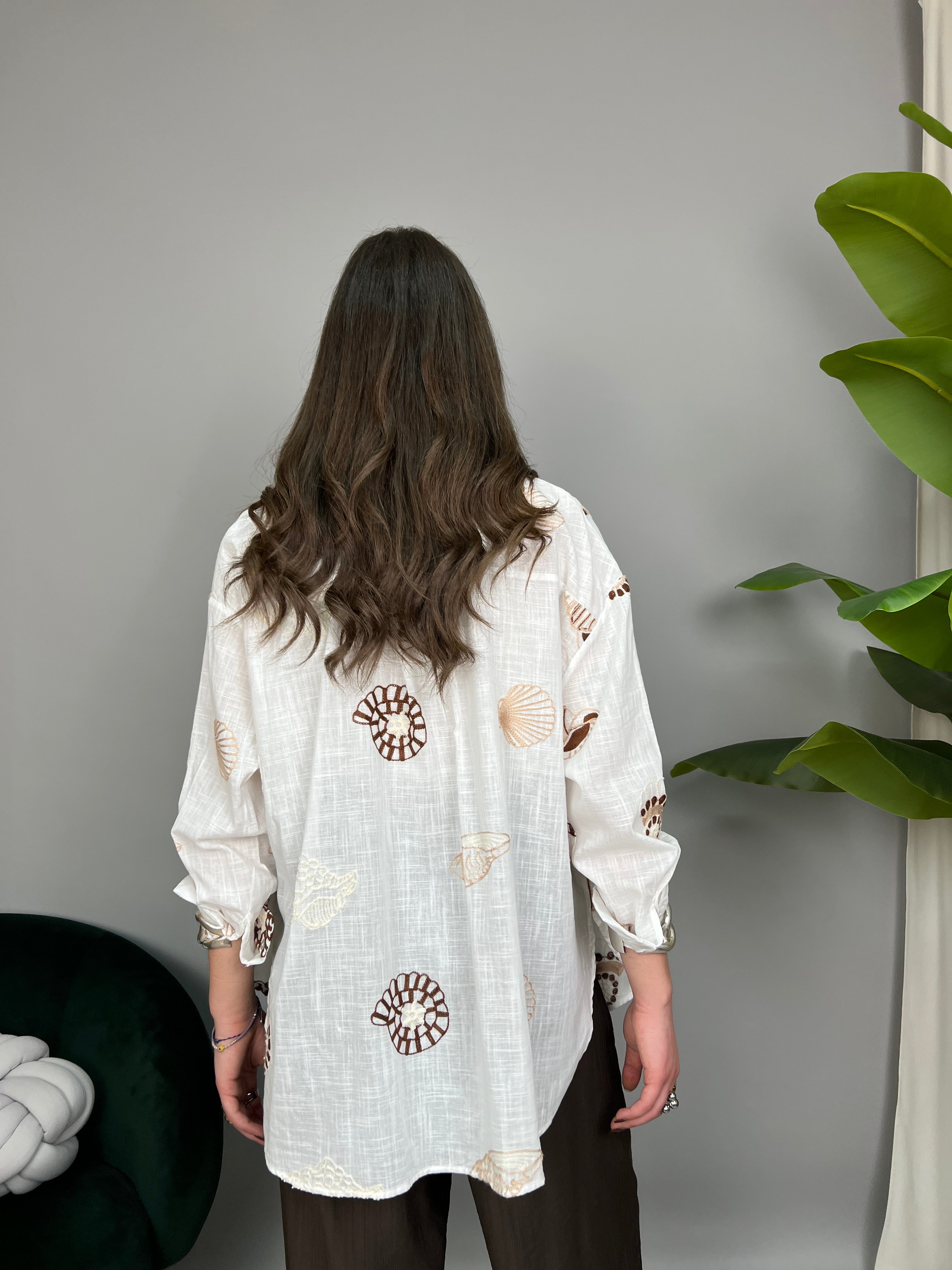 Camicia in cotone, un taglio classico leggermente over, con colletto e chiusura a bottoncini frontale. Impreziosita da ricami marini a contrasto su tutto il modello. Presenta un taschino frontale e spacchetti laterali. La vestibilità è comoda.