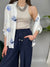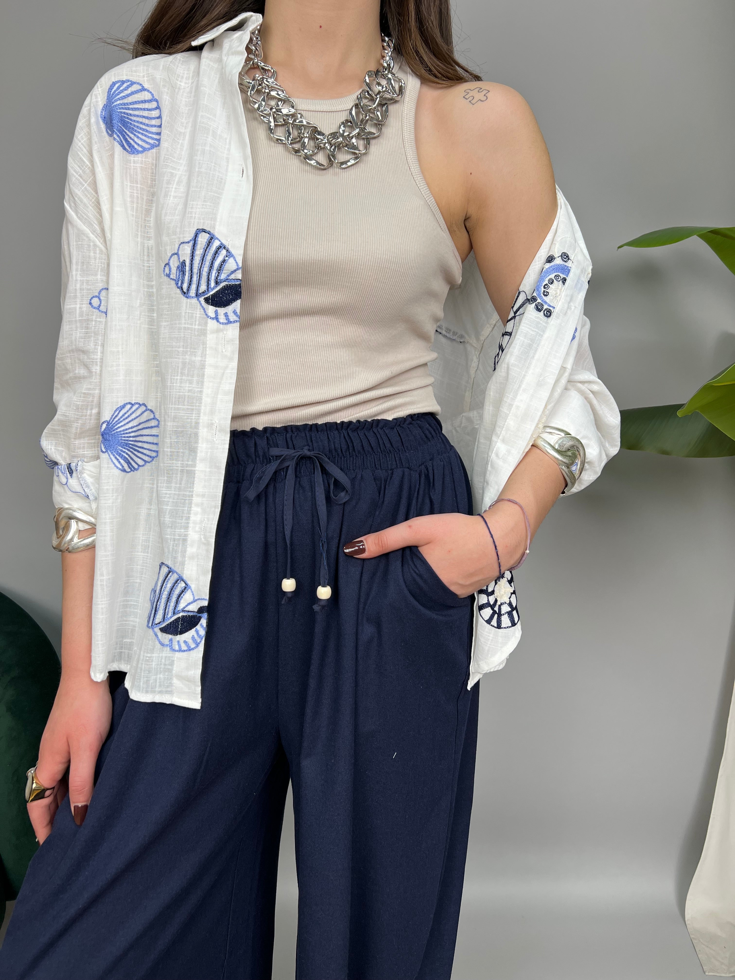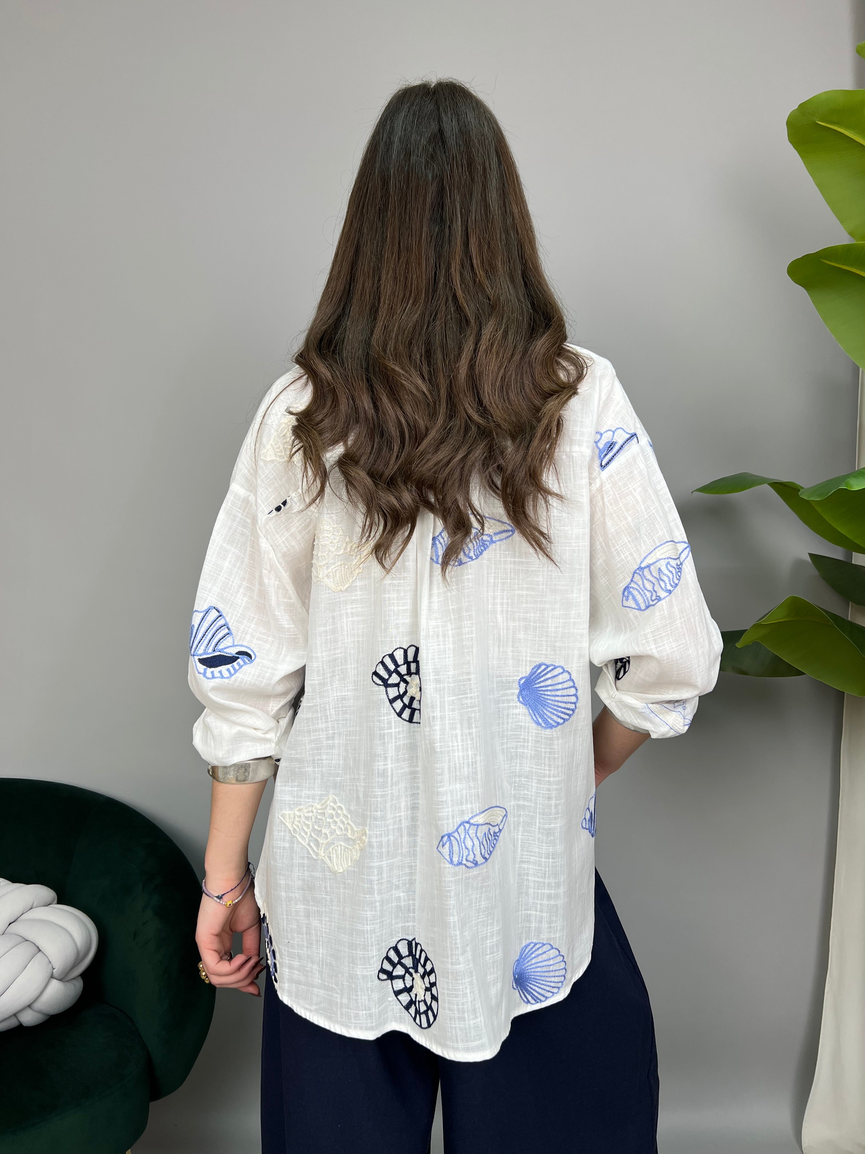 Camicia in cotone, un taglio classico leggermente over, con colletto e chiusura a bottoncini frontale. Impreziosita da ricami marini a contrasto su tutto il modello. Presenta un taschino frontale e spacchetti laterali. La vestibilità è comoda.