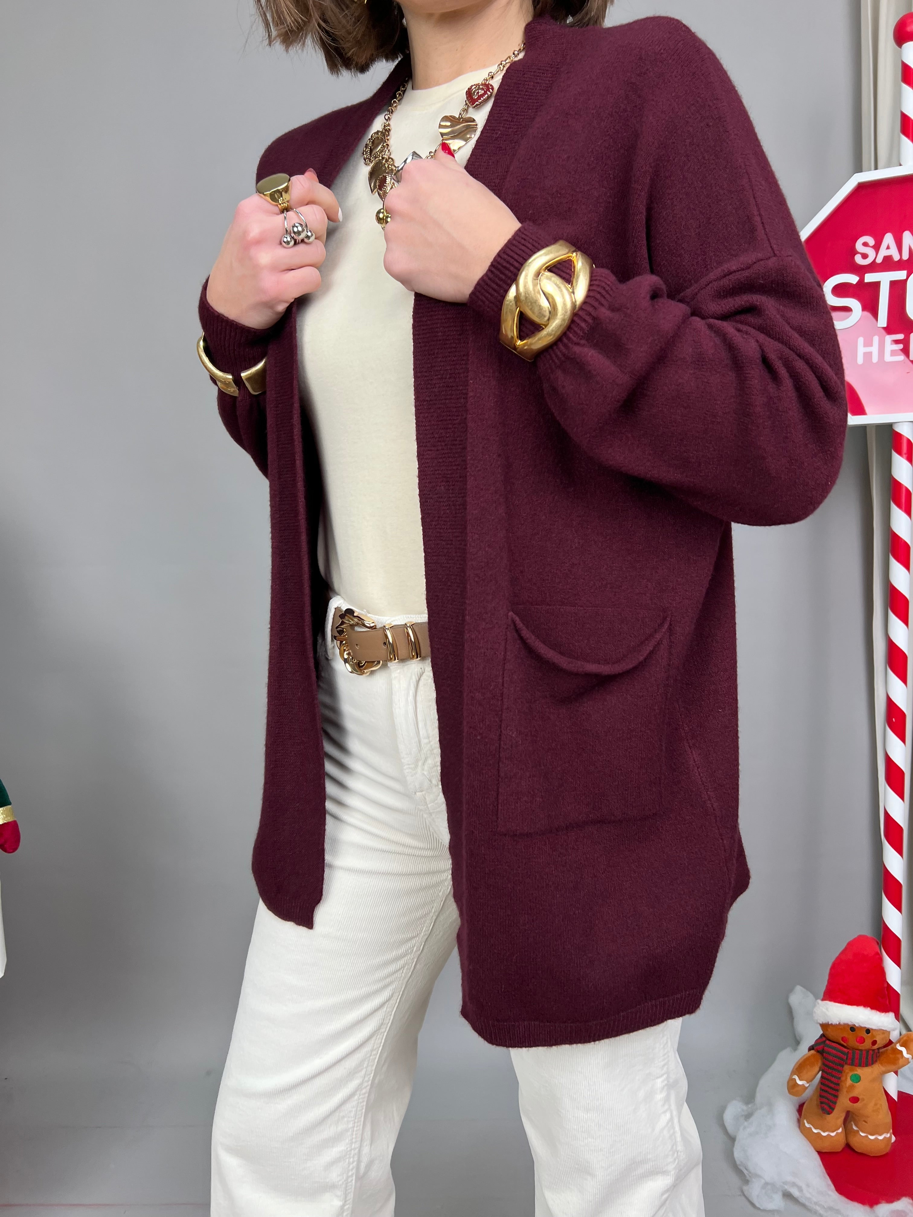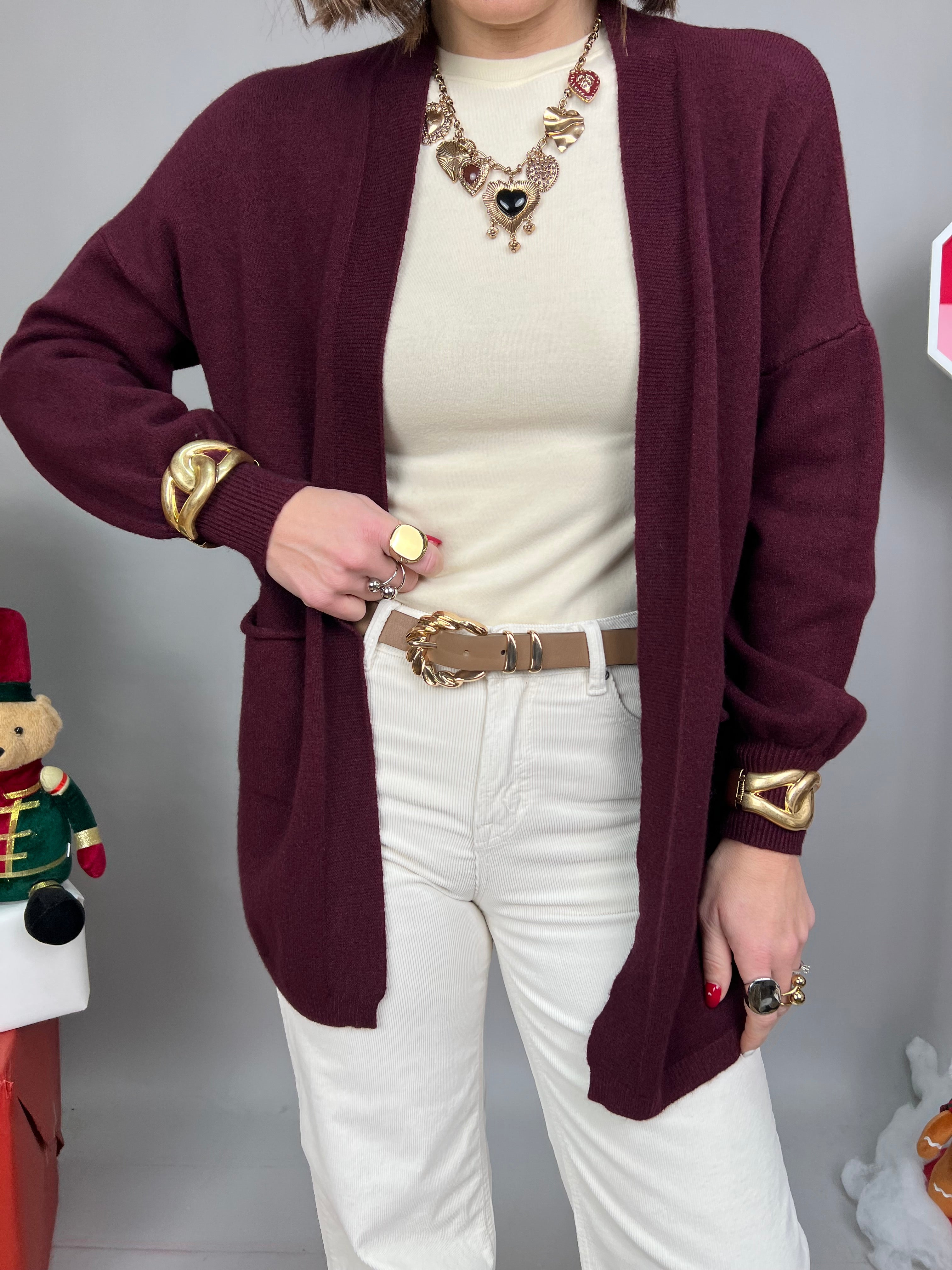 Cardigan aperto dal taglio over, lunghezza media e maniche a palloncino. Il modello presenta due tasche frontali. La vestibilità è molto comoda e il tessuto è una maglia morbida.