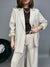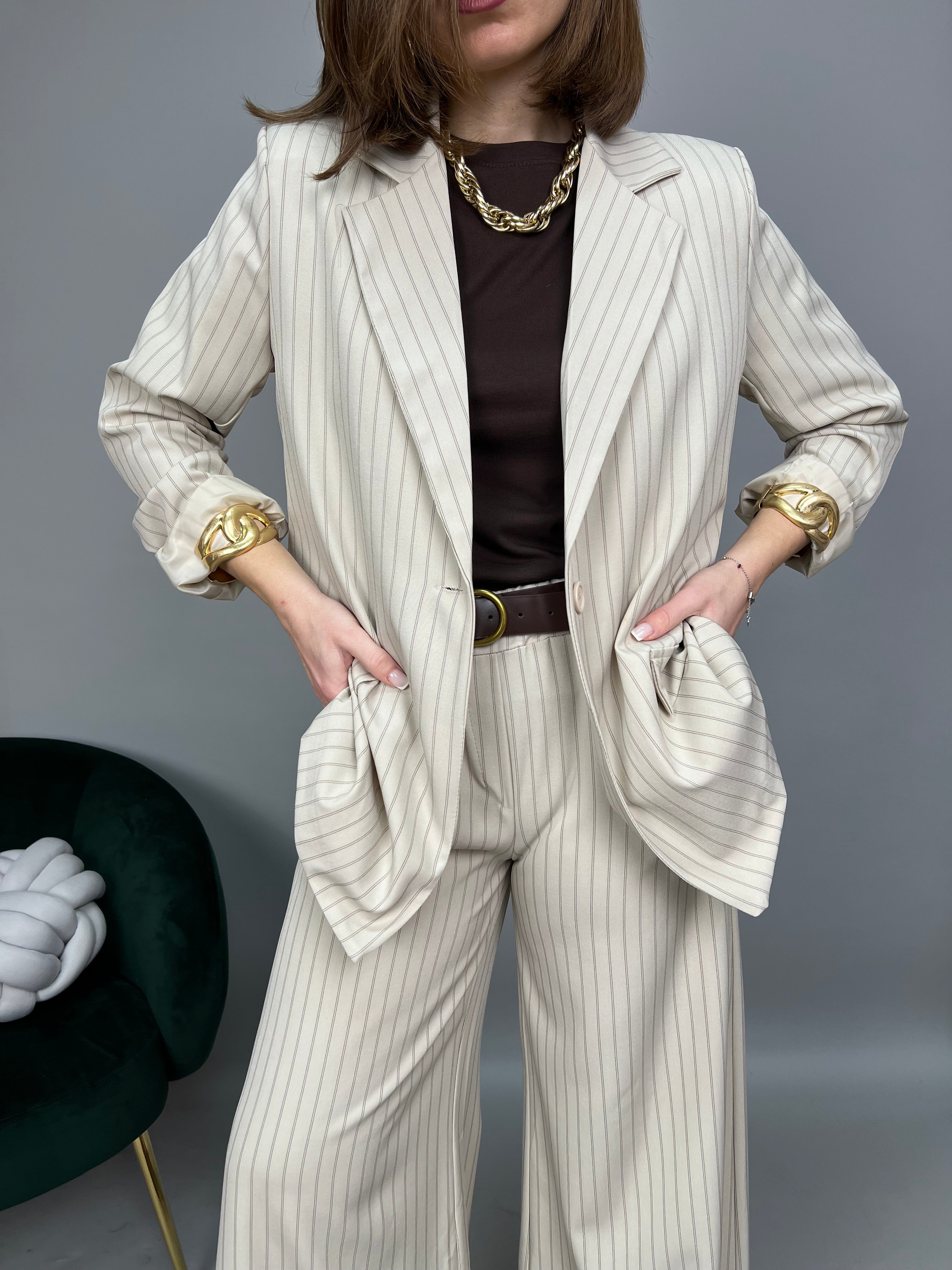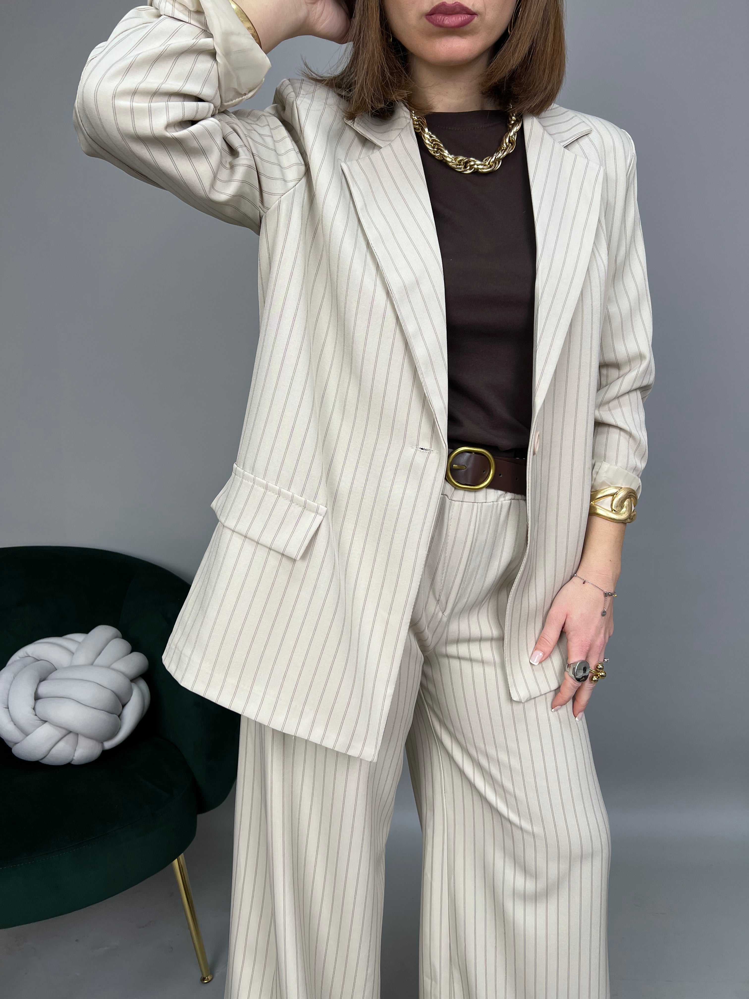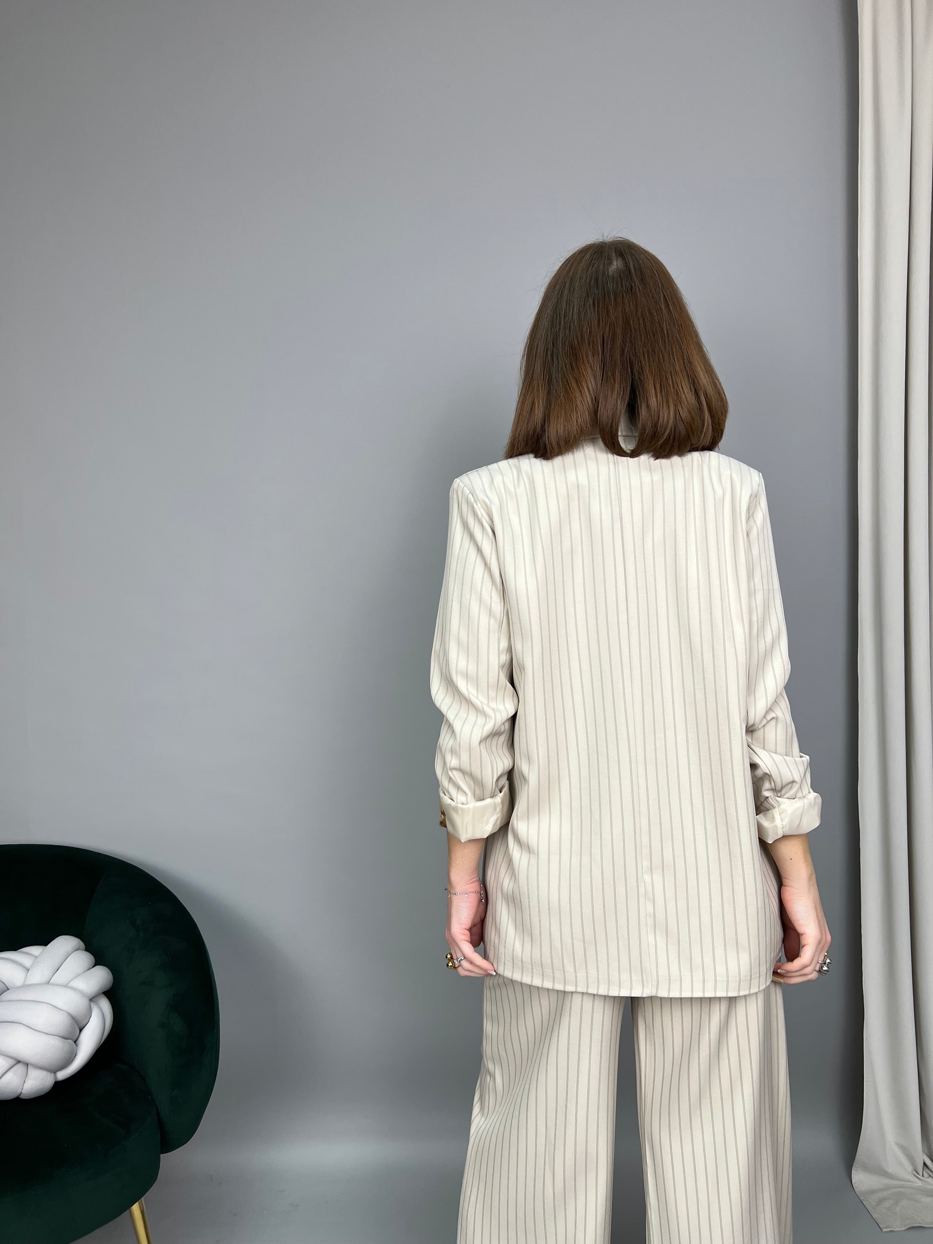 Giacca gessata non-strutturata, chiusura monopetto con revers classico. Presenta spalline di supporto e fodera interna. Le tasche frontali sono solo estetiche. Un taglio leggermente over con vestibilità comoda. La lunghezza delle maniche è regolare.