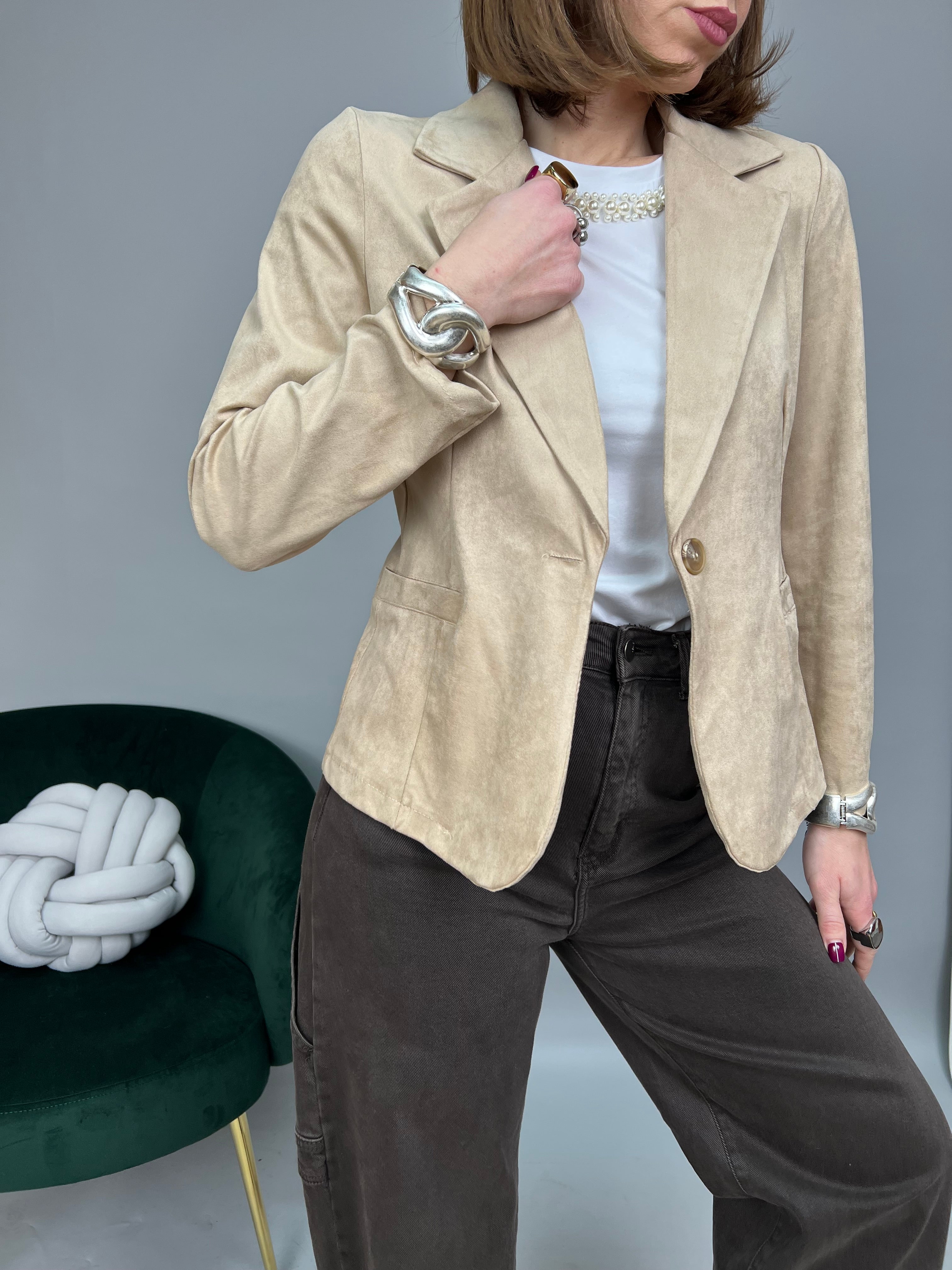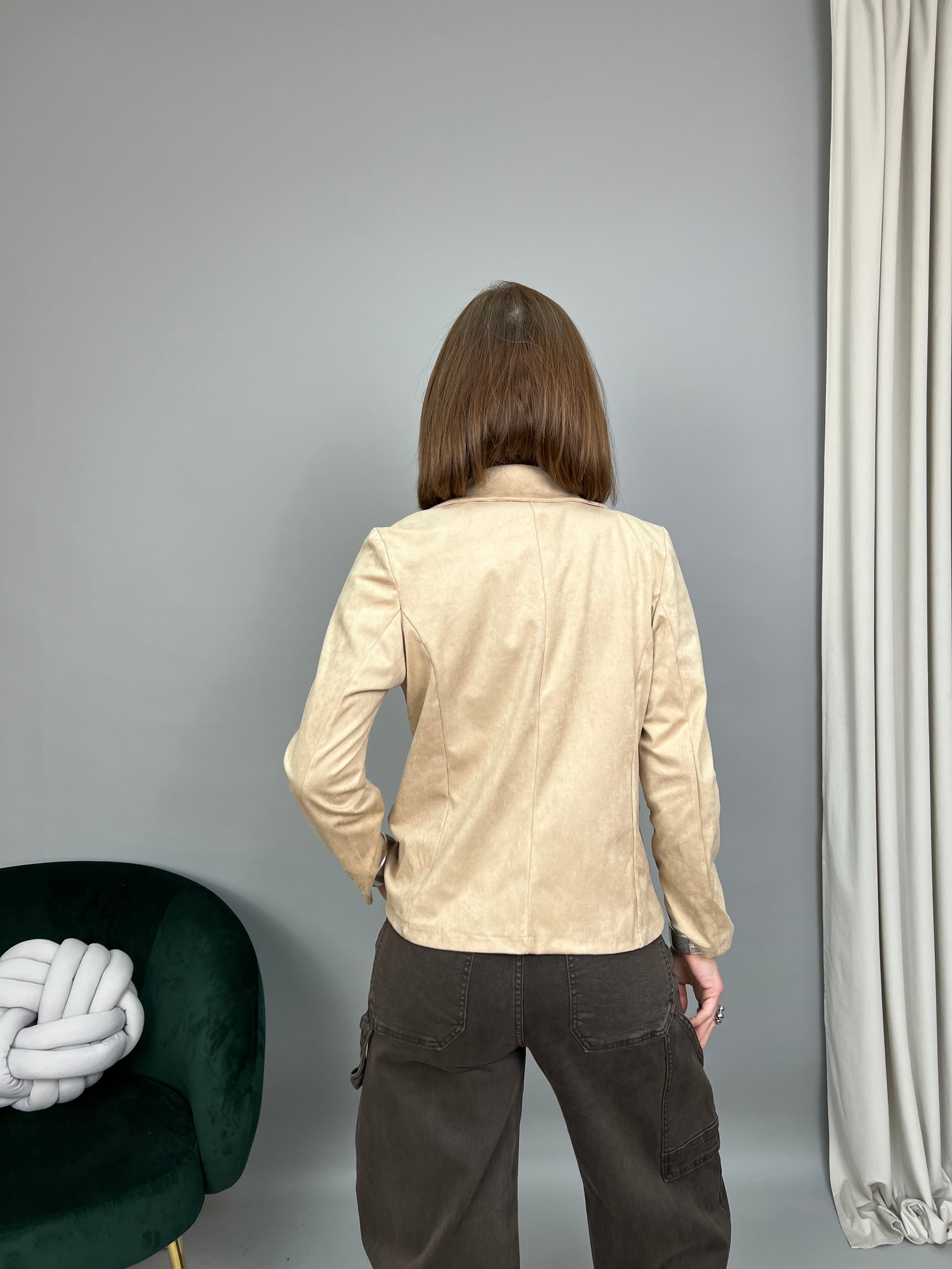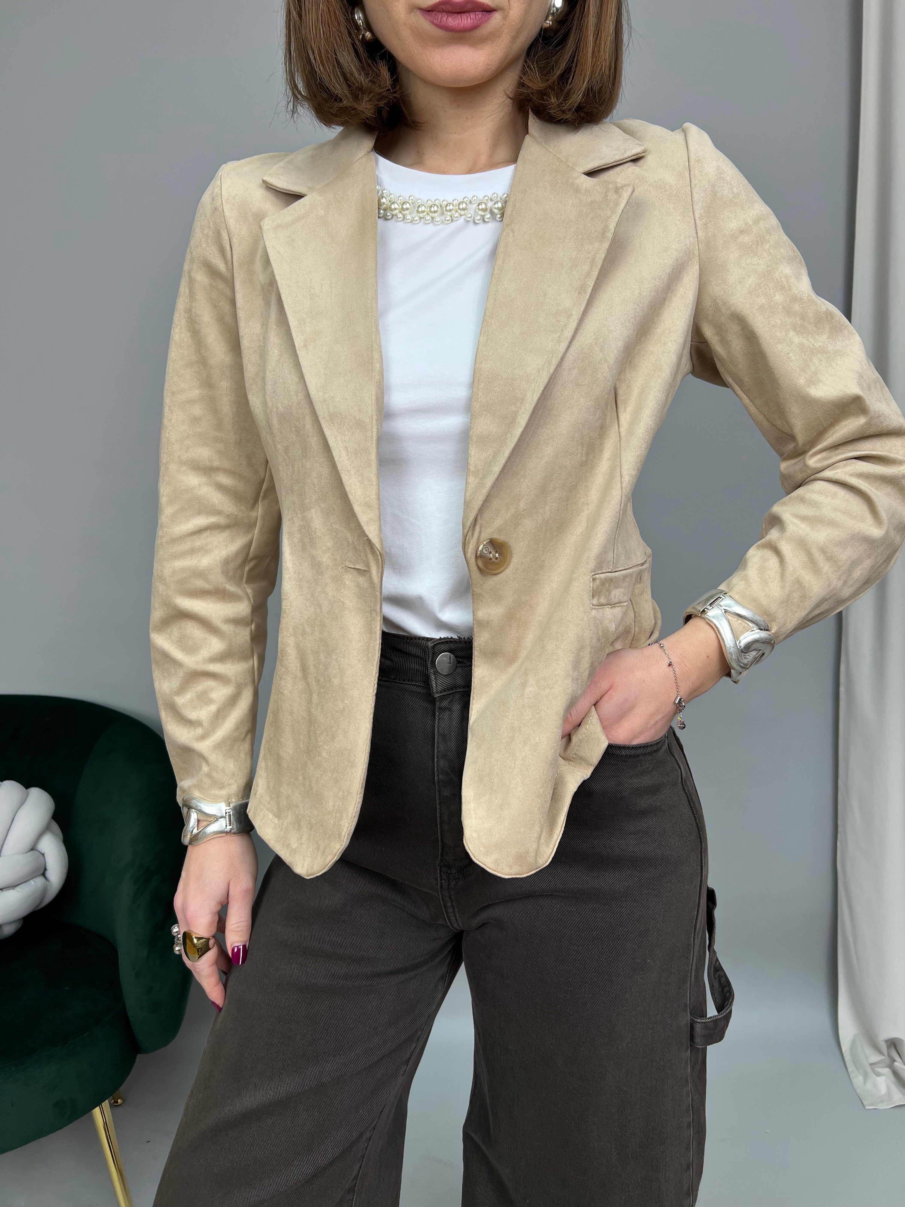 Giacca in suede dal fit avvitato, con chiusura monopetto e revers classico. Non presenta spalline di supporto, nè fodera interna. Le tasche frontali sono solo estetiche.