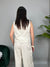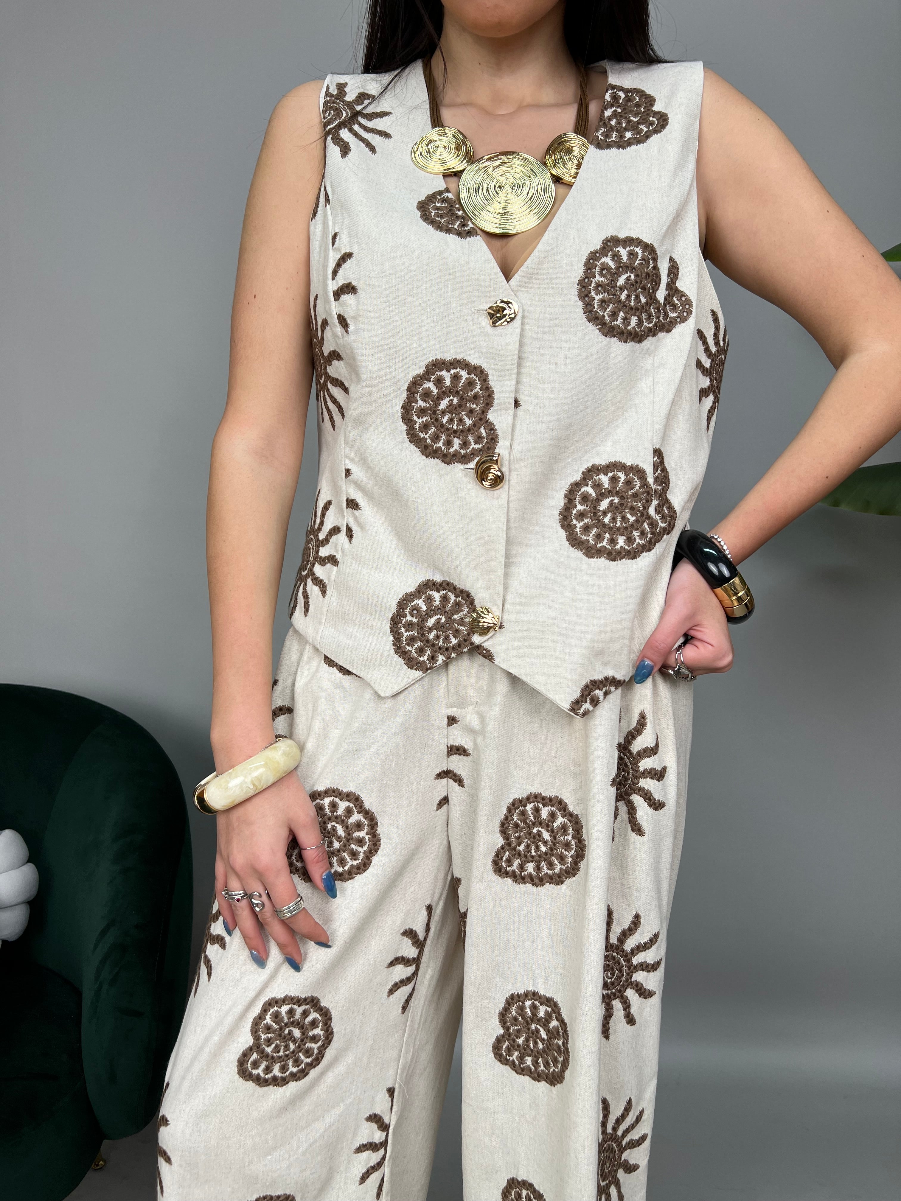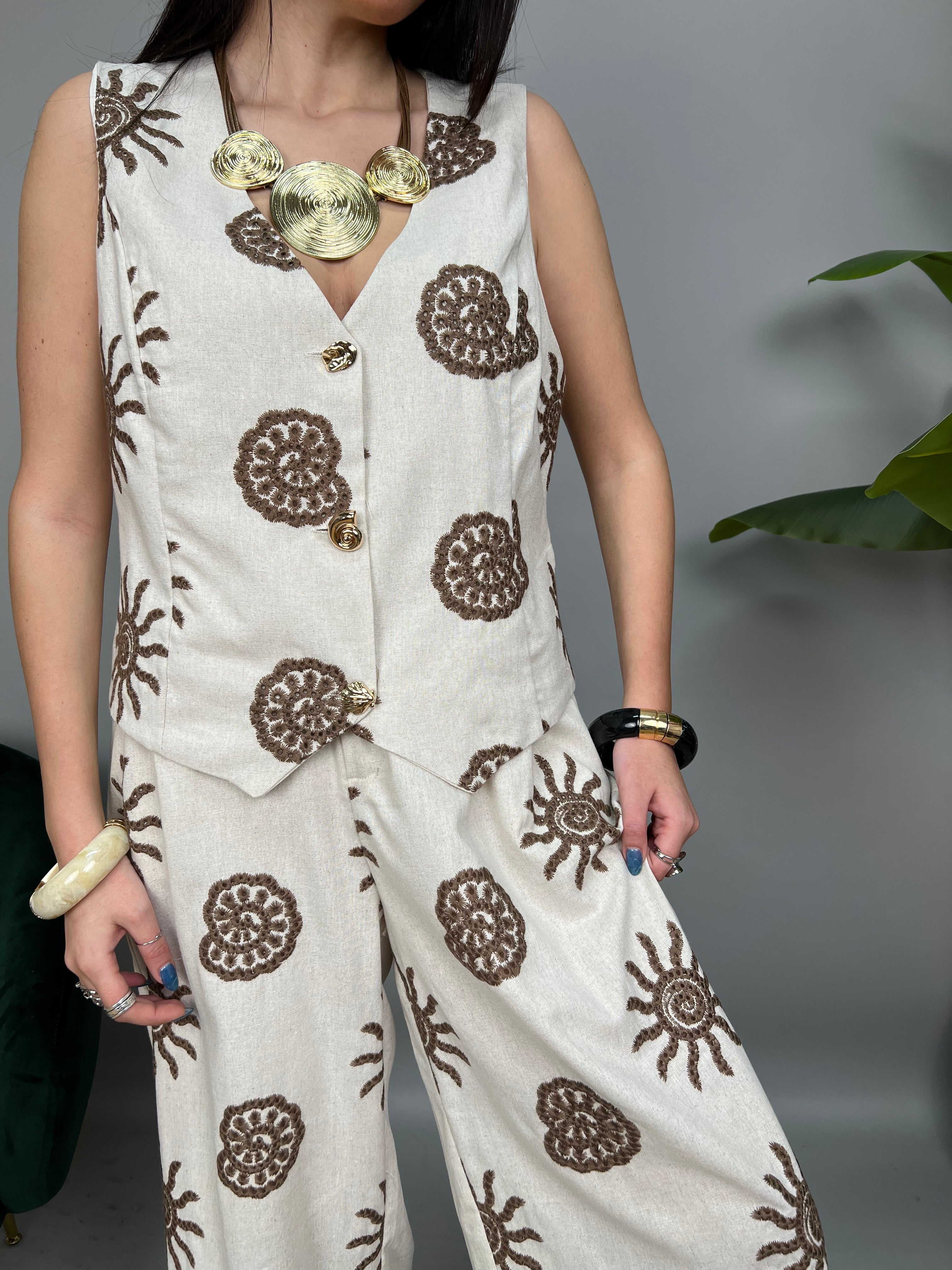 Gilet in misto cotone e lino, con scollo a V e chiusura frontale con bottoni dorati di diverse forme. Il modello è impreziosito da ricami leggermente traforati sulla parte frontale.  Presenta una fodera interna. La vestibilità è regolare.