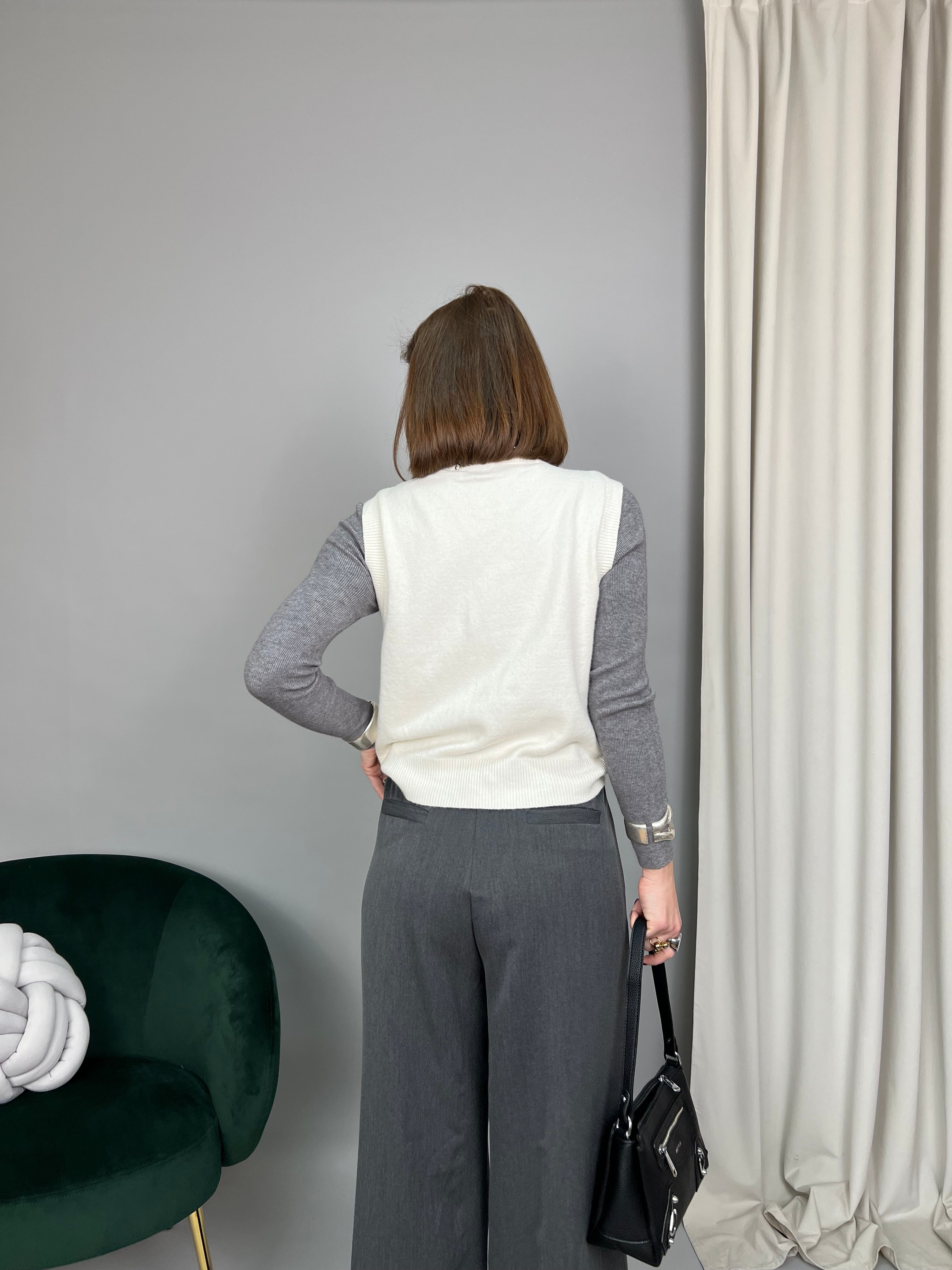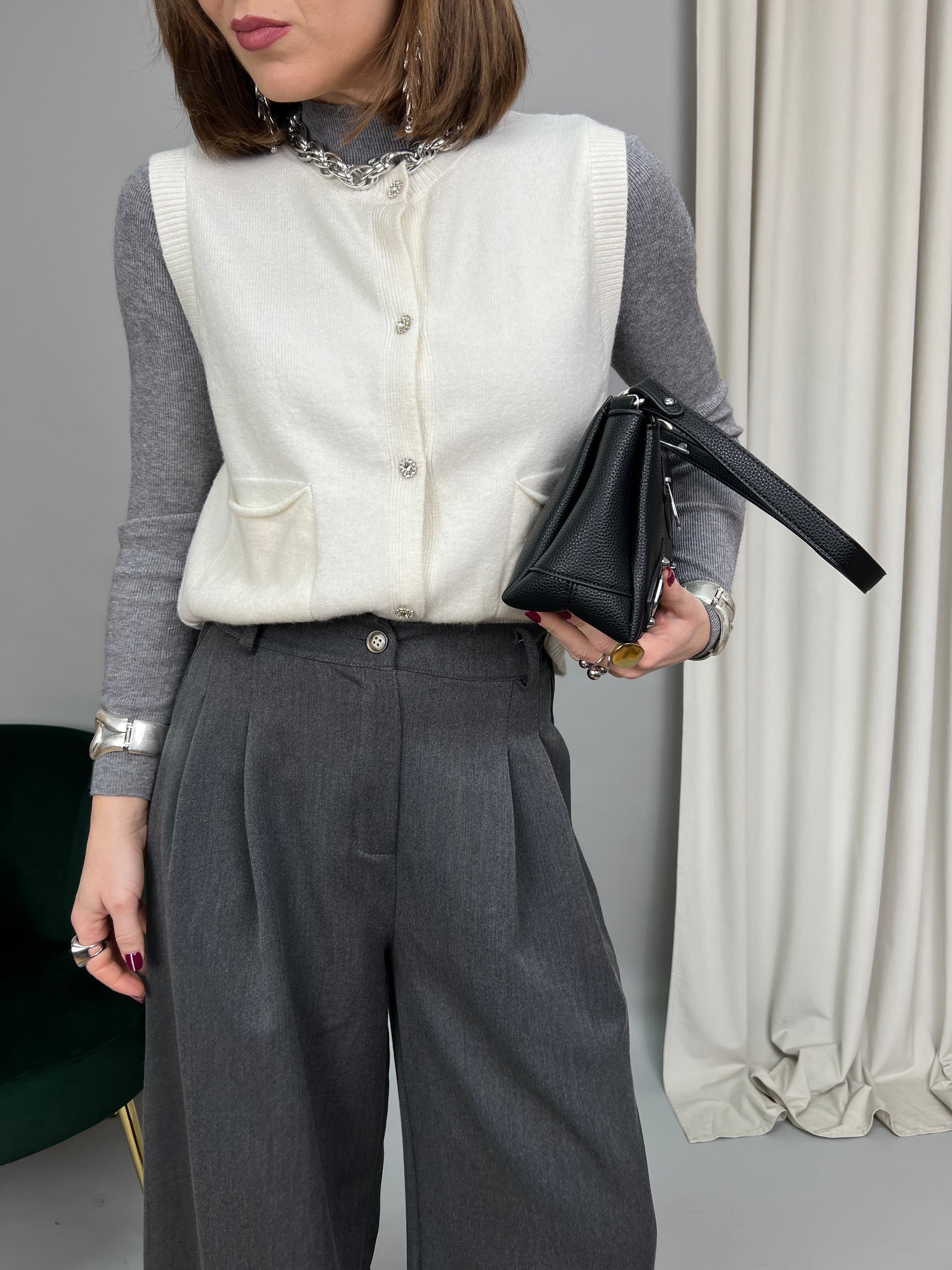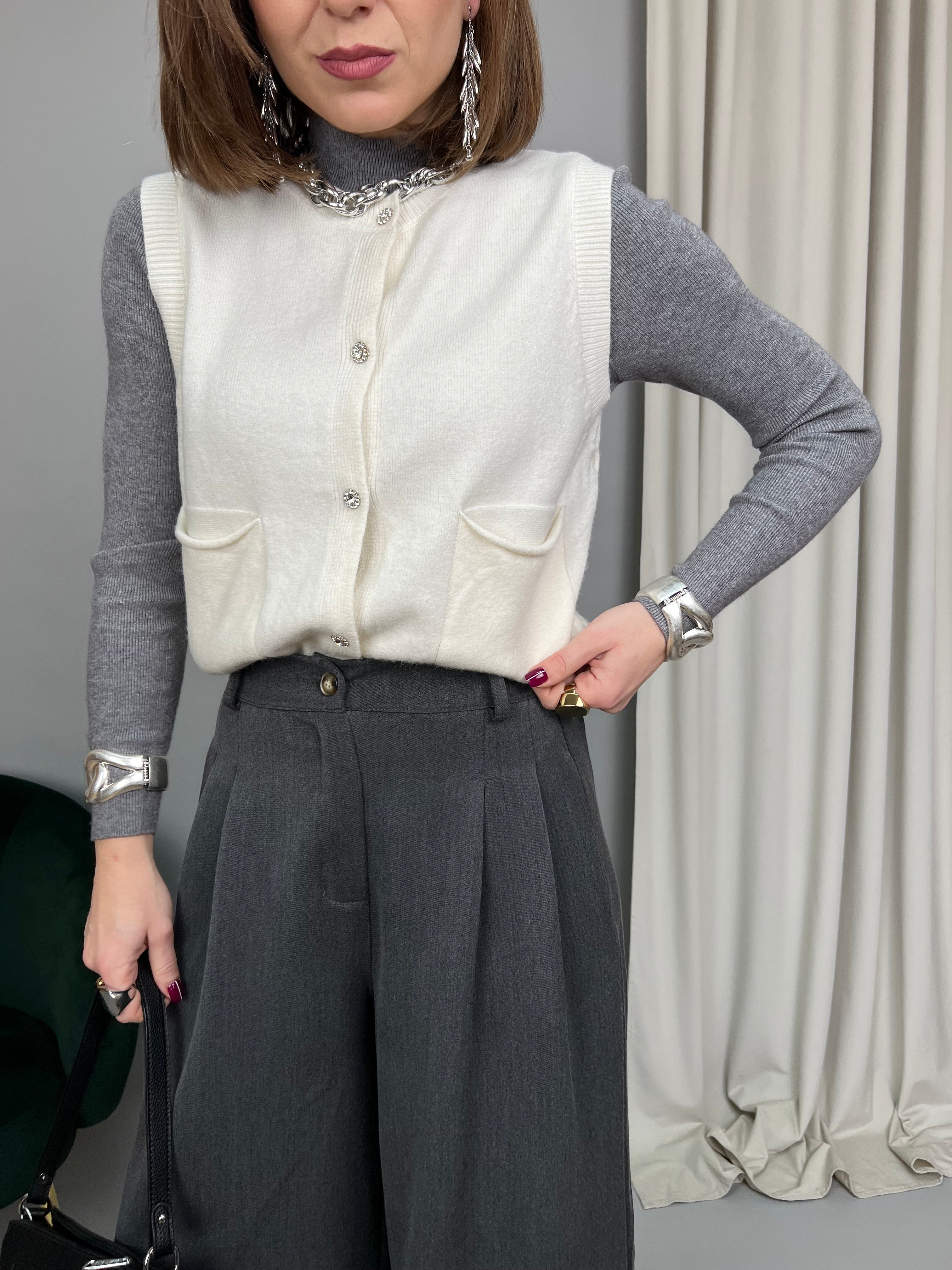 Gilet con scollo tondo e chiusura frontale con bottoncini gioiello. Realizzato in maglia calda e morbida. Presenta due taschine frontali. La vestibilità è comoda e regolare.