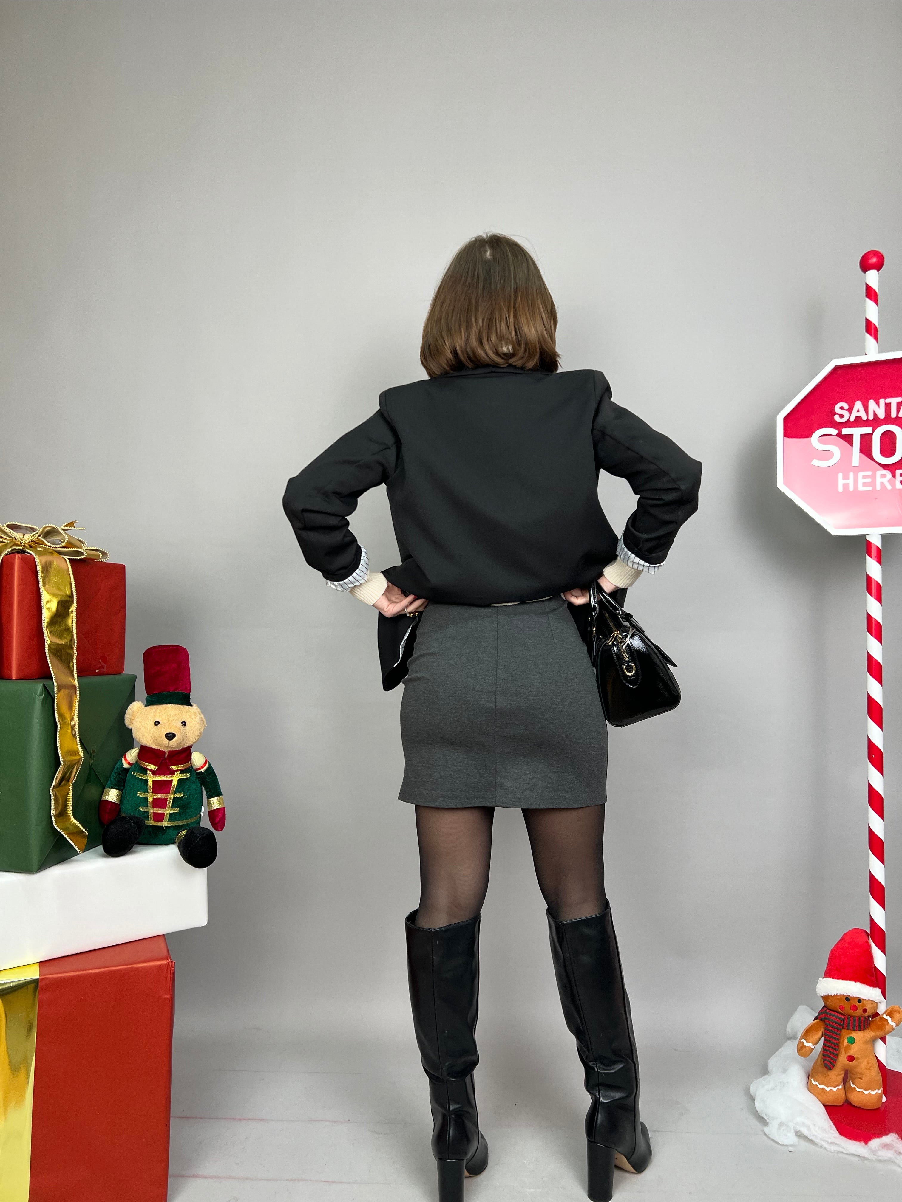 Gonna corta a tubino, in tessuto "Punto Milano" elasticizzato, con elastico in vita e spacchetto laterale nella parte frontale.