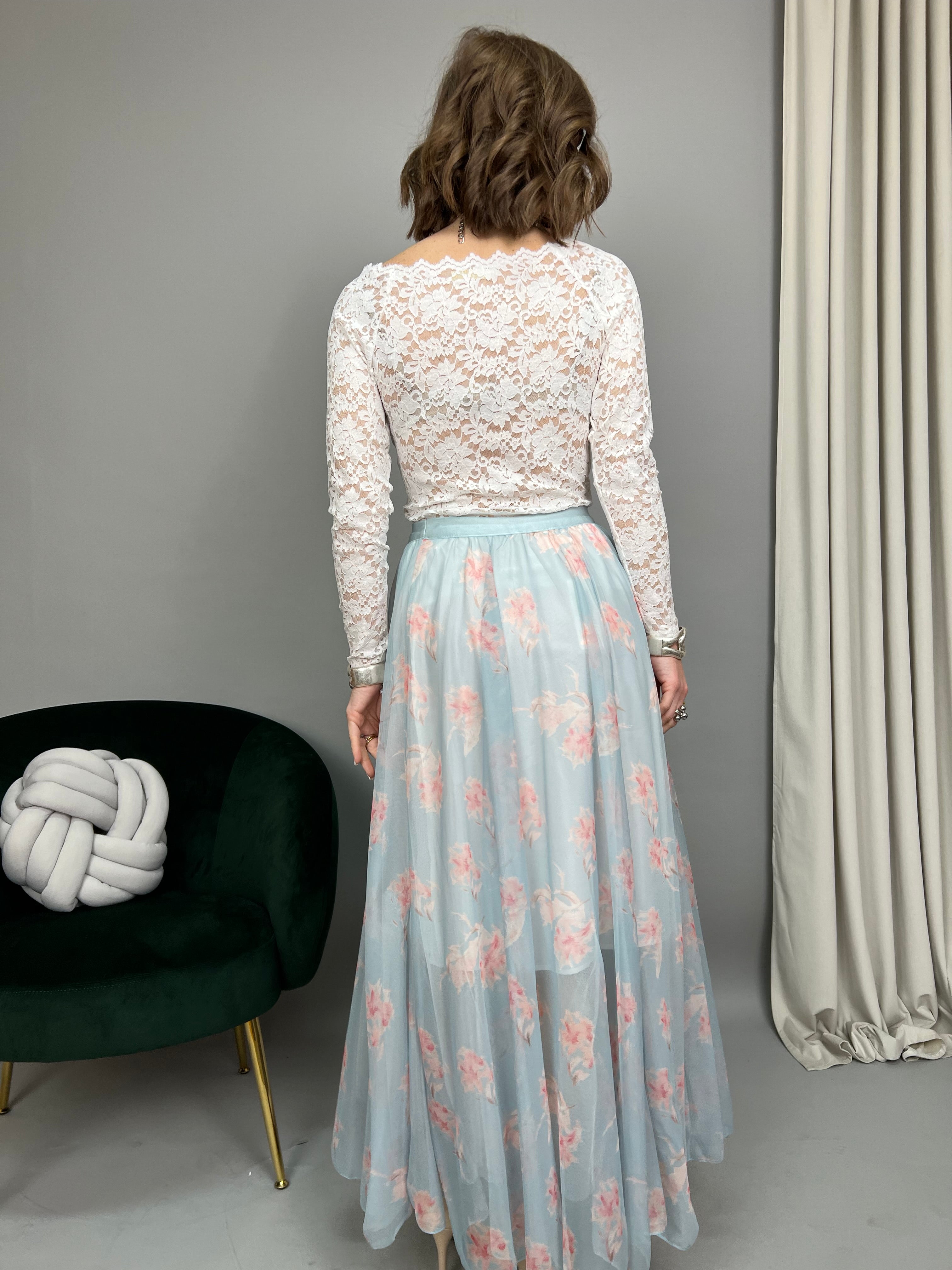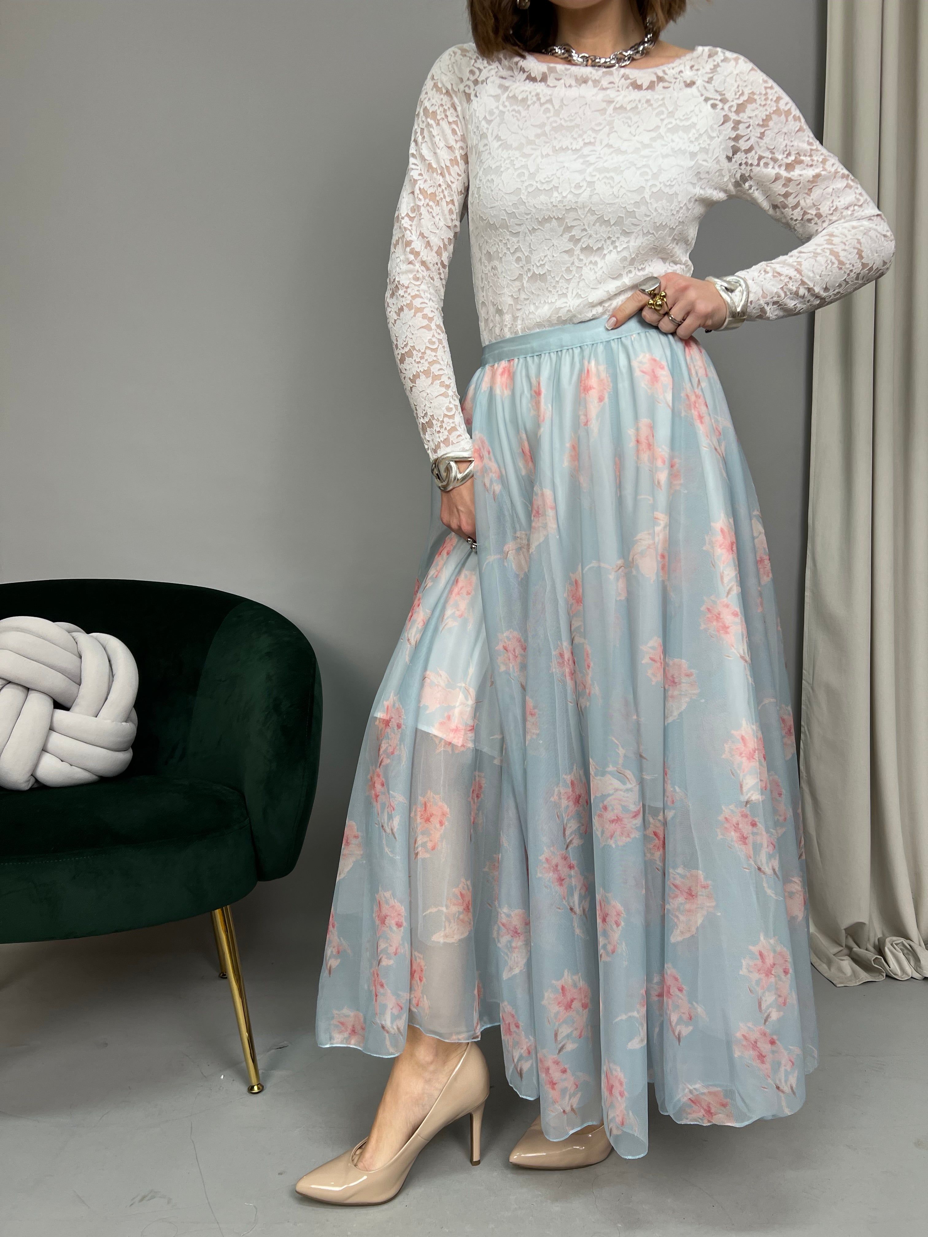 Gonna lunga in tulle con stampa floreale. Il modello presenta un doppio strato di tulle, un elastico in vita e una sottogonna di lunghezza midi. La vestibilità è comoda.