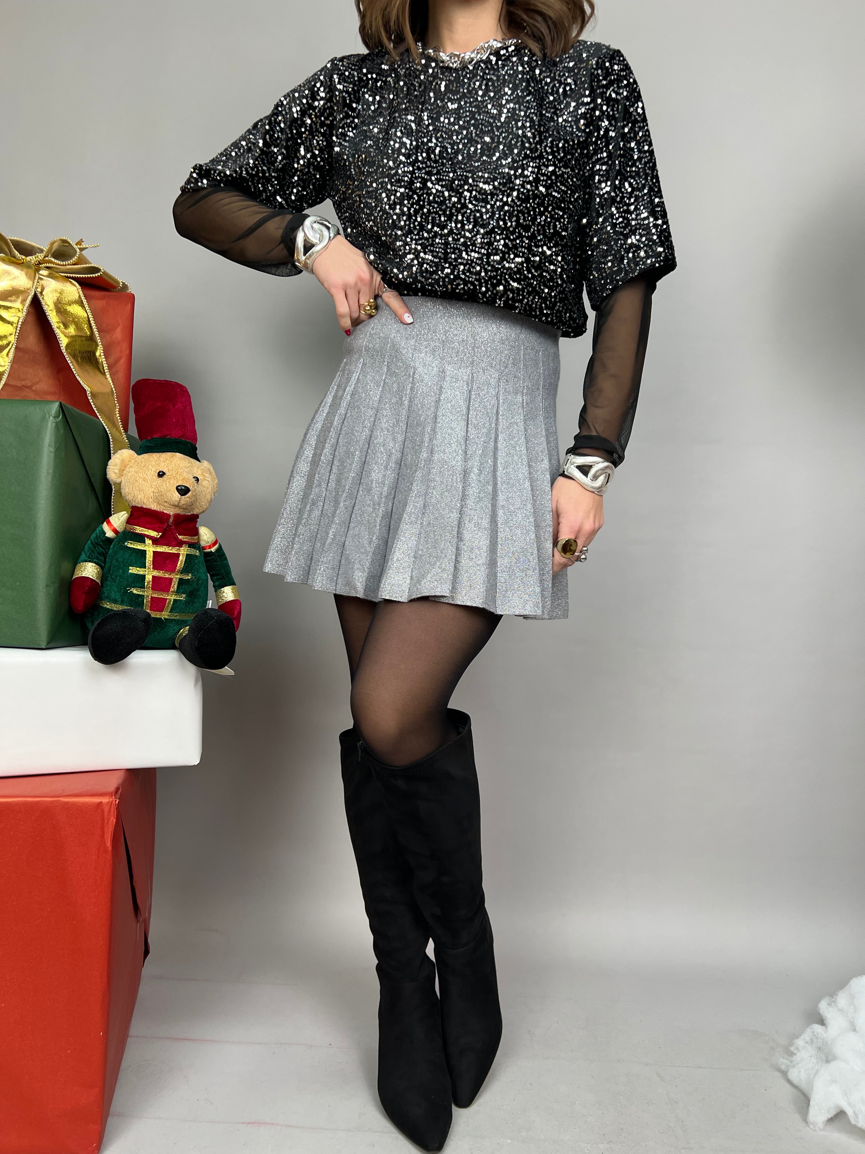 Gonna in maglia corta con effetto plissè. Il tessuto presenta del lurex per un aspetto più brillante.