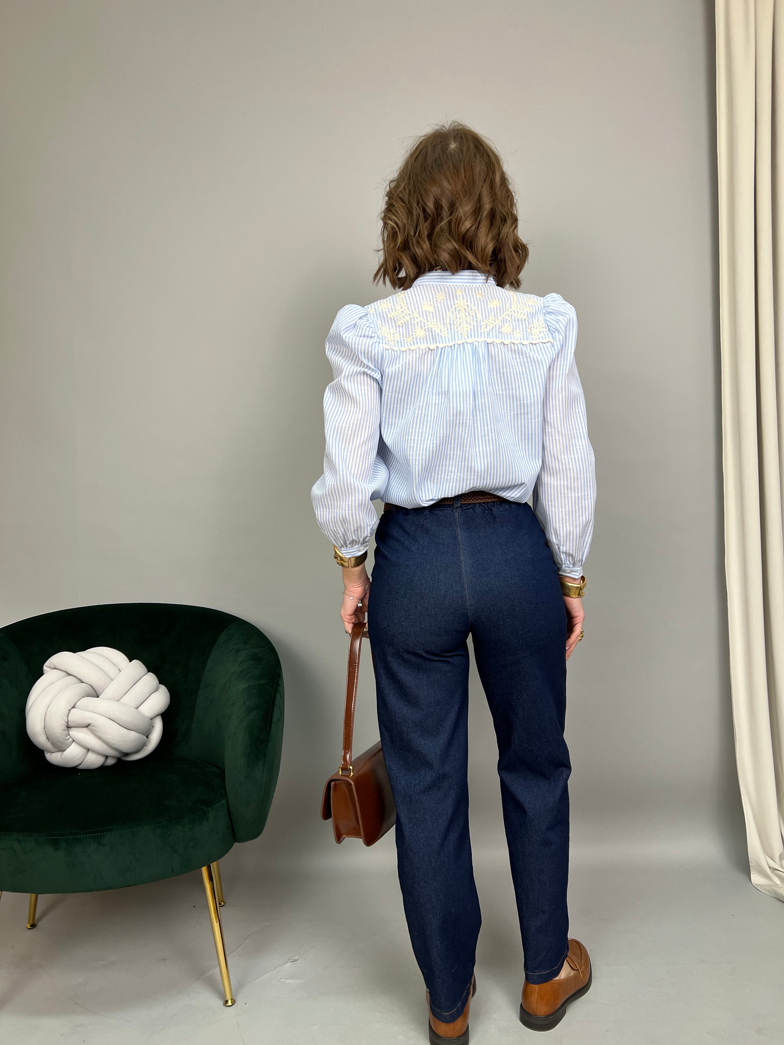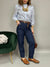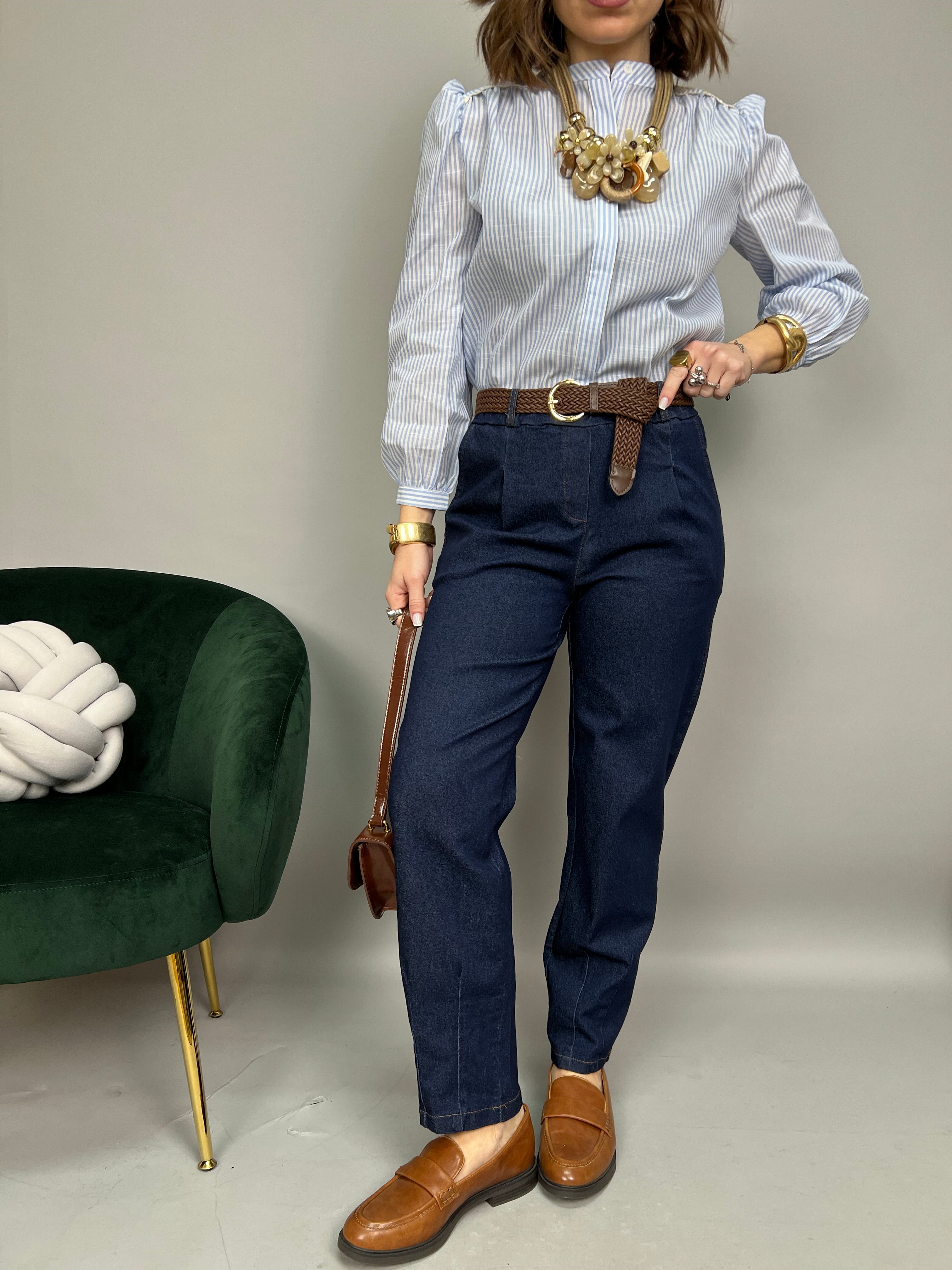 Jeans modello "carrot fit" che va a stringersi sul fondo, con pinces frontali, tasche laterali ed elastico in vita. La vestibilità è comoda, il tessuto è elasticizzato. La cintura è inclusa.