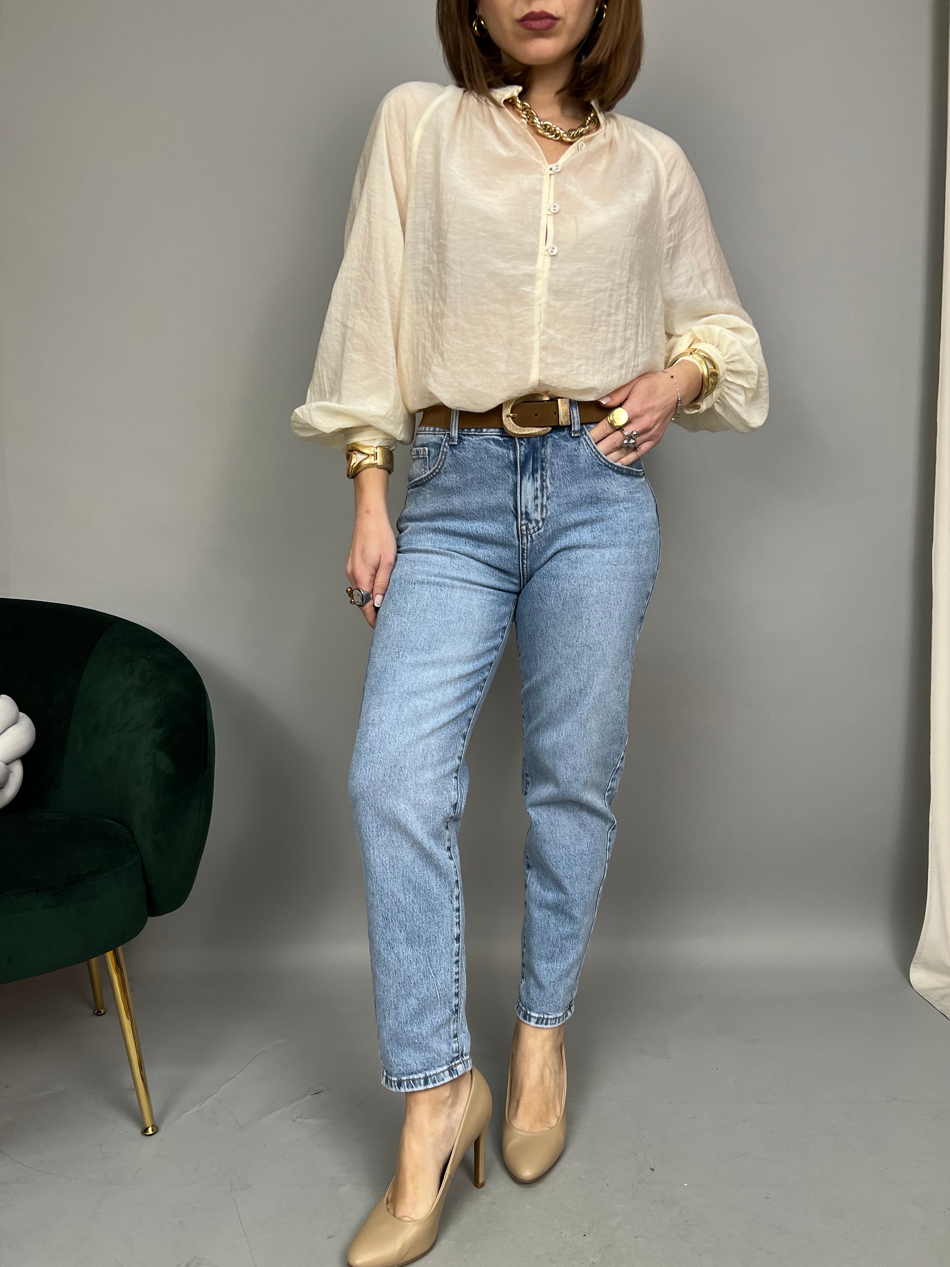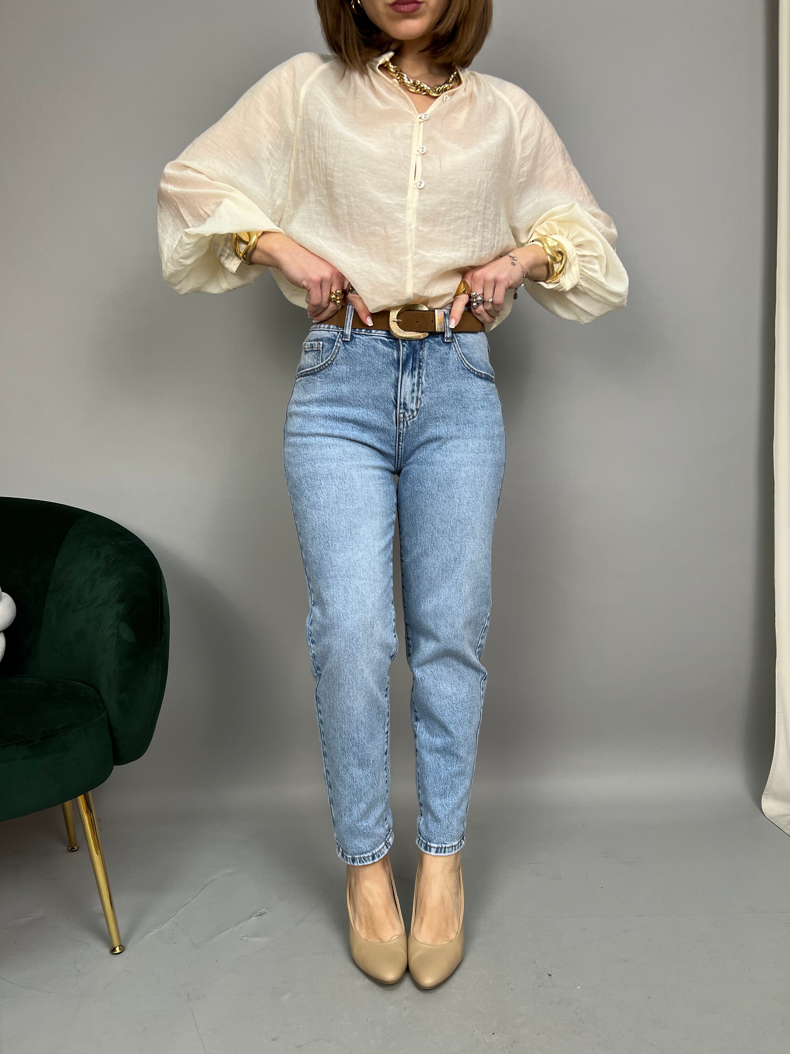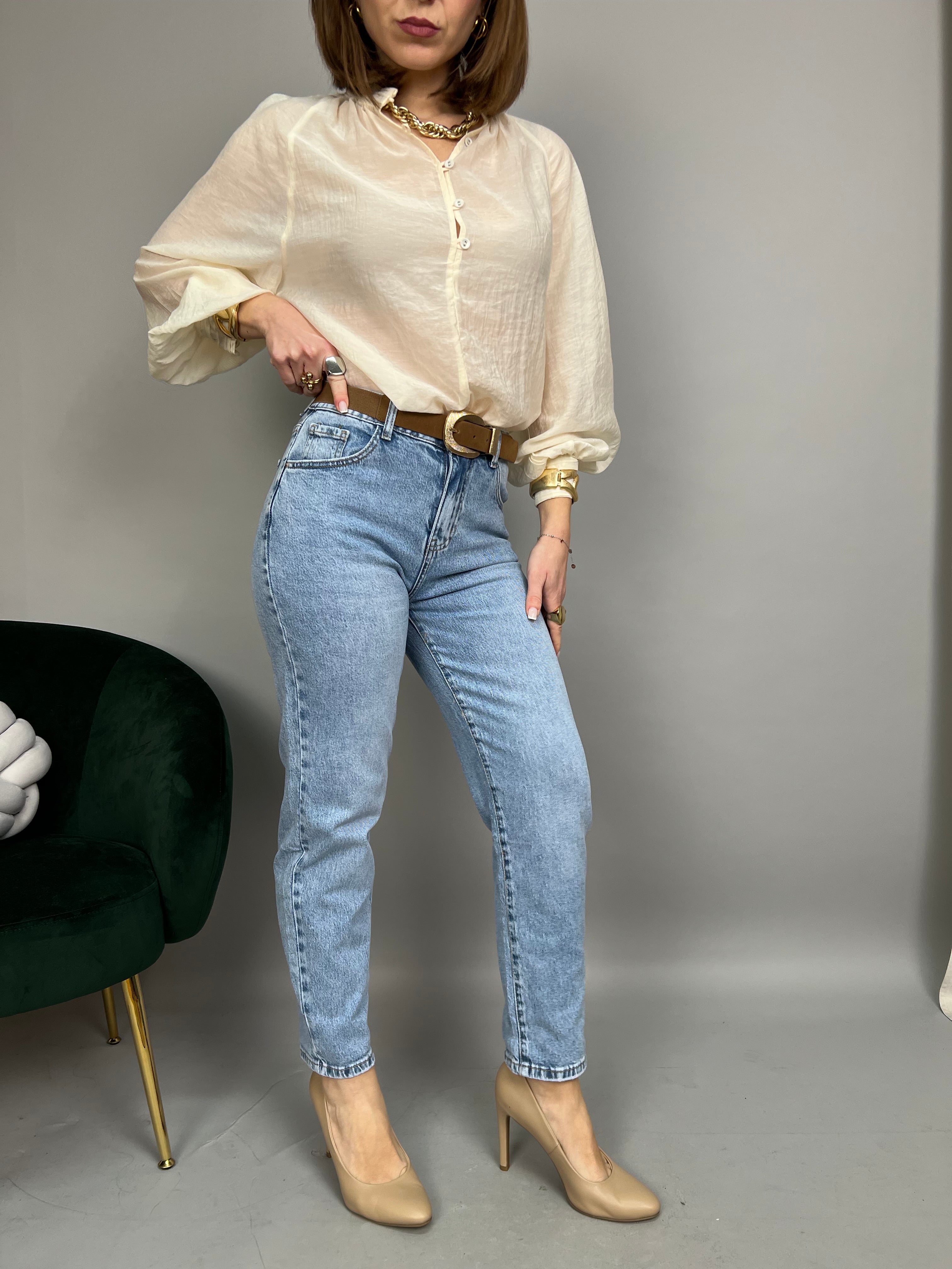 Jeans modello "Mom Fit" a vita alta. La tela è elasticizzata.
