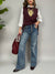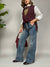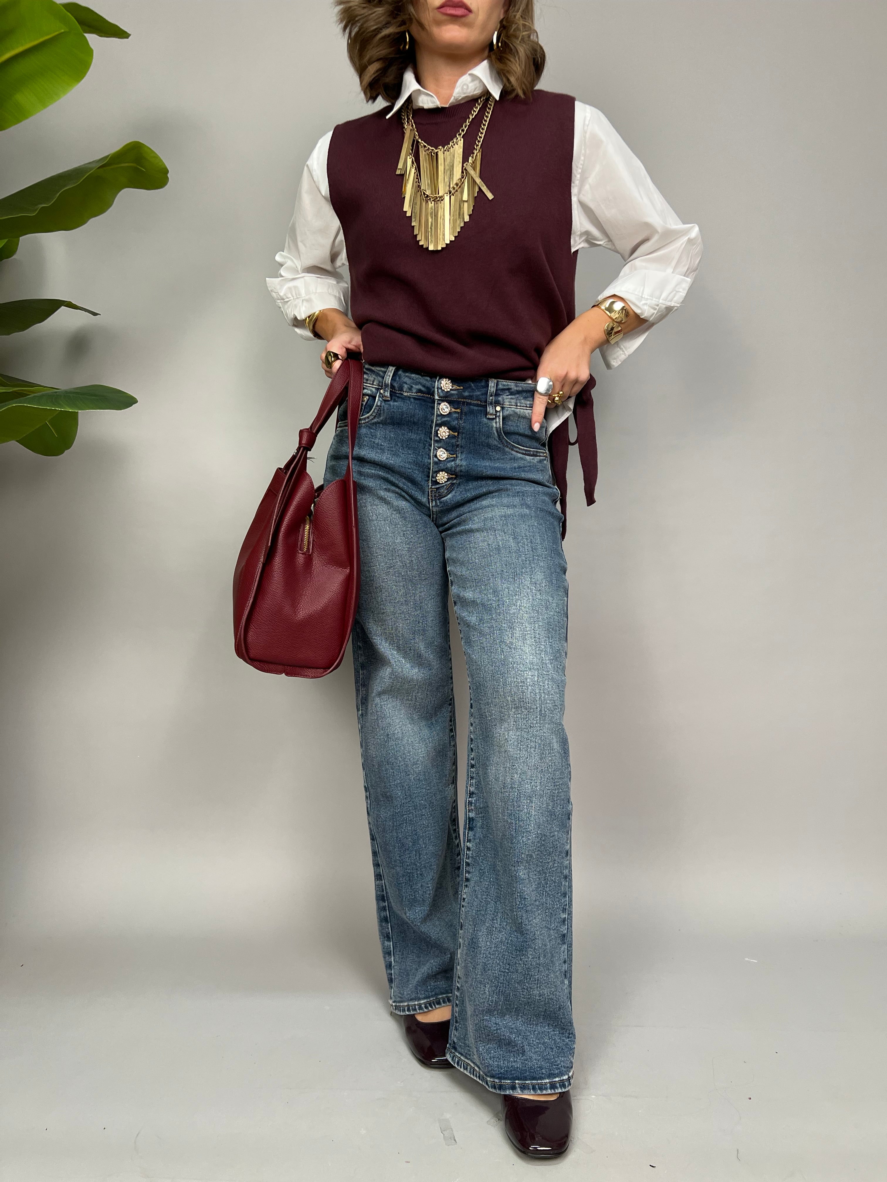 Jeans elasticizzato in lavaggio medio. I l modello è palazzo e presenta dei bottoni gioiello sulla chiusura frontale