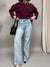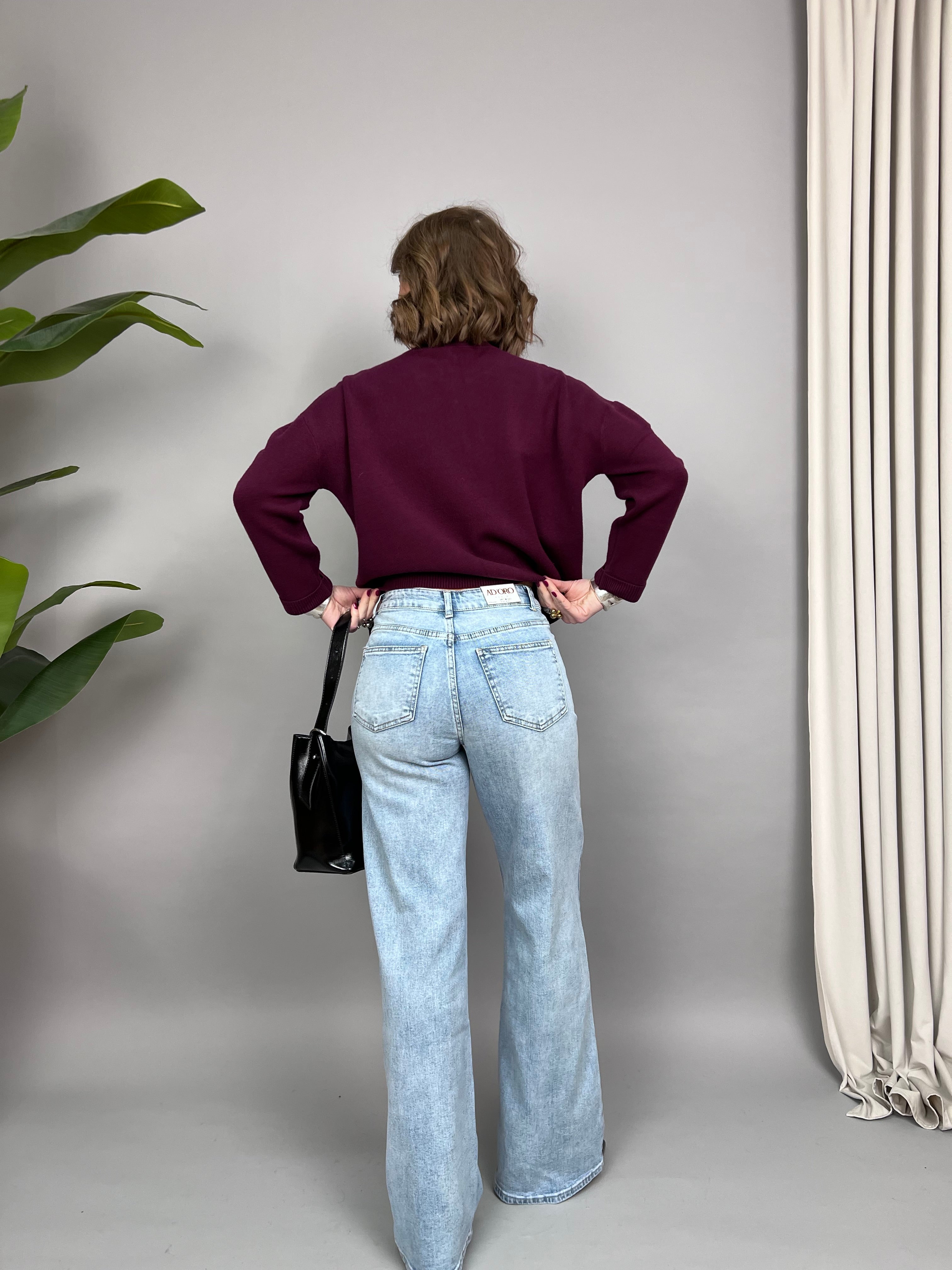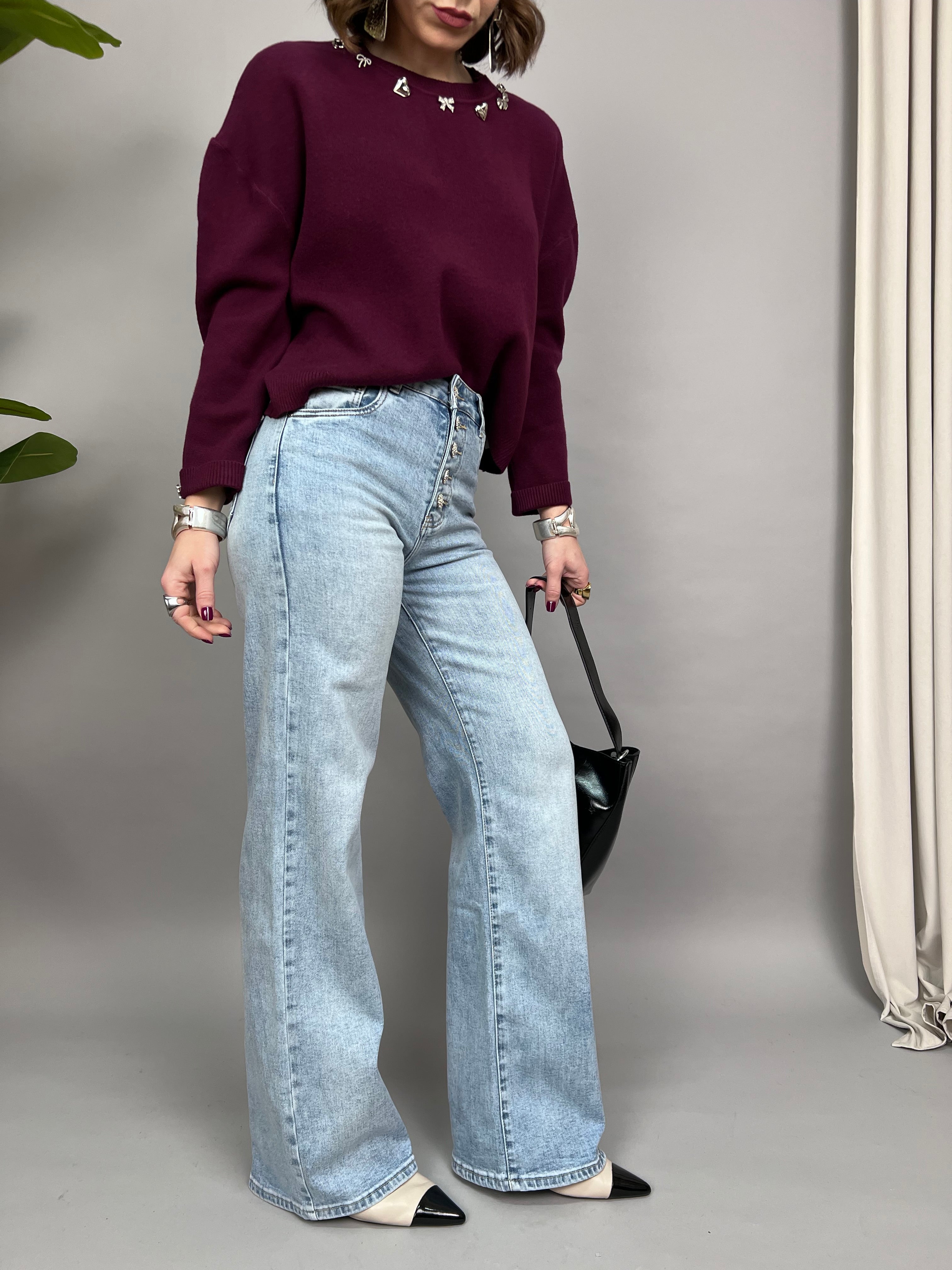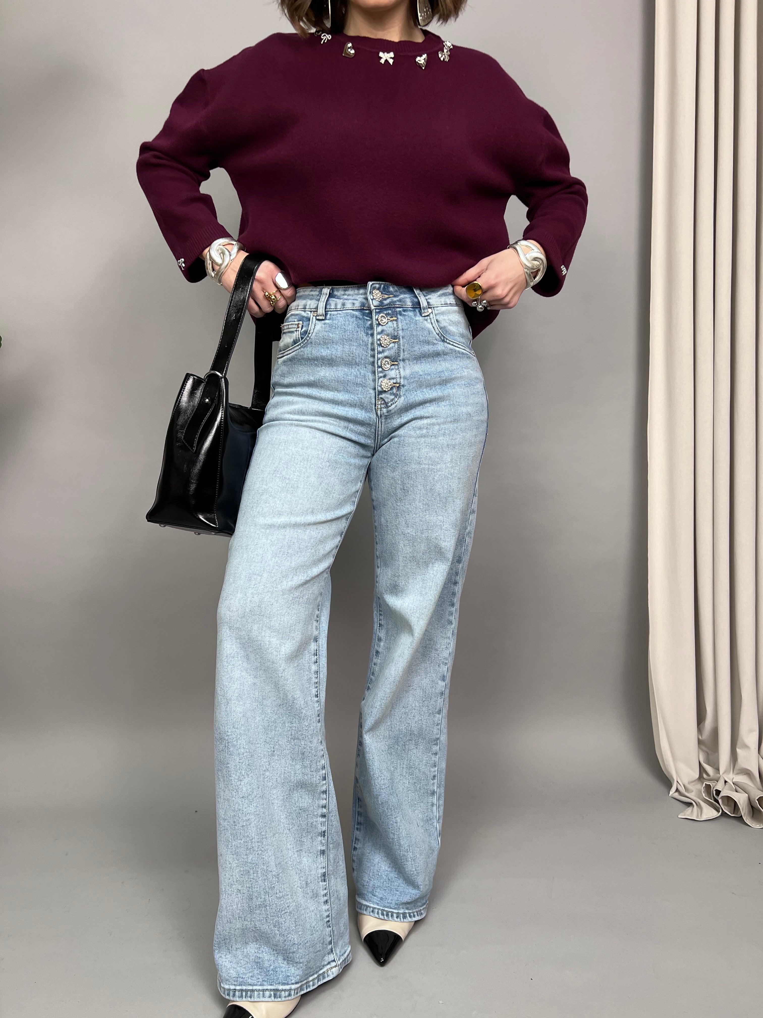 Jeans modello "palazzo" dalla vita alta. La tela è elasticizzata e presenta una chiusura frontale con bottoni gioiello.