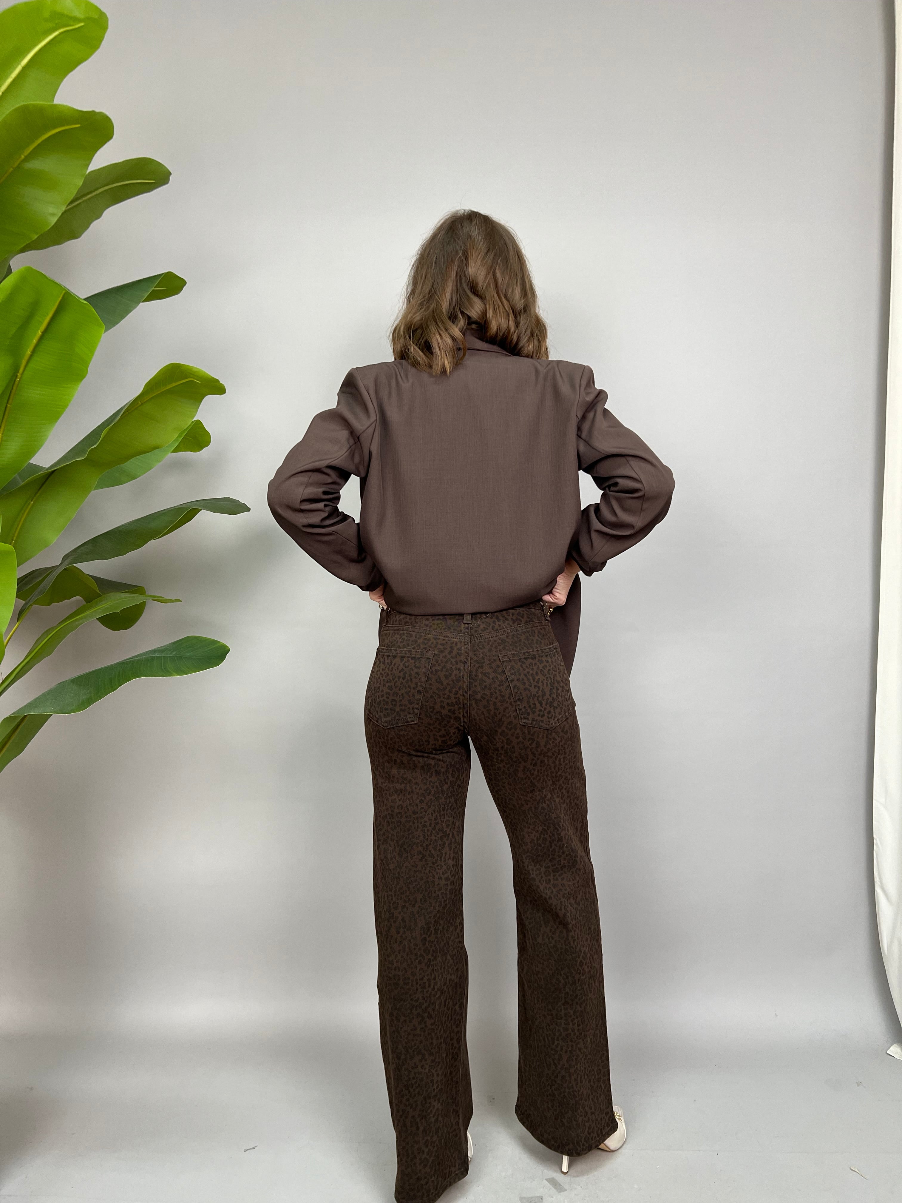 Jeans elasticizzato a vita media. Il modello è palazzo e presenta una fantasia maculata.
