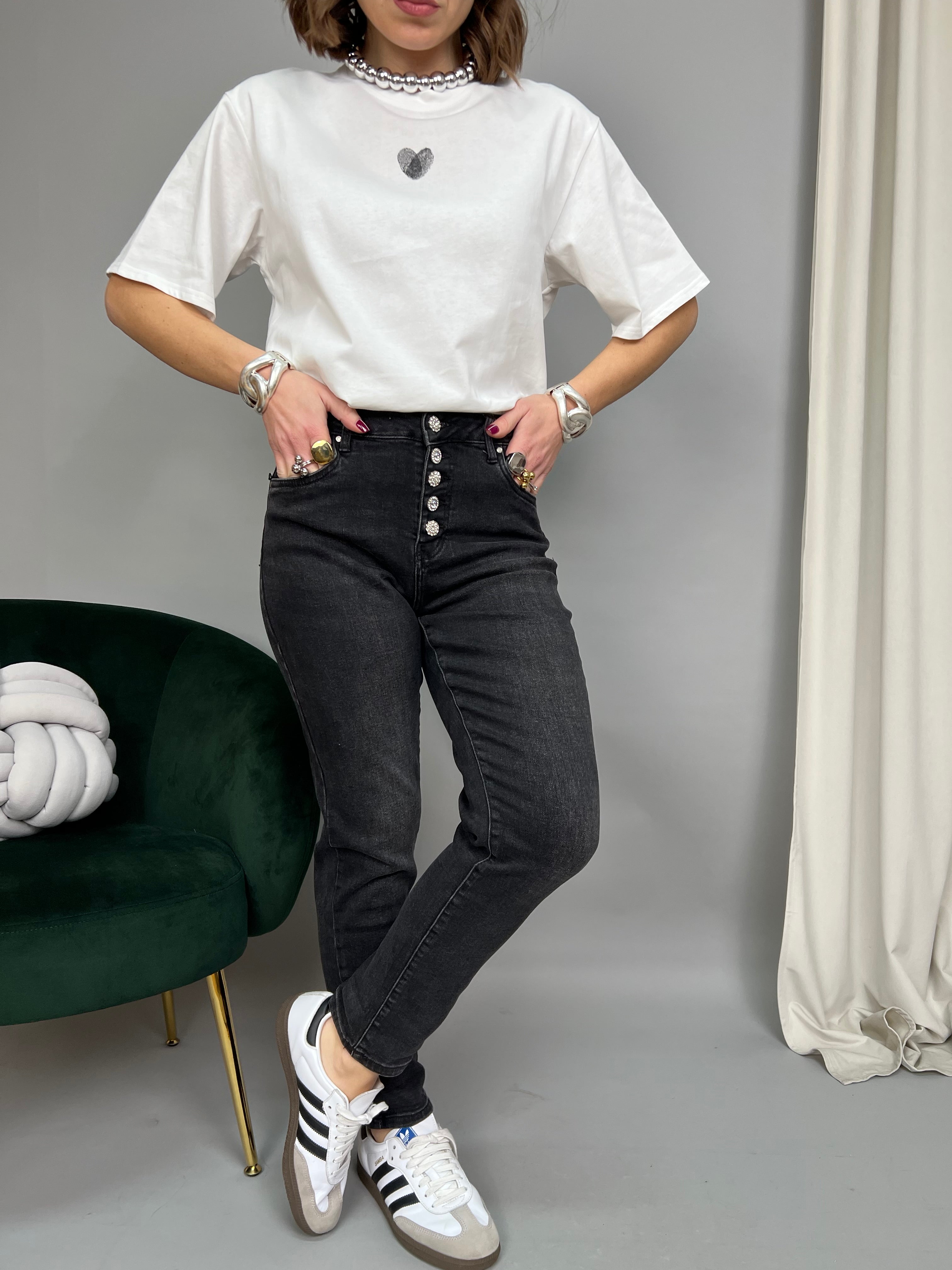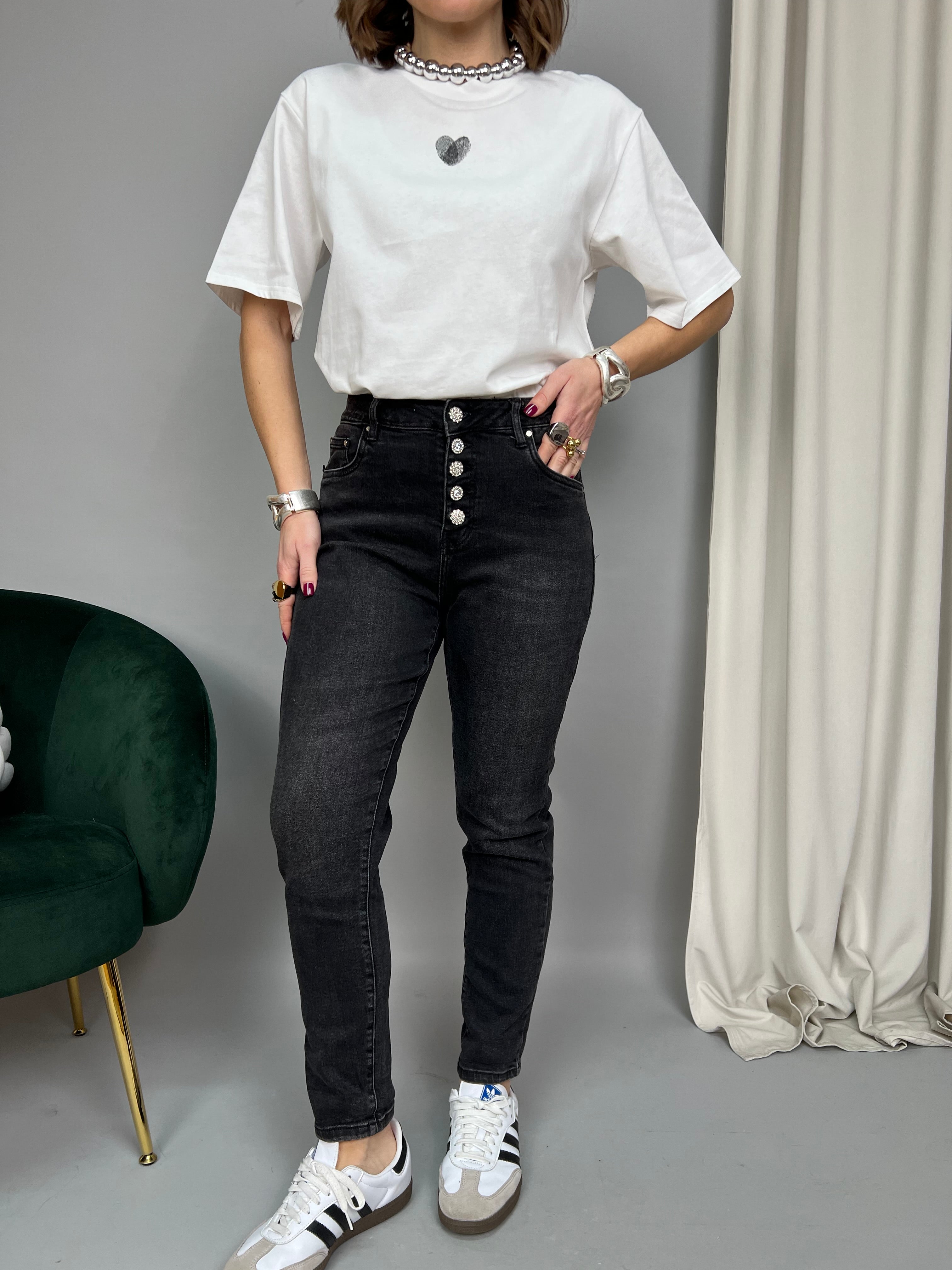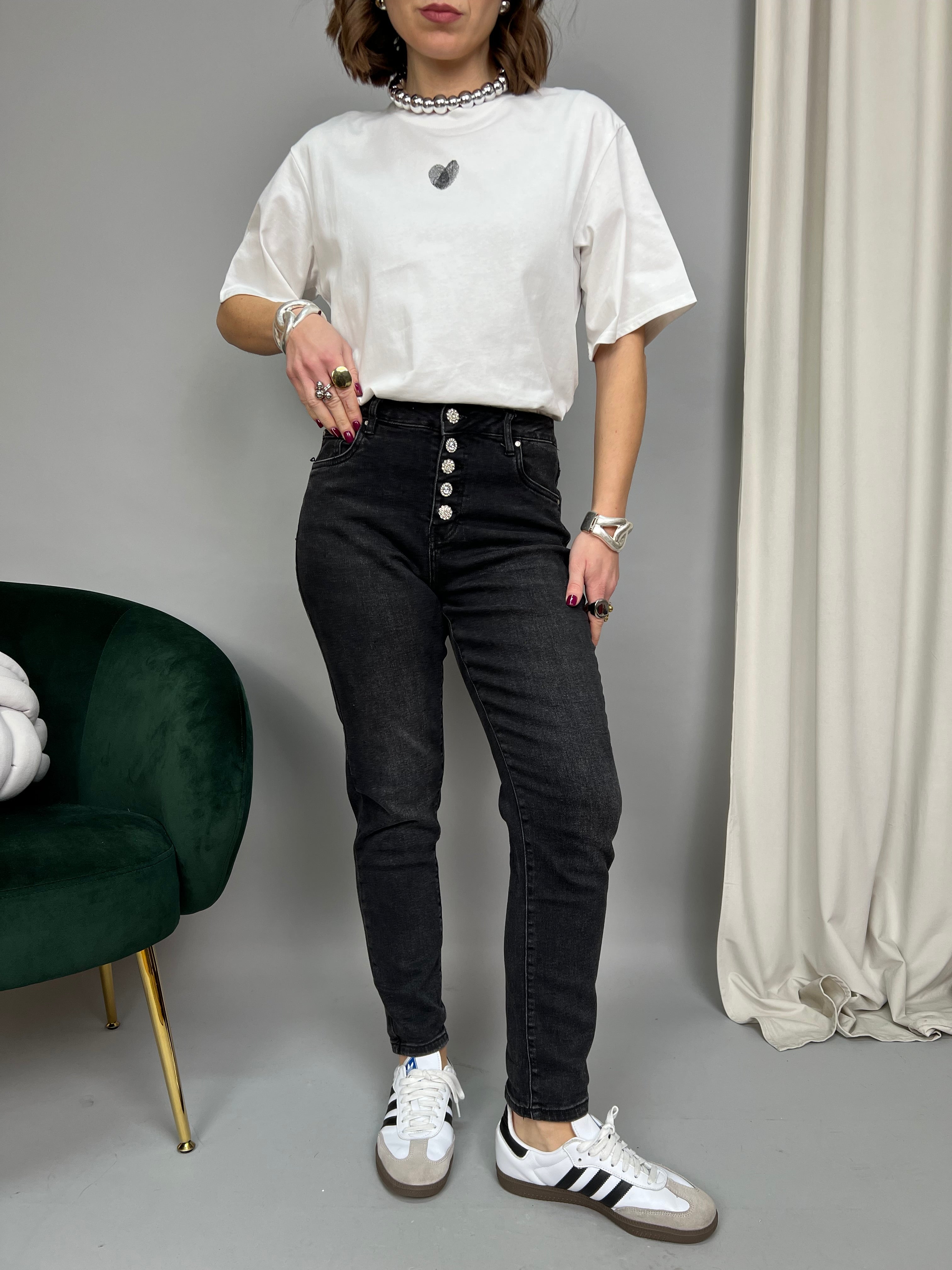 Jeans modello "Mom Fit" a vita alta. La tela è elasticizzata e presenta una chiusura frontale con bottoni gioiello.