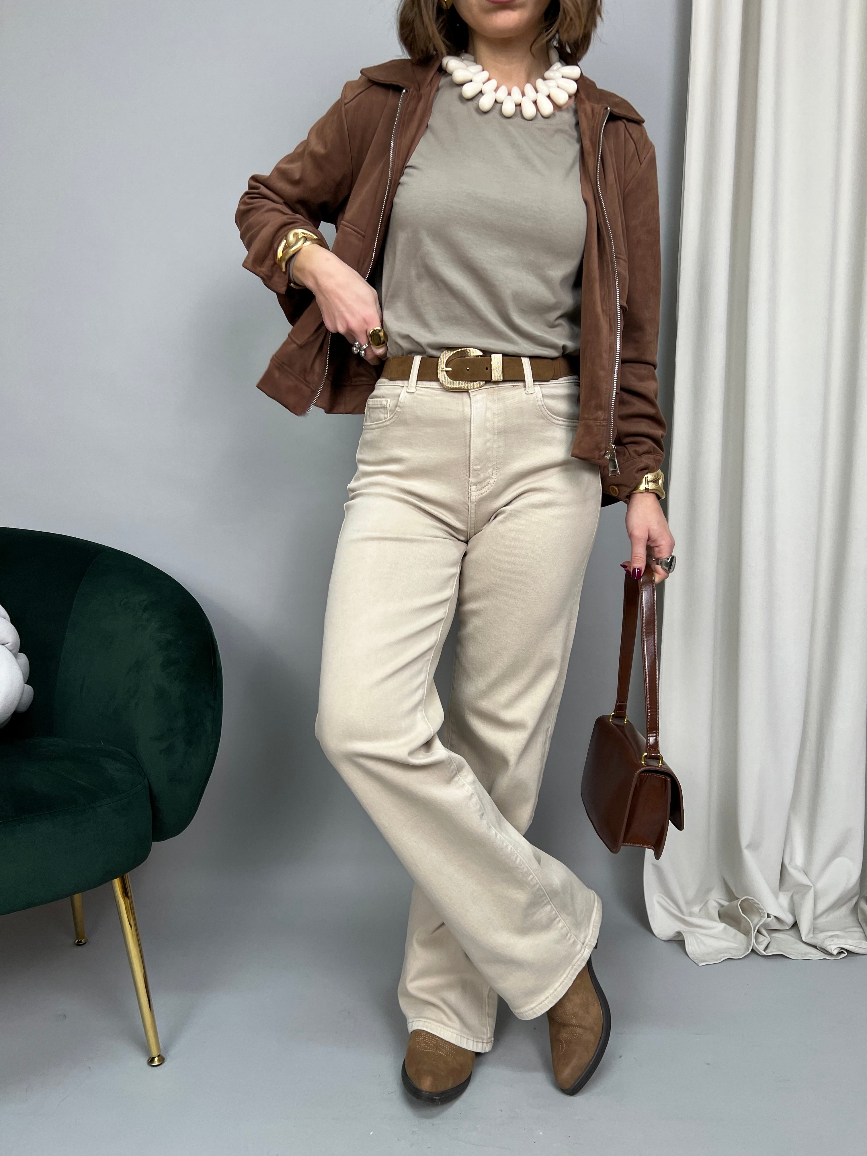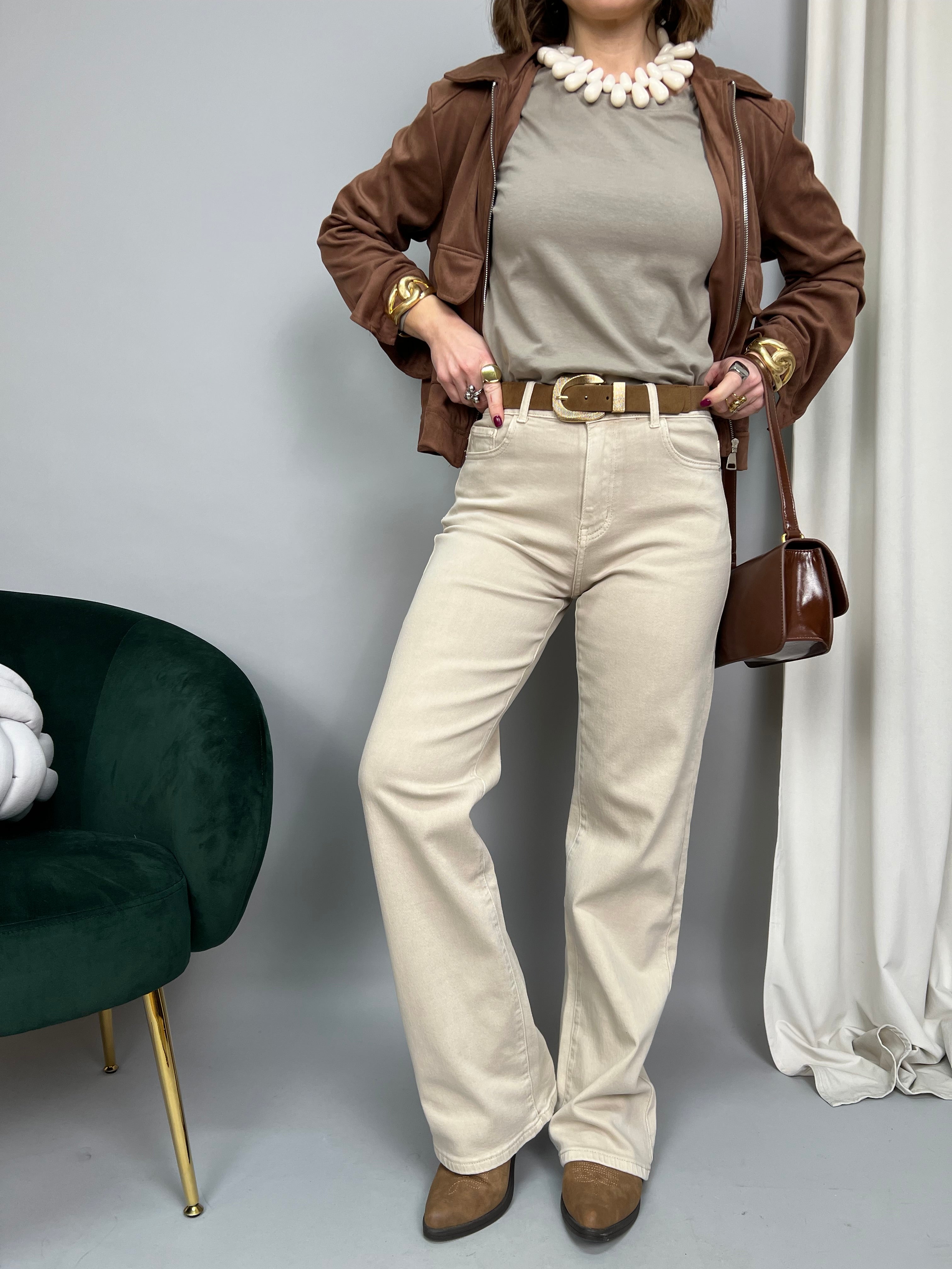 Jeans modello palazzo, con gamba dritta. La tela è elasticizzata ed il jeans ha una vita alta.