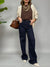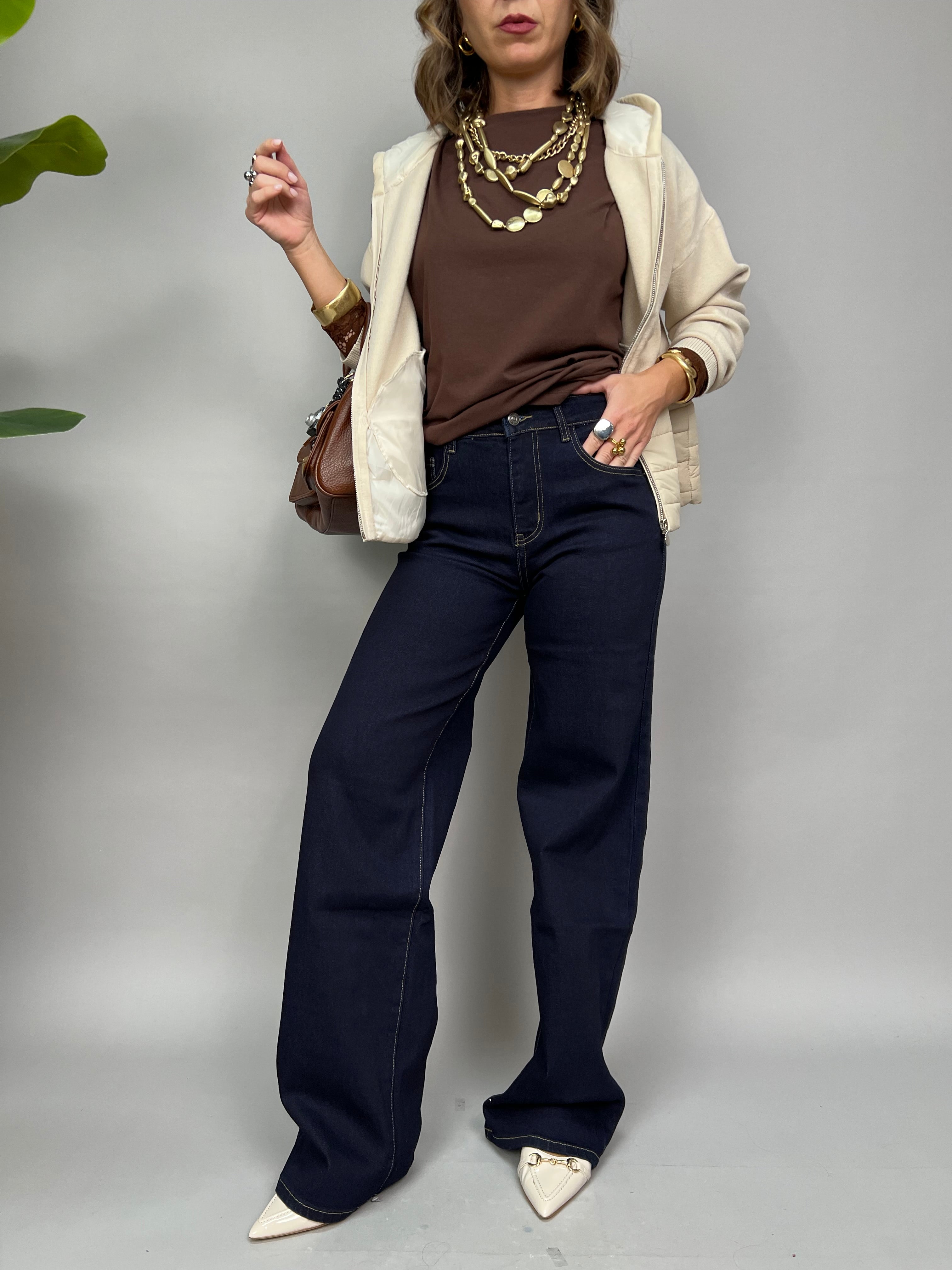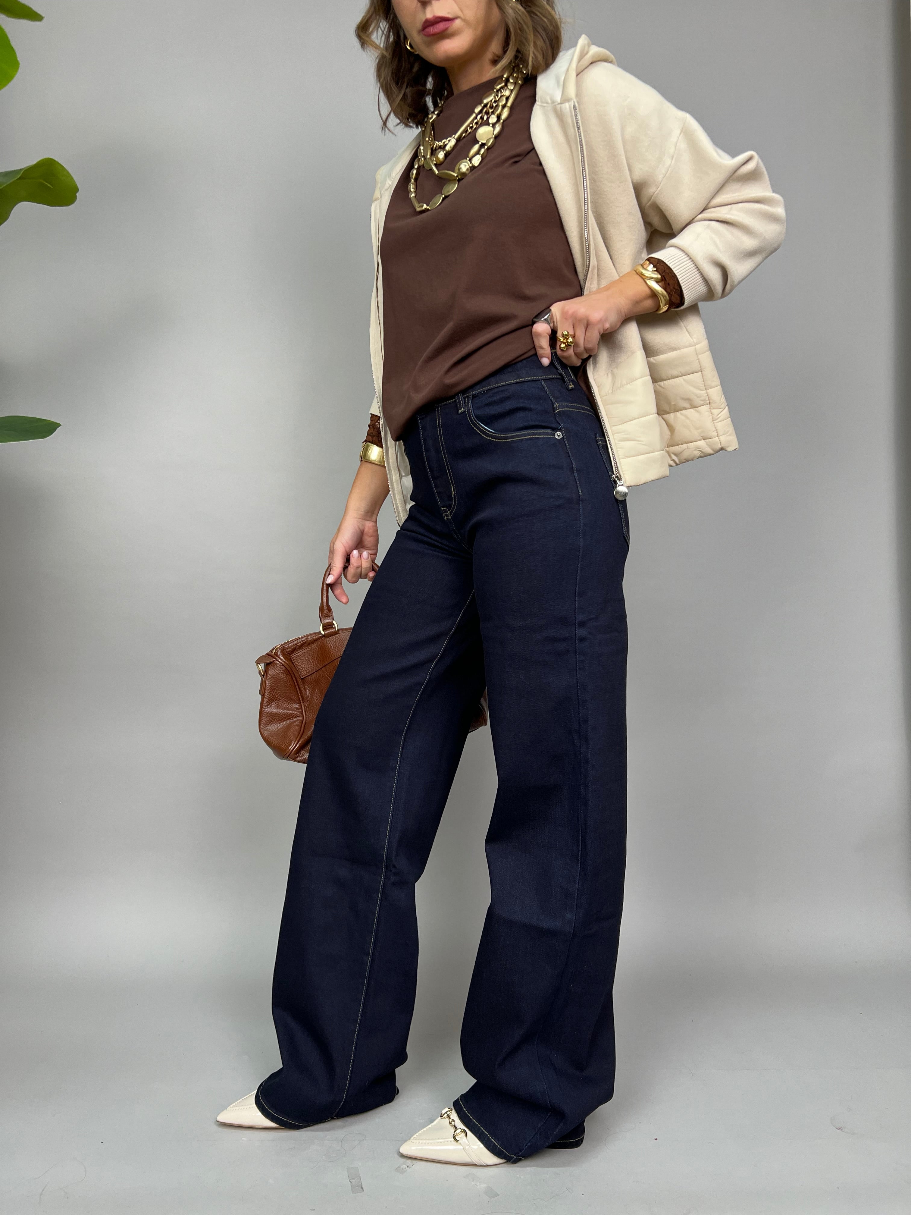 Jeans elasticizzato a palazzo. Modello comodo con cuciture in contrasto