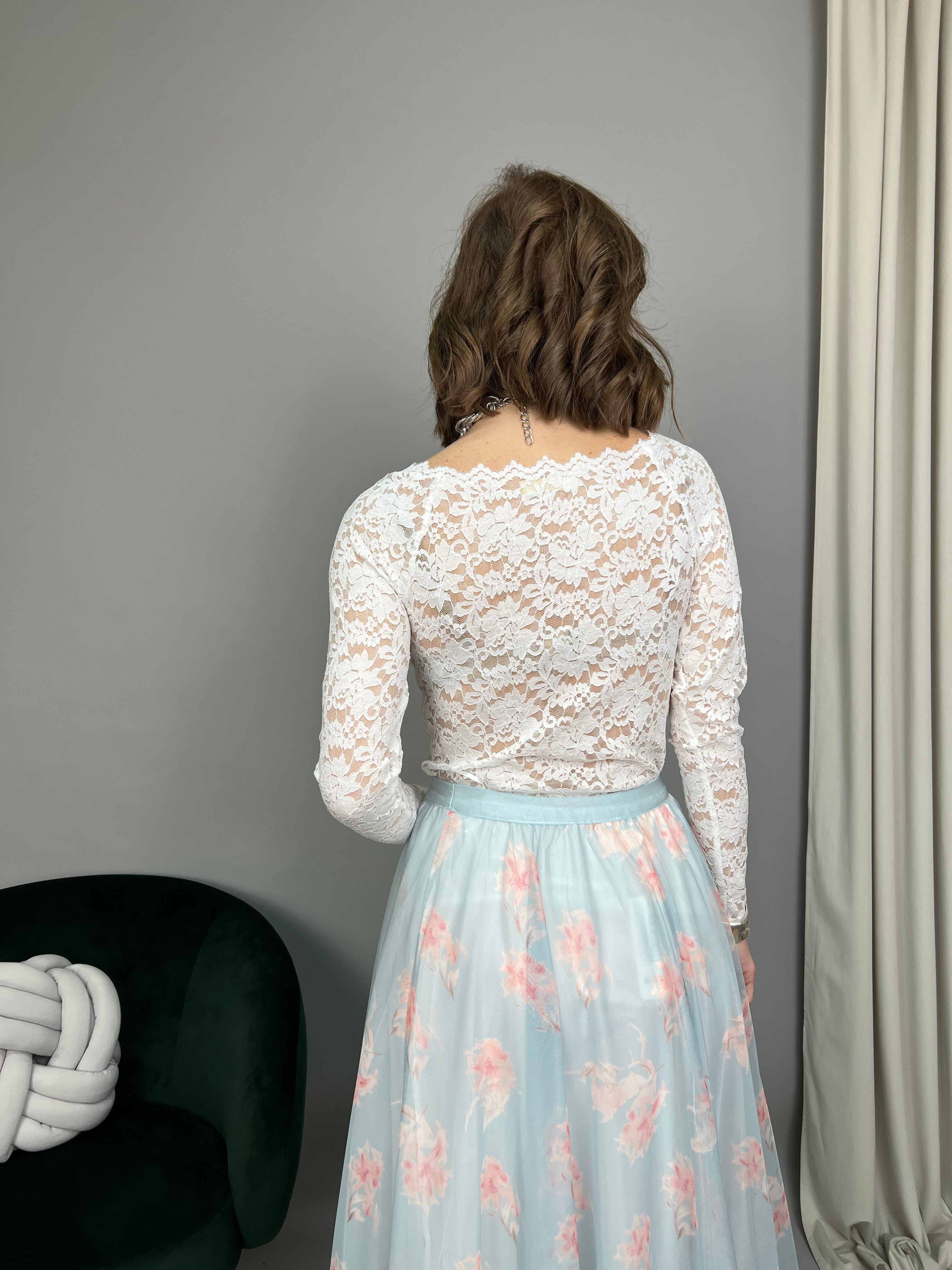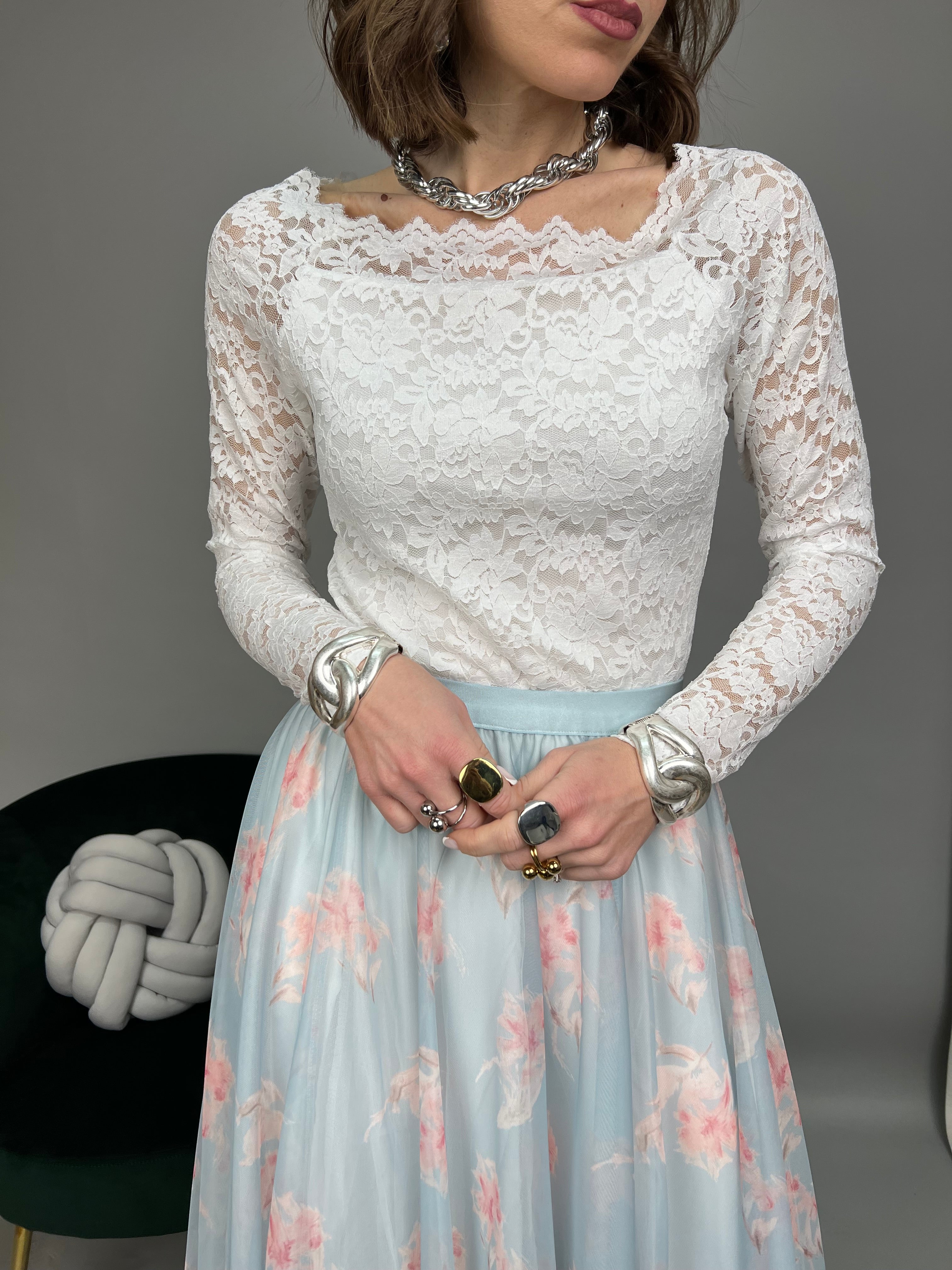 Maglia in pizzo a manica lunga, con scollo a barchetta. Presenta un rivestimento sulla parte frontale, mentre sul retro rimane in trasparenza. La vestibilità è regolare  ed il tessuto elasticizzato.