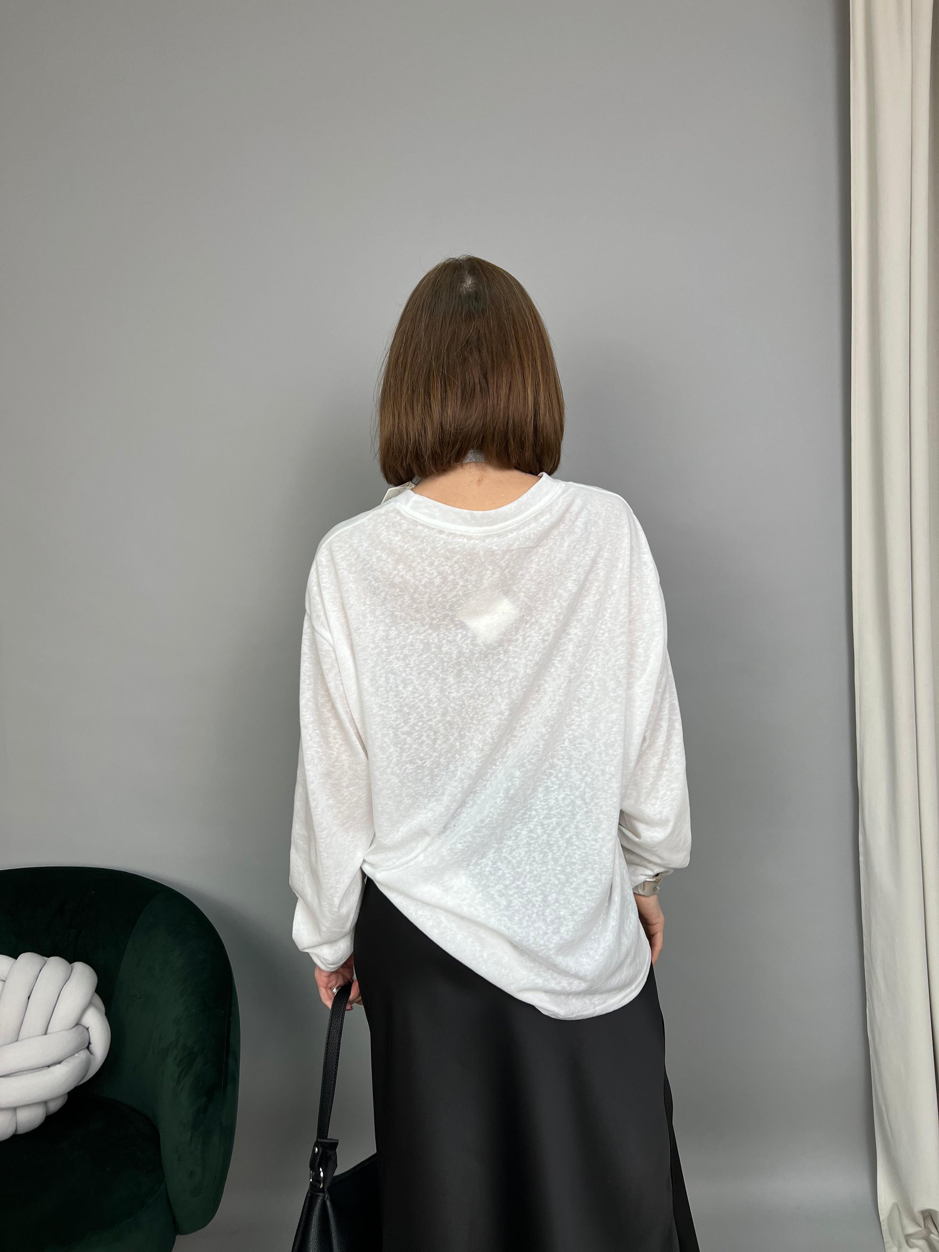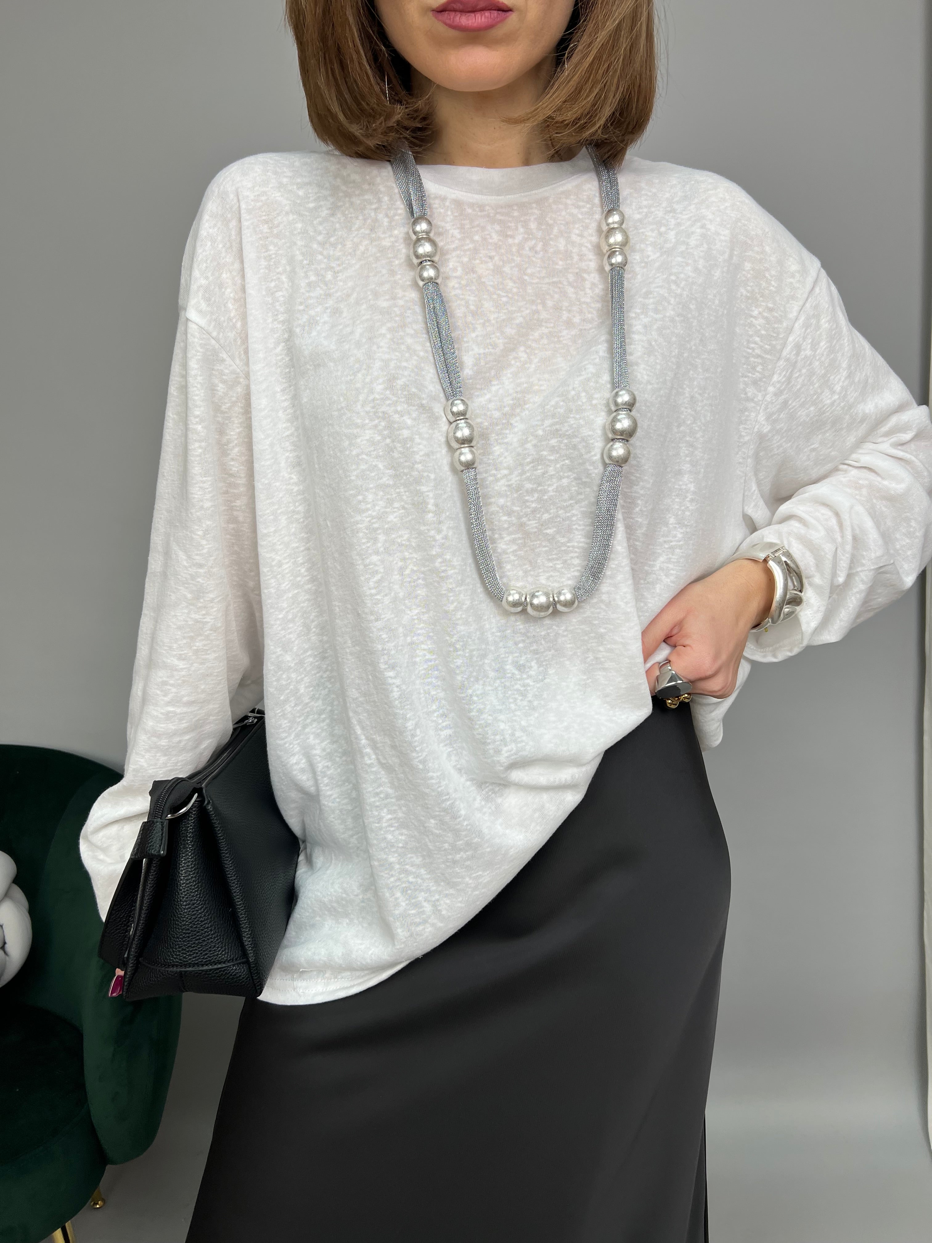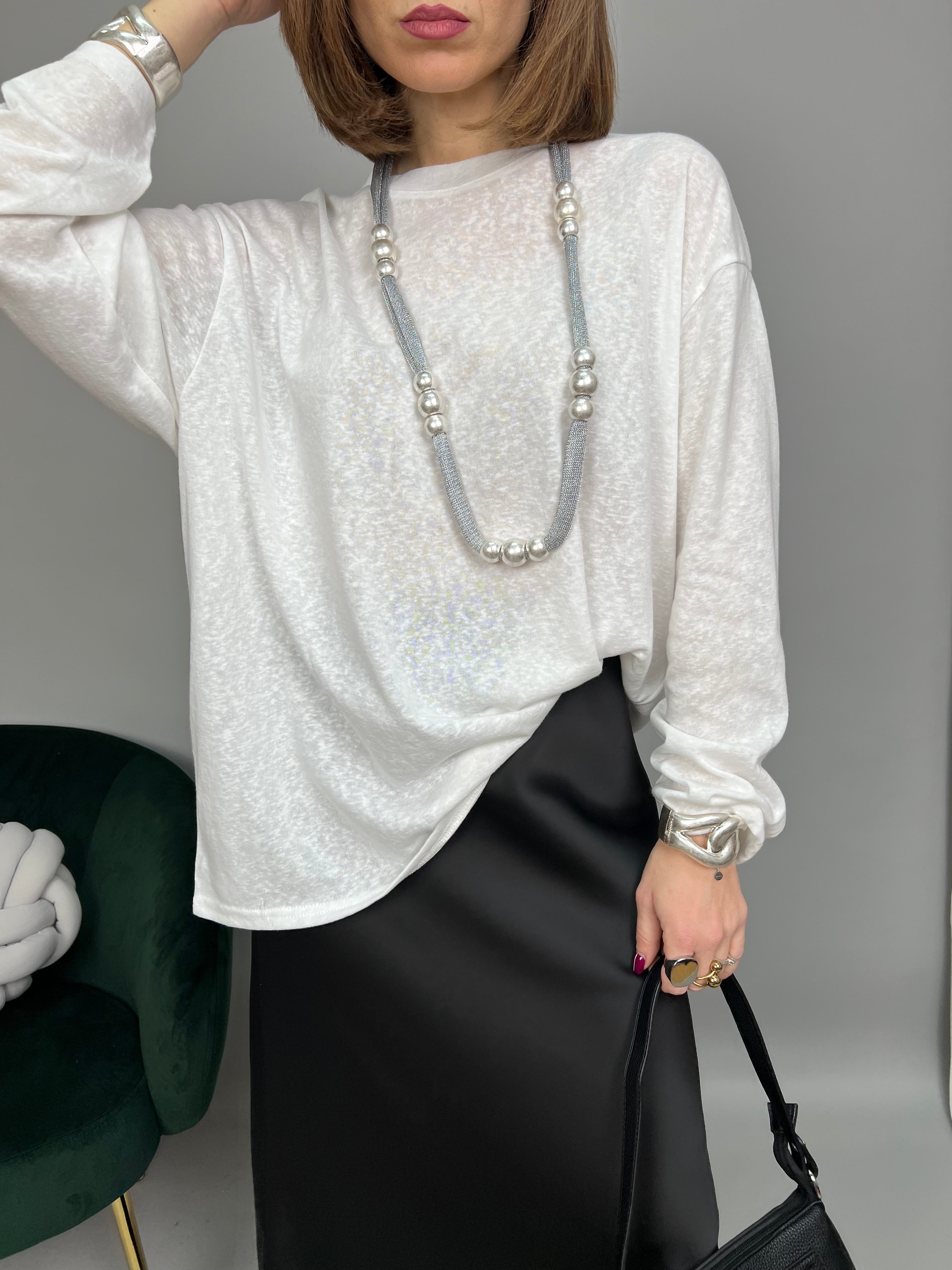 Maglia dal taglio over, con scollo tondo e manica lunga. La vestibilità è molto comoda.