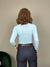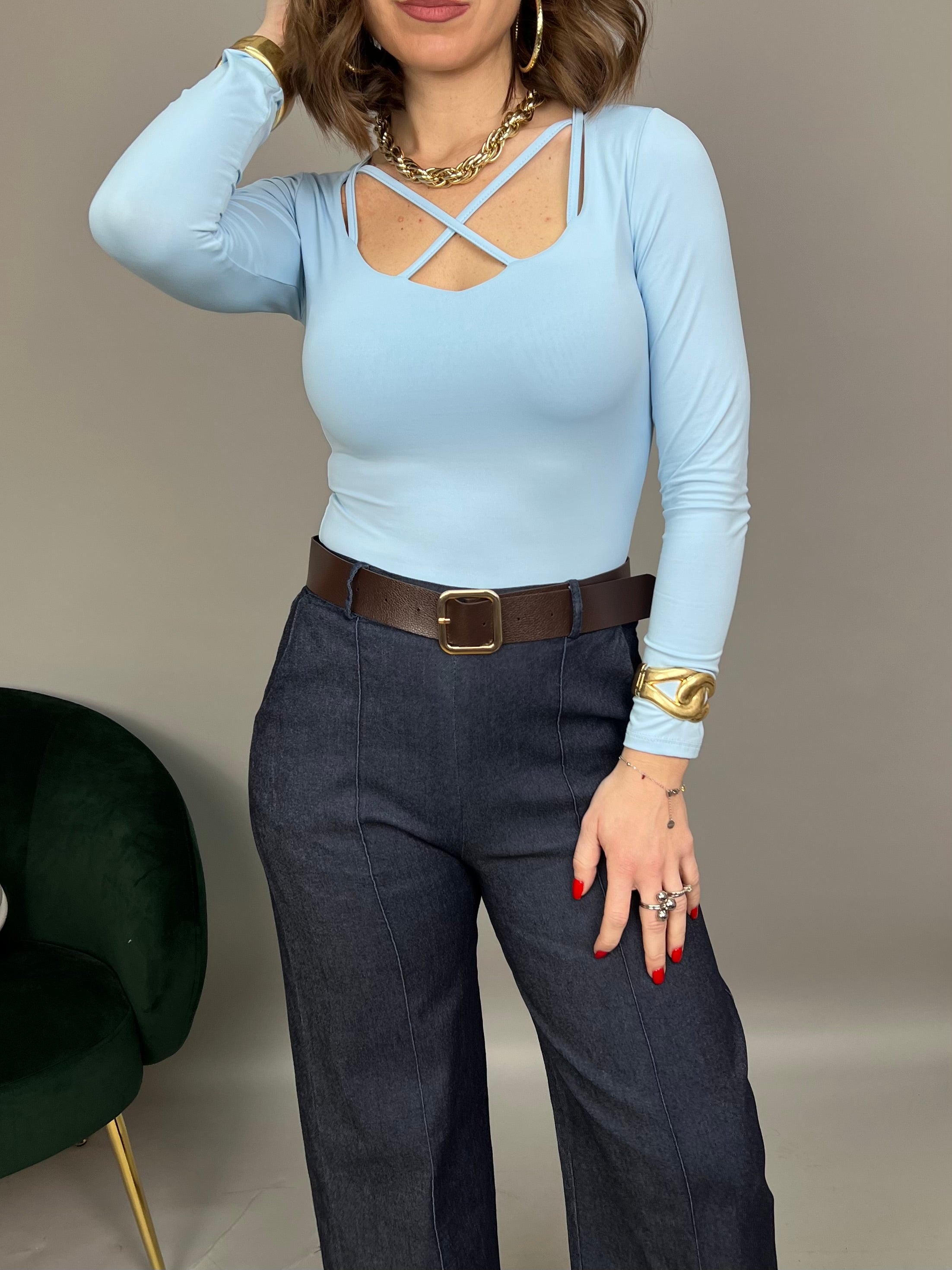 Maglia in lycra elasticizzata, con scollo a V e dettaglio incrociato sul décolleté. La vestibilità è regolare.