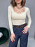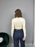Maglia in lycra elasticizzata, con scollo a V e dettaglio incrociato sul décolleté. La vestibilità è regolare.