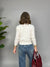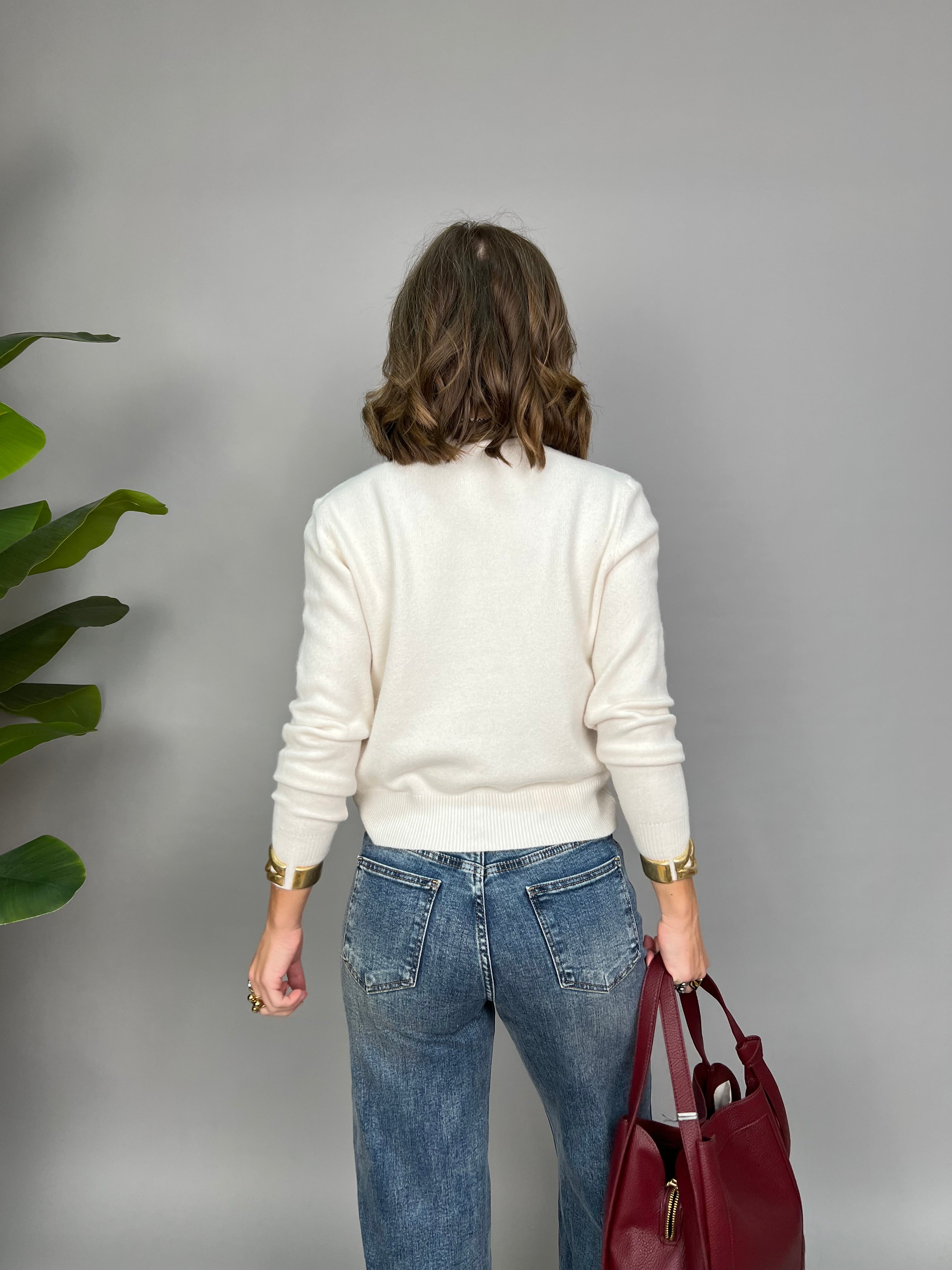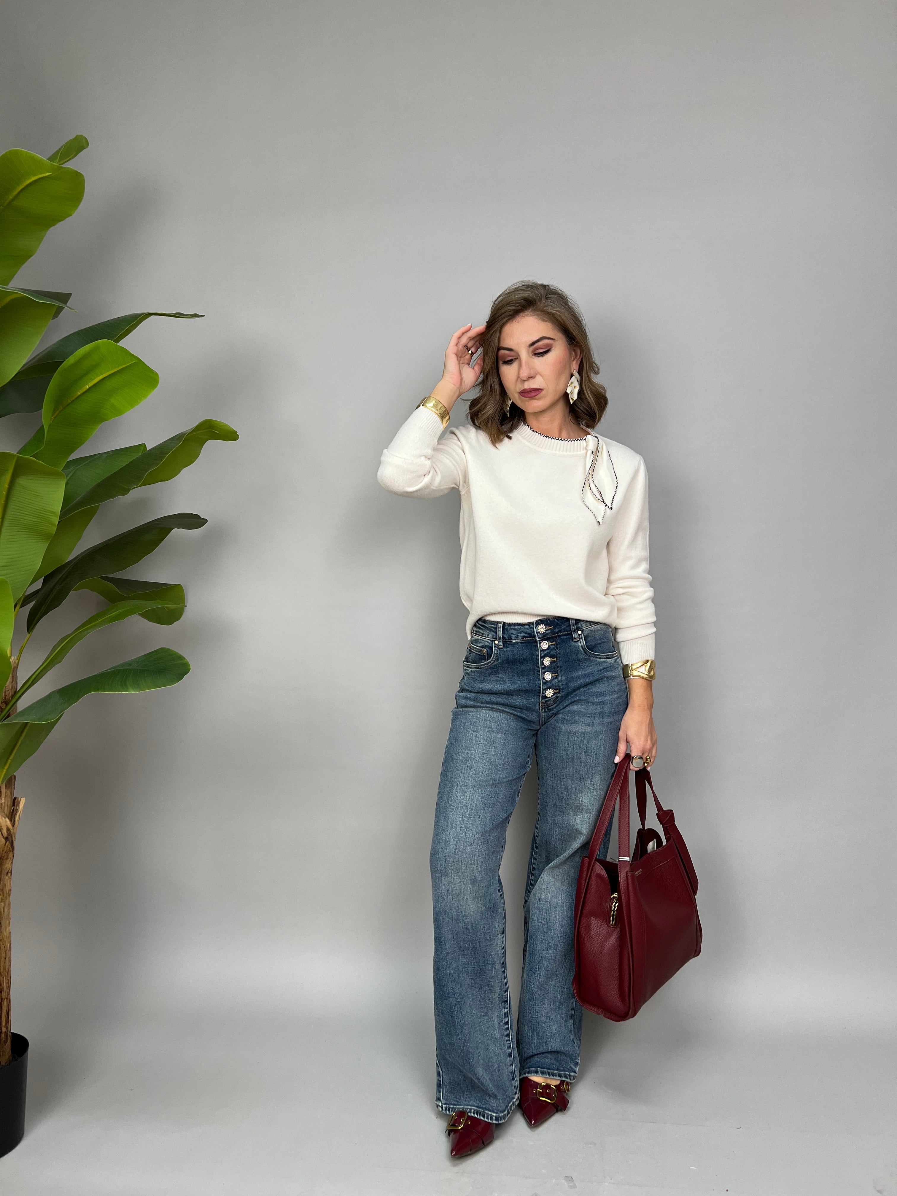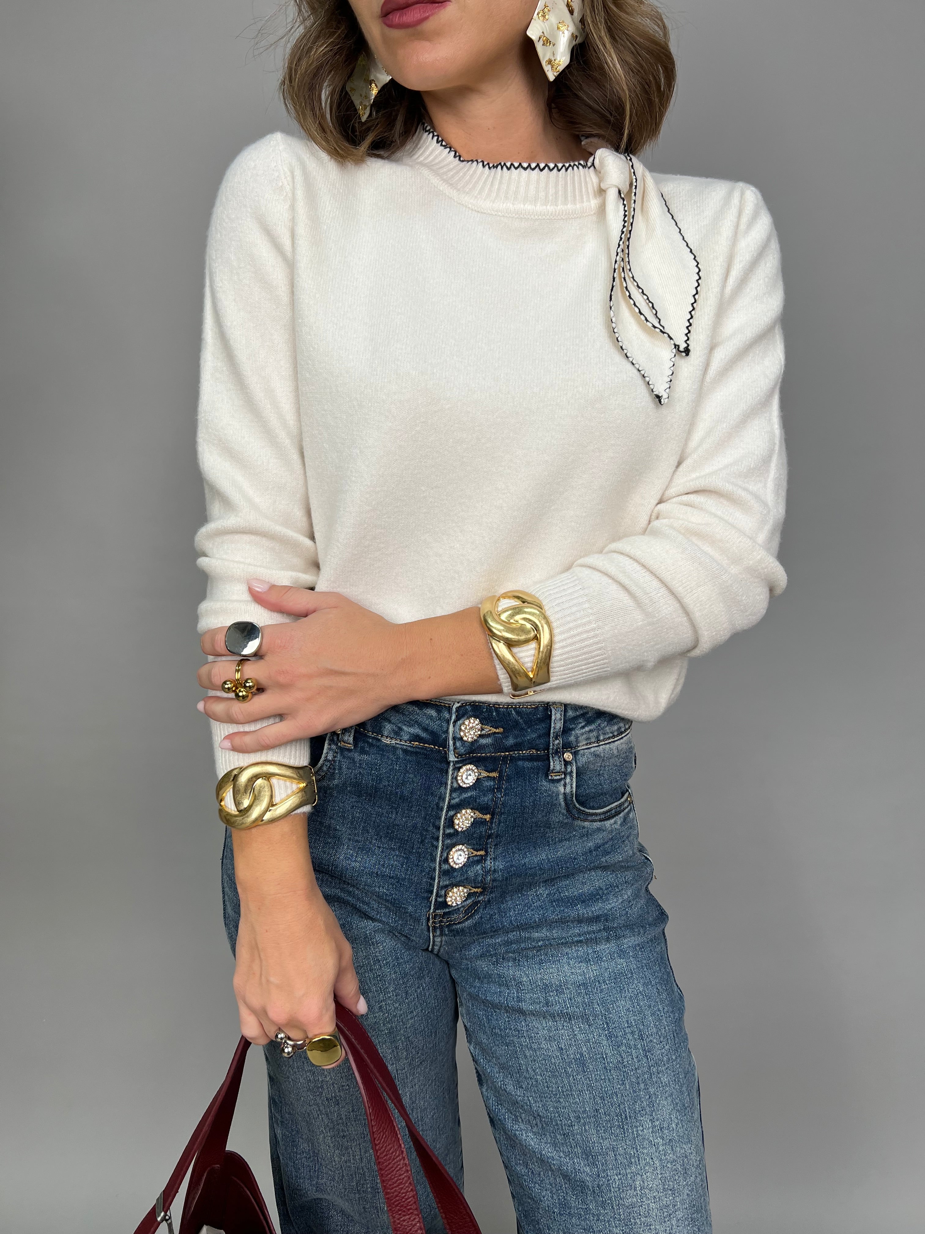 Maglioncino con contrasto sul collo e nodino puramente estetico. La vestibilità è comoda