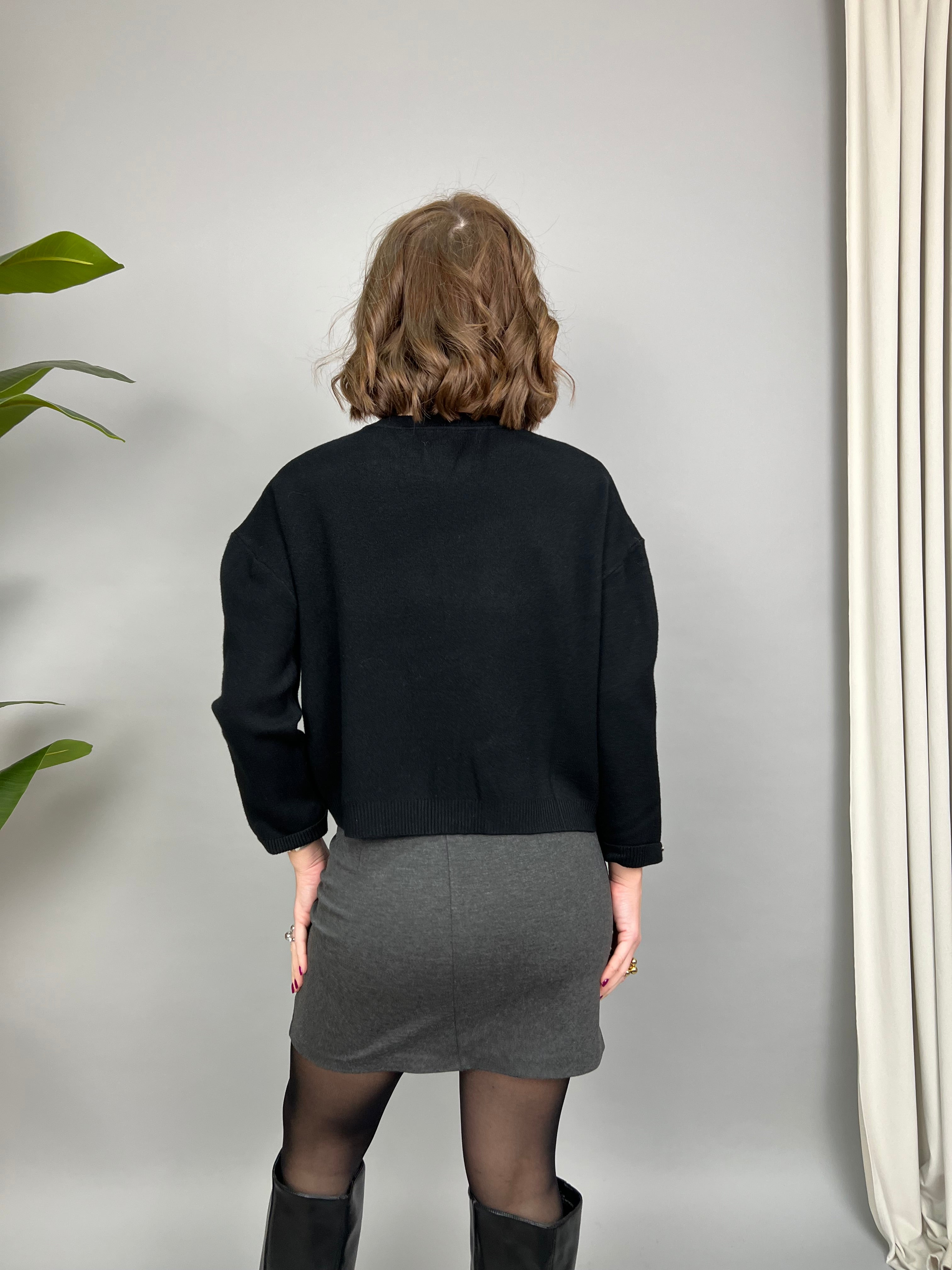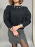 Maglione con collo tondo, in maglia doppia morbida e calda. La vestibilità è molto comoda. Il modello è caratterizzato dall'applicazione di piccoli charm gioiello di diverse forme, sulla scollatura. Presenta un piccolo risvolto sulle maniche, dove è presente un fiocchetto gioiello.