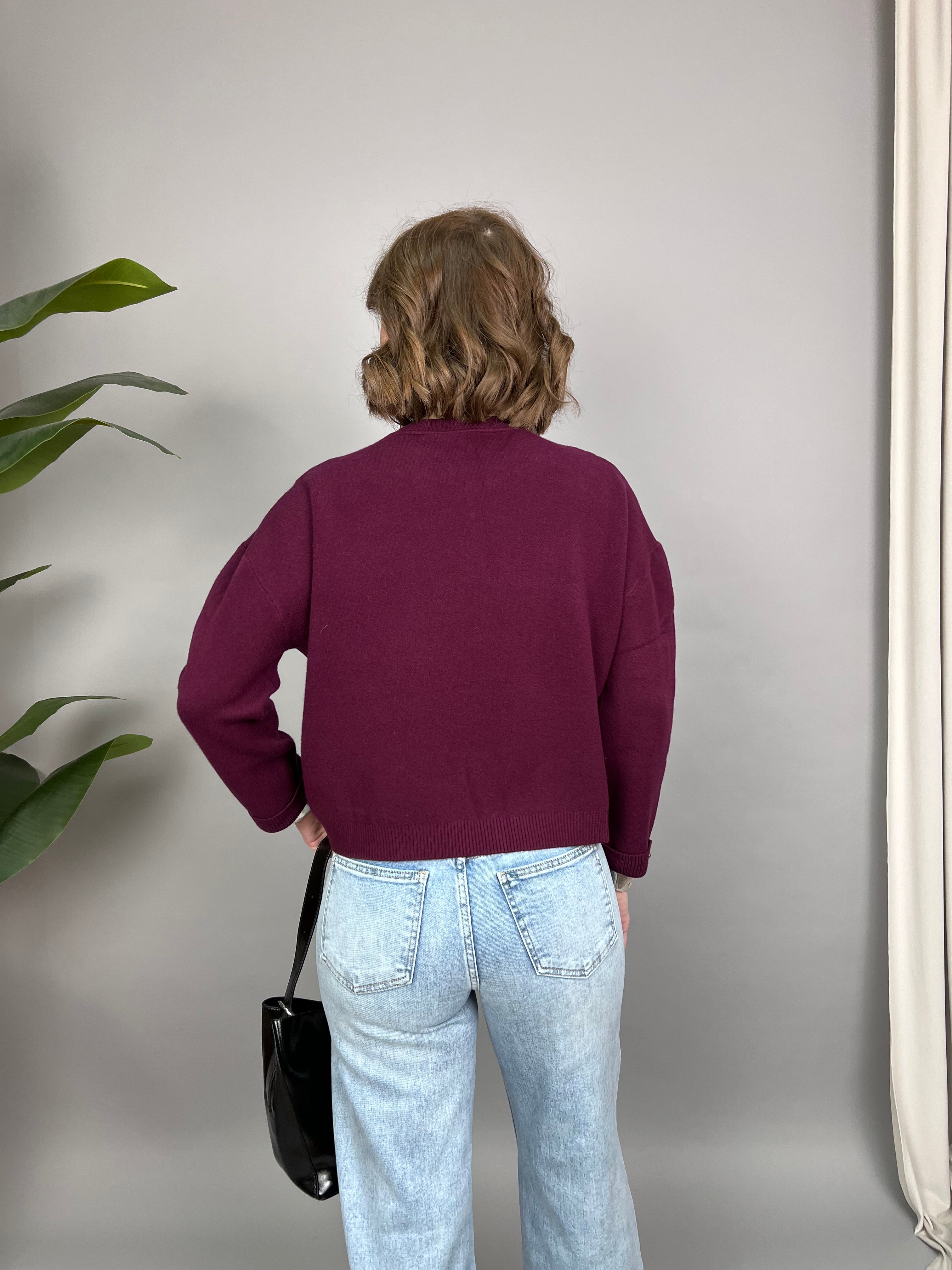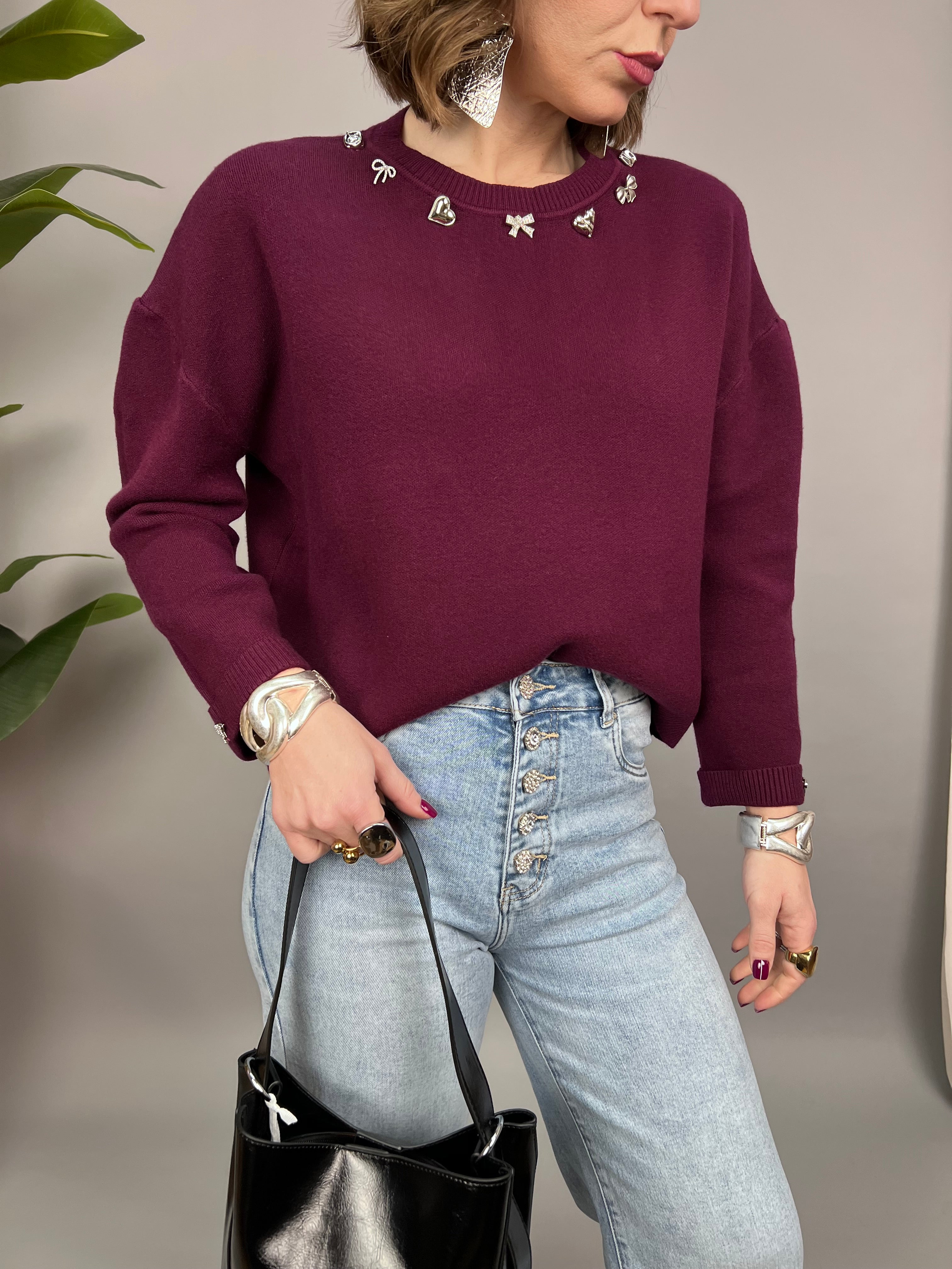 Maglione con collo tondo, in maglia doppia morbida e calda. La vestibilità è molto comoda. Il modello è caratterizzato dall'applicazione di piccoli charm gioiello di diverse forme, sulla scollatura. Presenta un piccolo risvolto sulle maniche, dove è presente un fiocchetto gioiello.