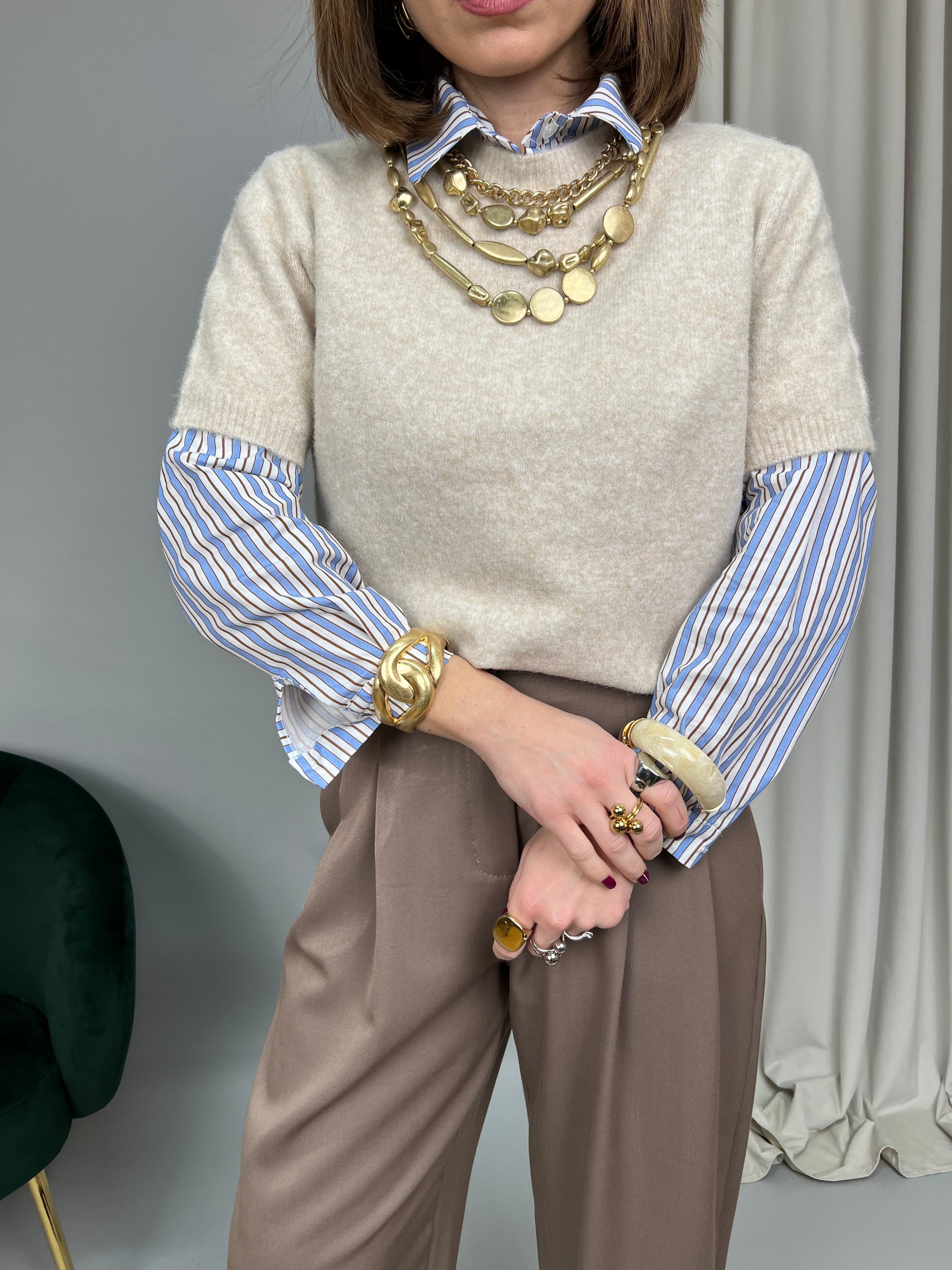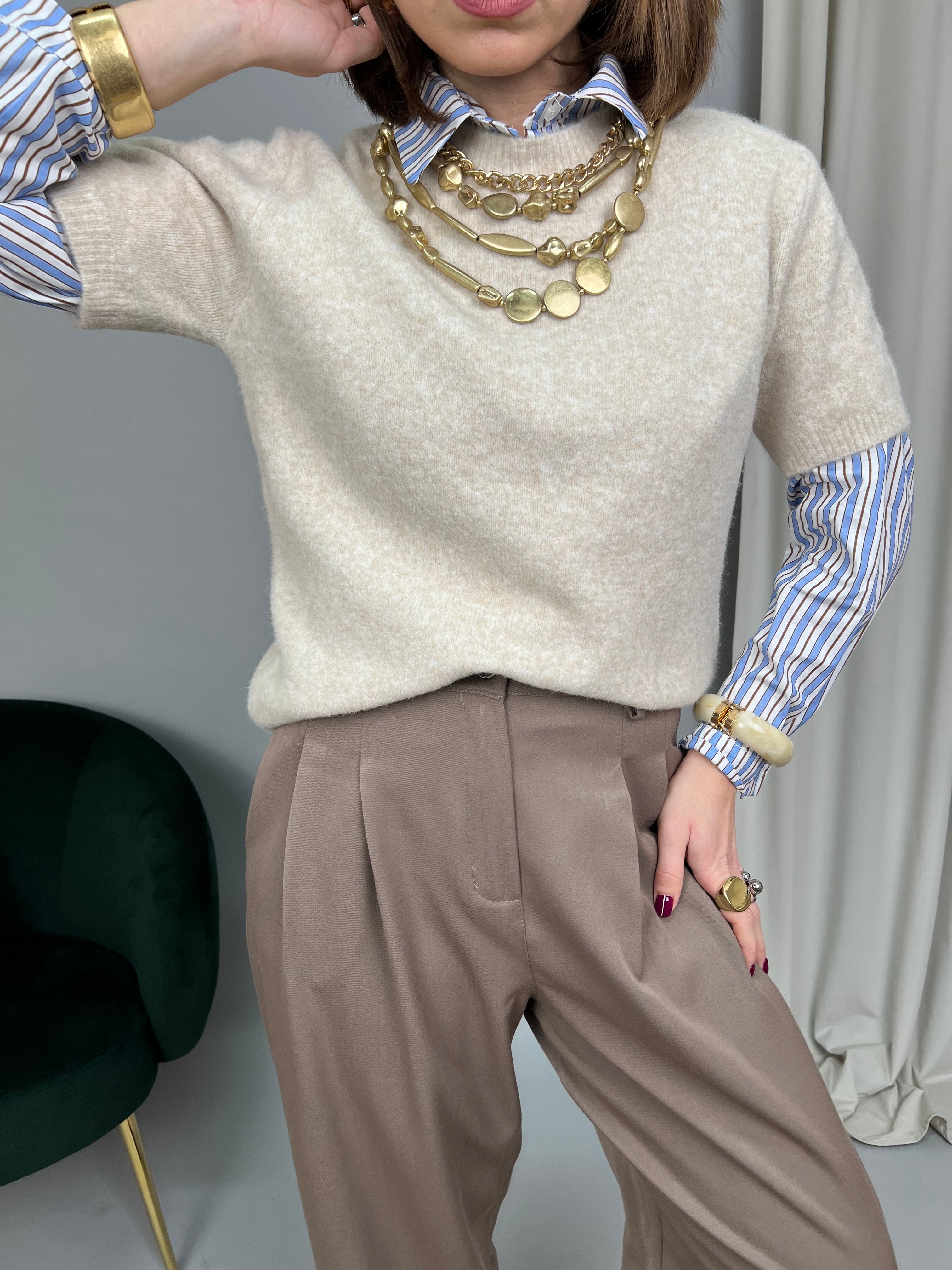 Maglione collo tondo e maniche corte. Realizzato in maglia calda e morbida. La vestibilità è comoda.