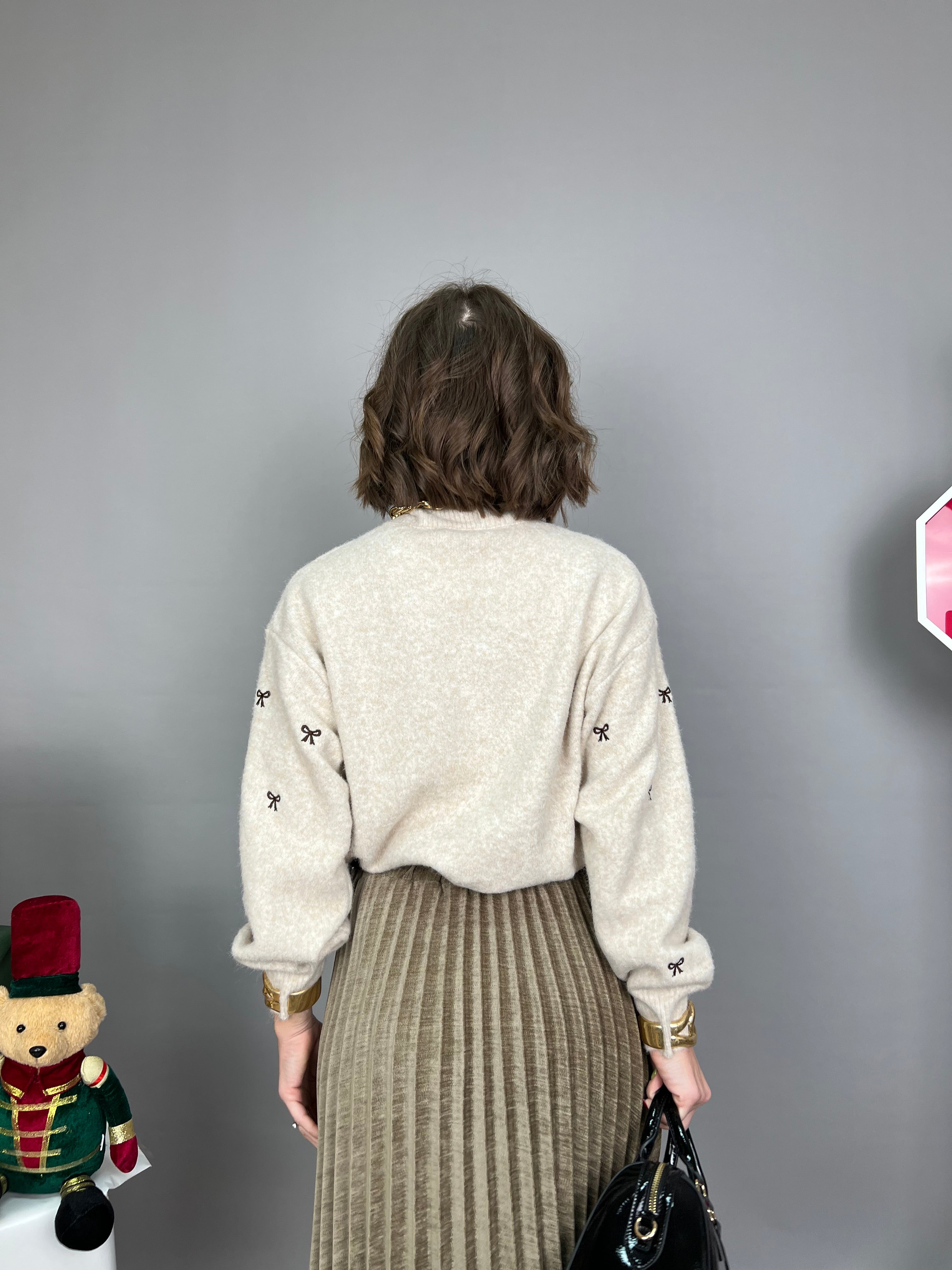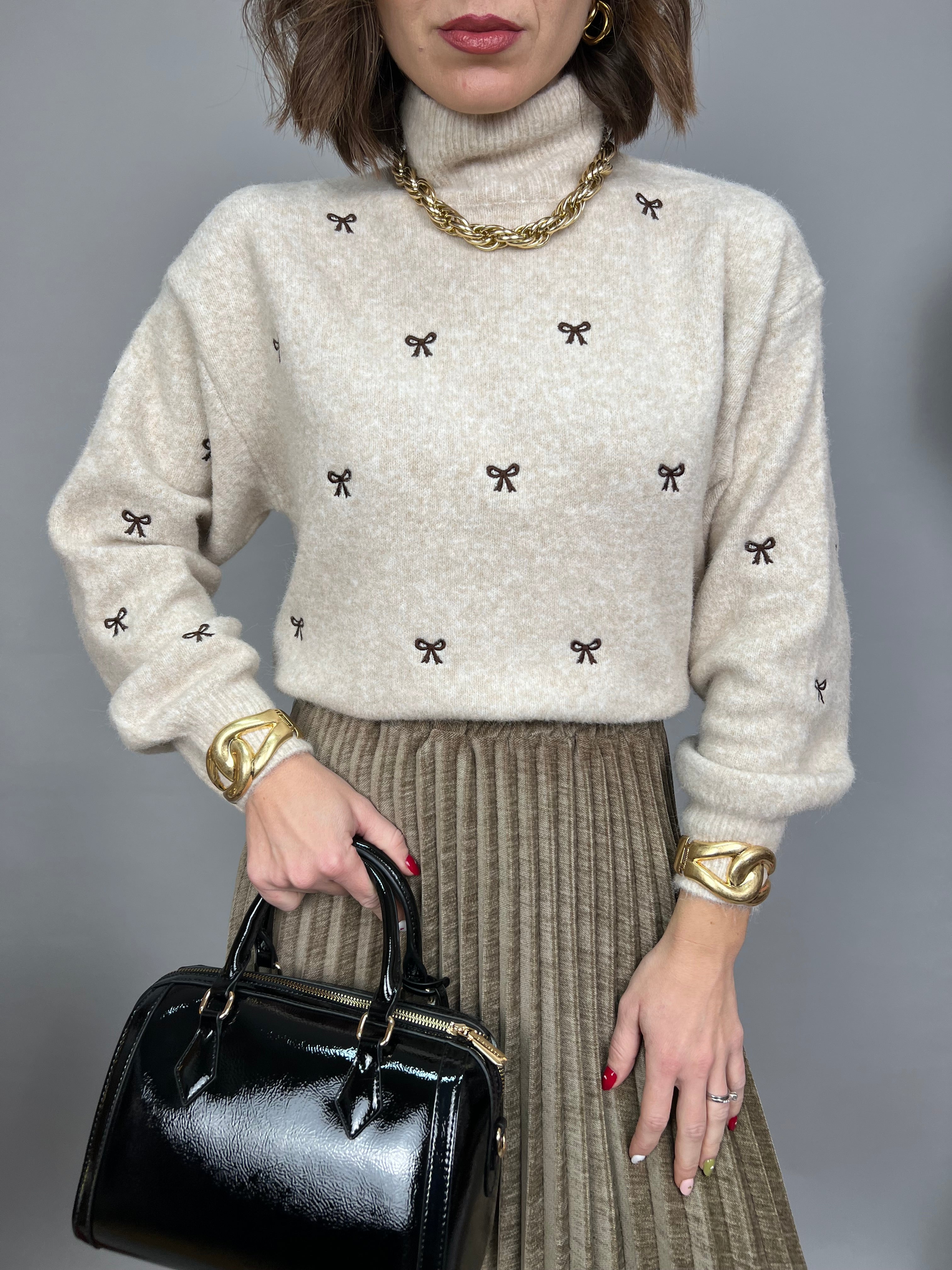 Maglione collo medio, manica a palloncino, dal tessuto morbido e caldo. La vestibilità è molto comoda. Sulla parte frontale sono presenti dei fiocchetti marroni ricamati a contrasto.