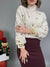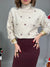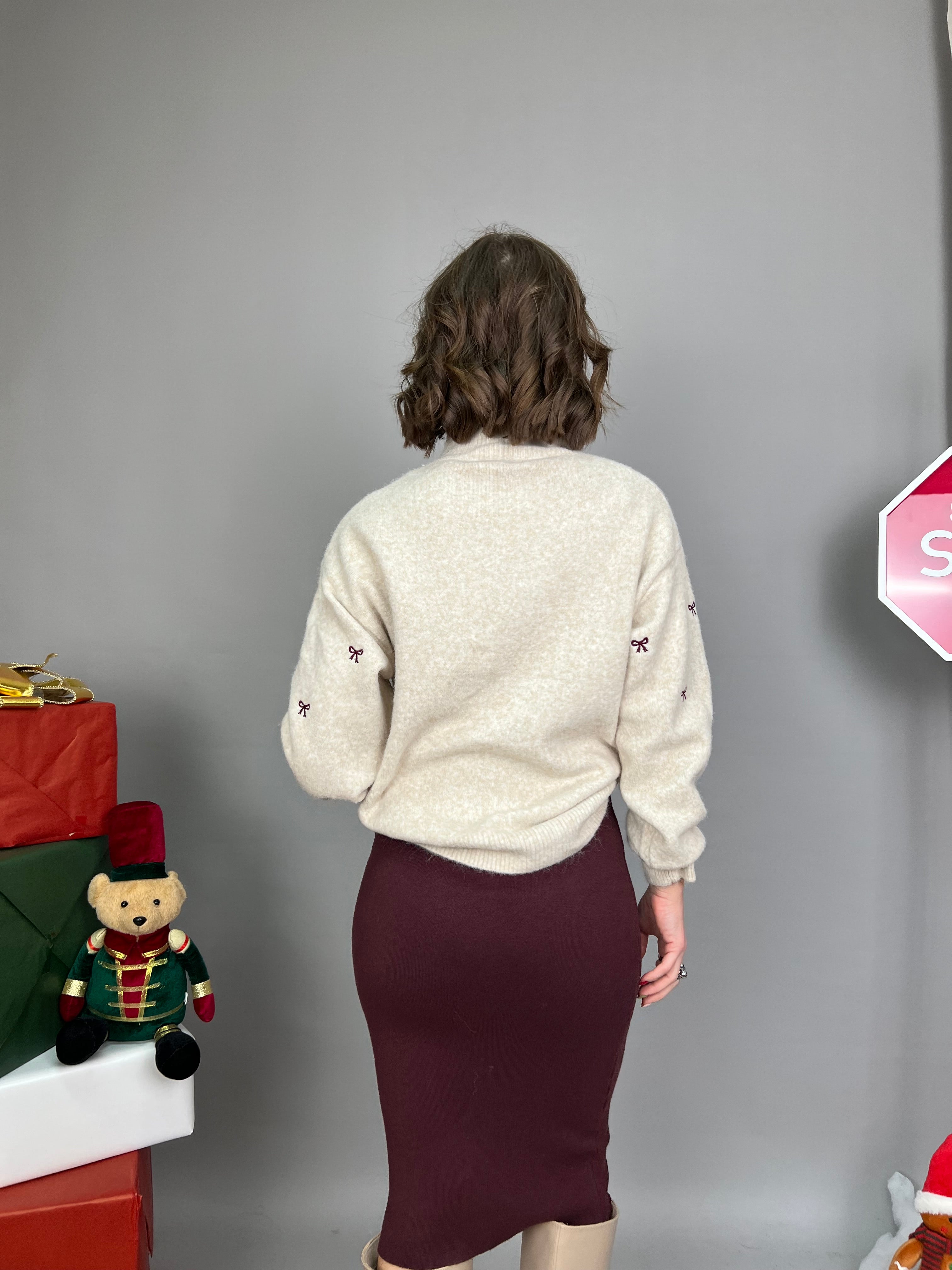 Maglione collo medio, manica a palloncino, dal tessuto morbido e caldo. La vestibilità è molto comoda. Sulla parte frontale sono presenti dei fiocchetti bordeaux ricamati a contrasto.