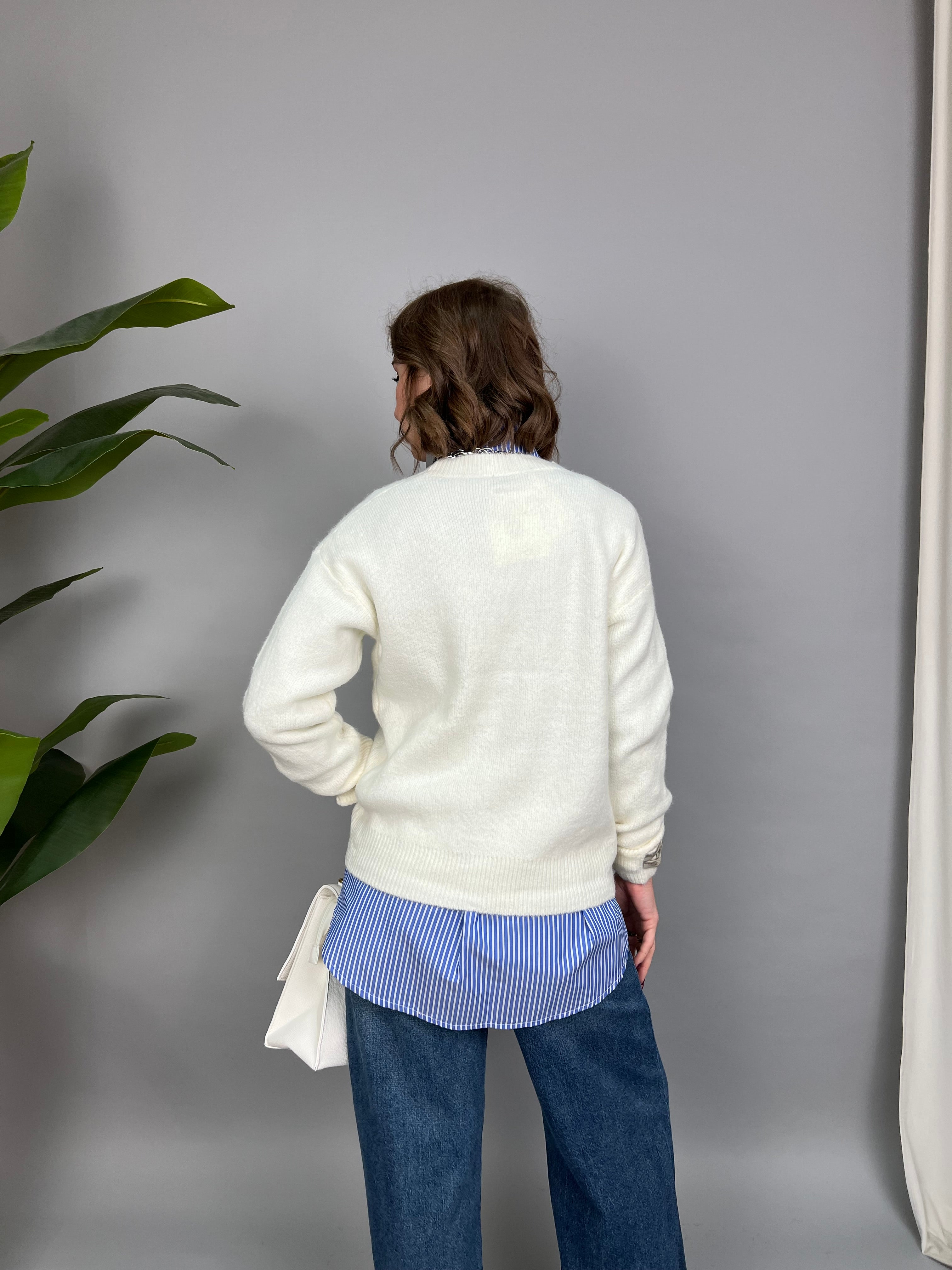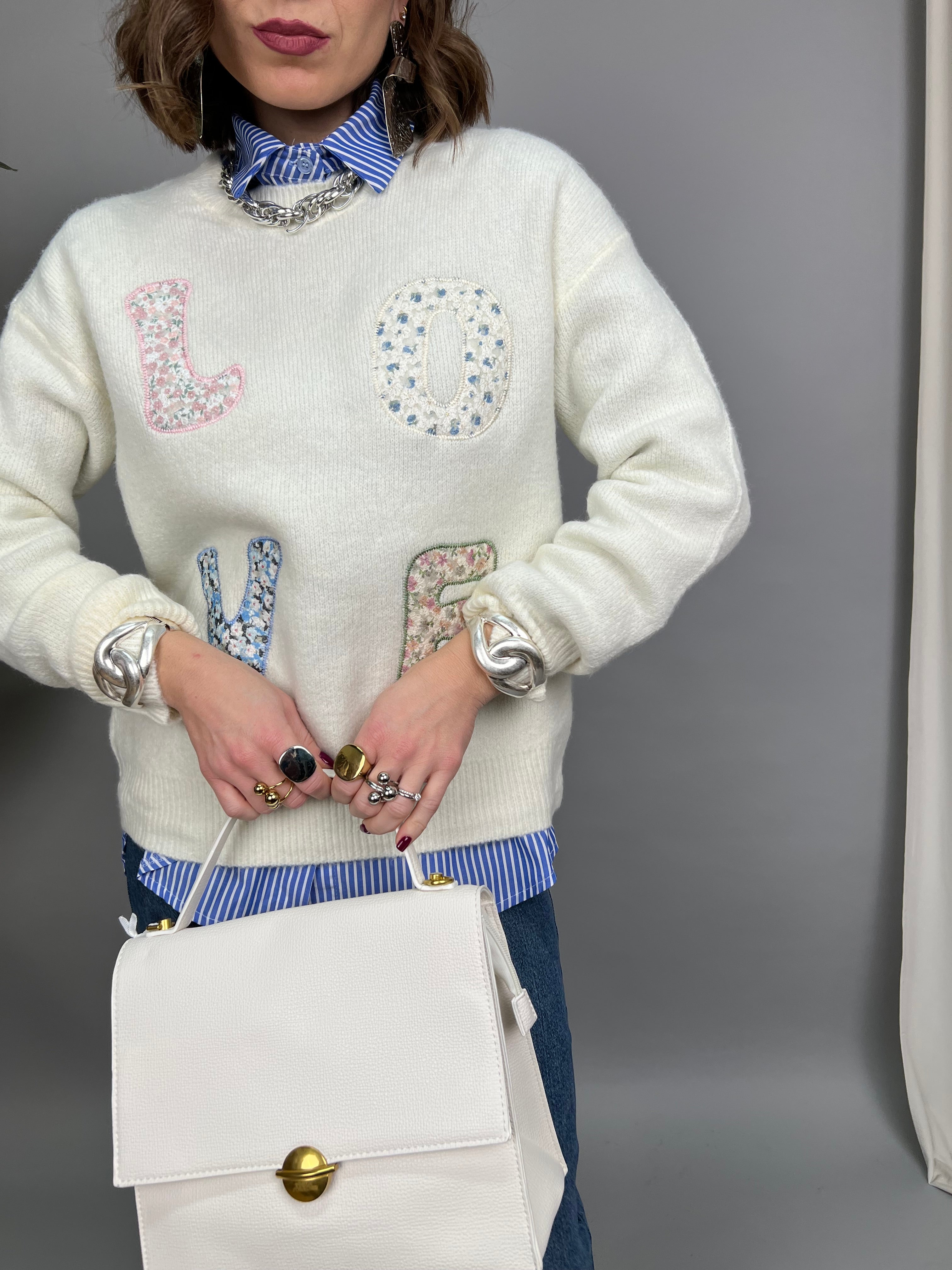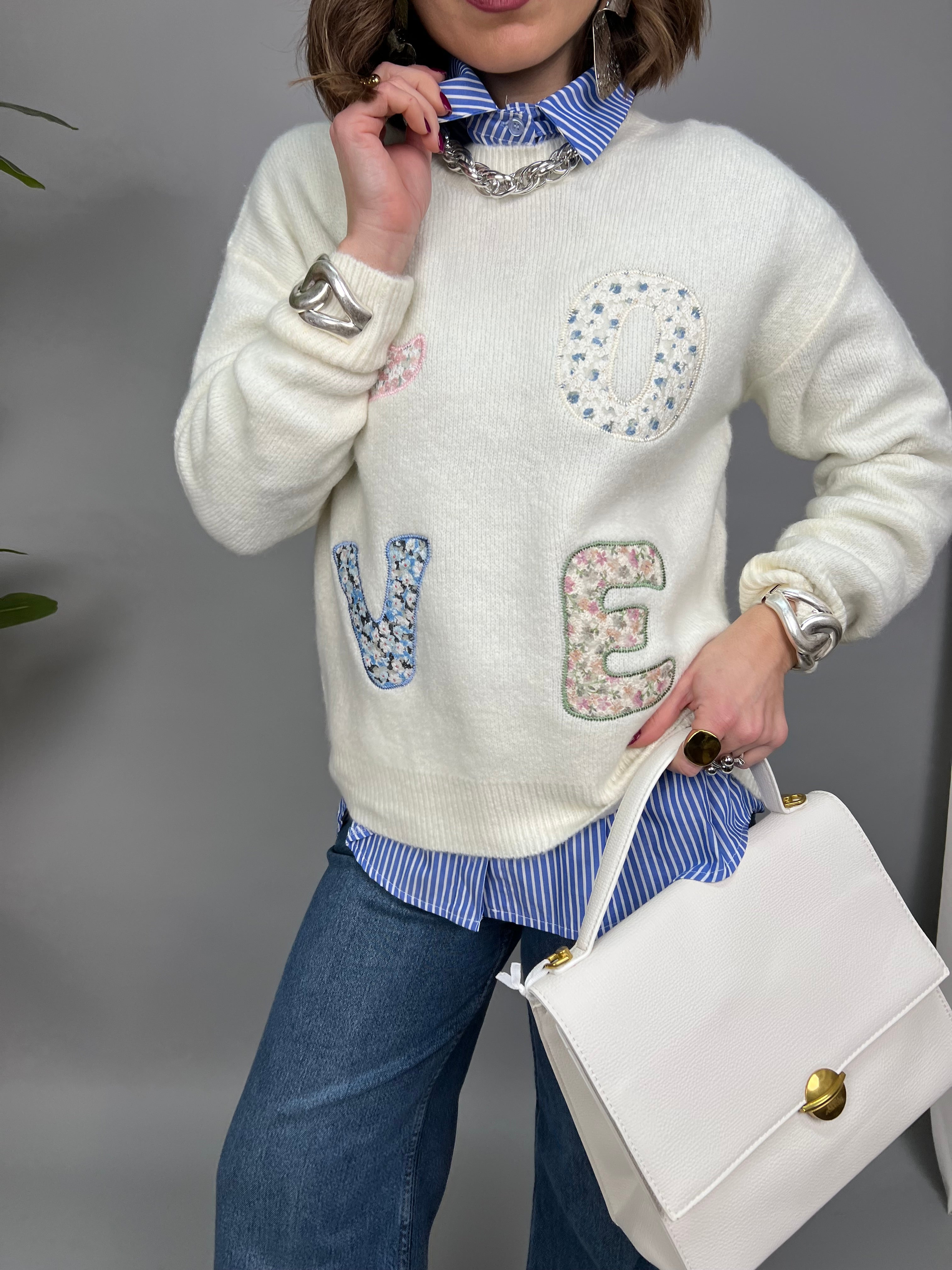 Maglione con collo tondo, in un filato morbido e caldo. La vestibilità è comoda. Presenta la scritta "LOVE" applicata a rilievo in stoffa floreale sulla parte frontale.
