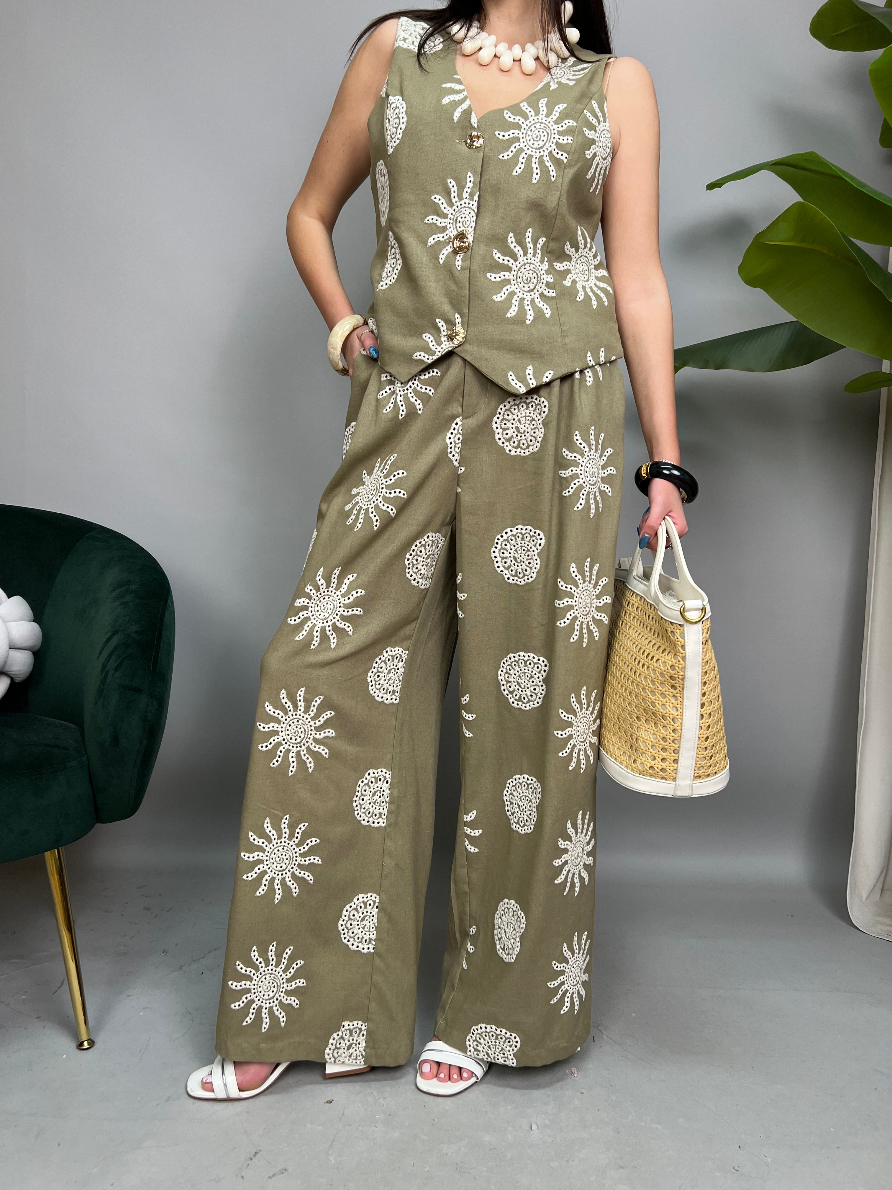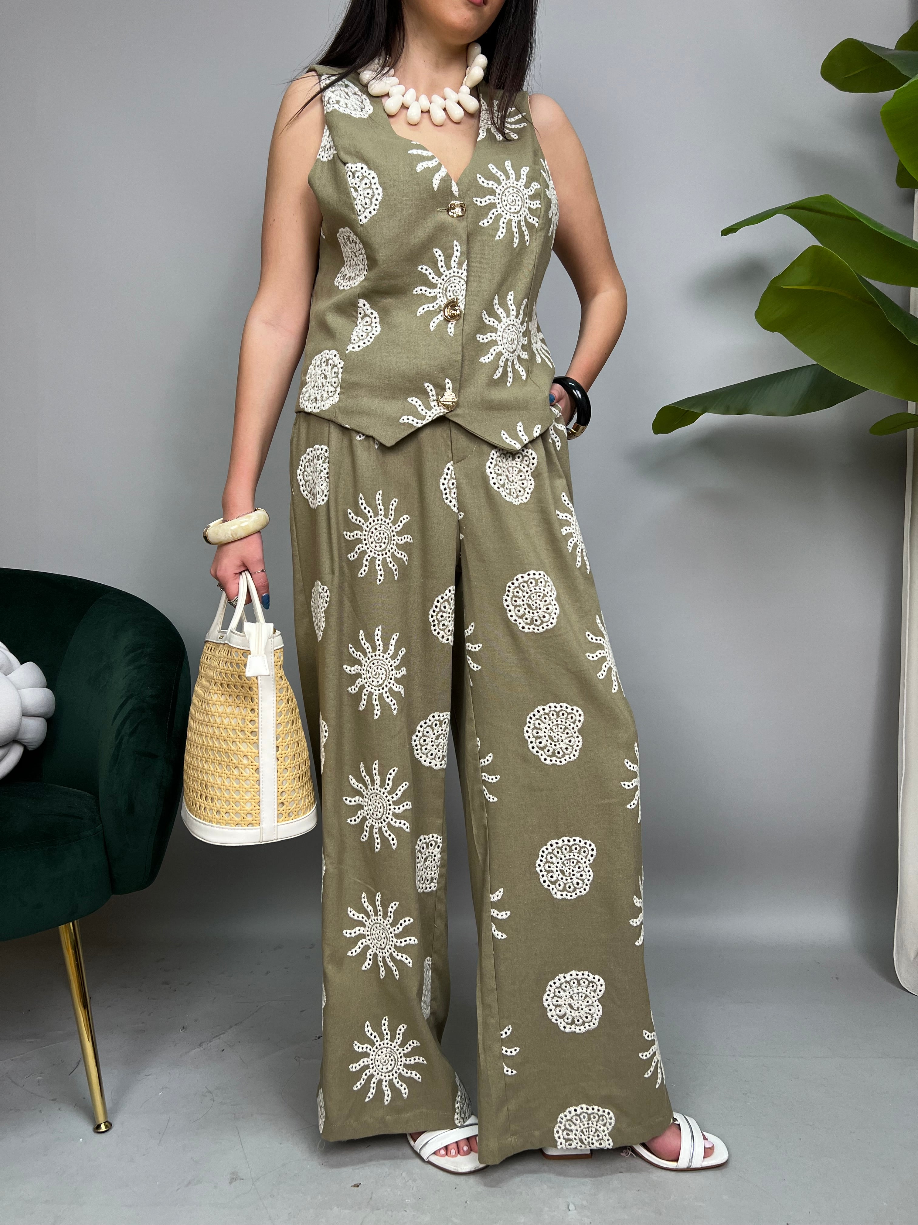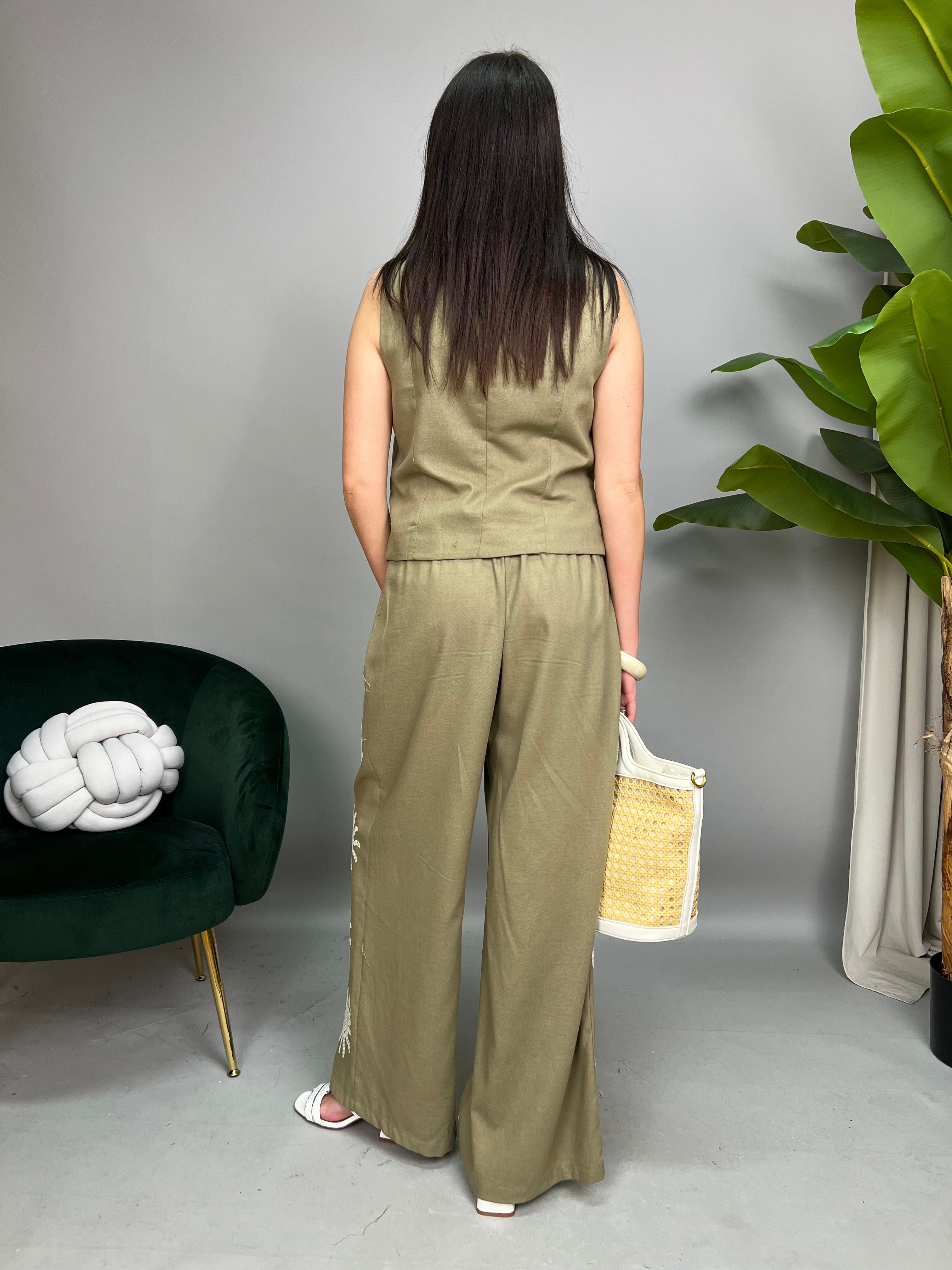Pantalone in misto cotone e lino, modello "Palazzo" con una gamba ampia e dritta, pinces frontali, chiusura con zip & bottone frontale, elastico sul retro e tasche laterali. Il modello è impreziosito da ricami leggermente traforati sulla parte frontale. Il tessuto è fresco. La vestibilità è comoda.