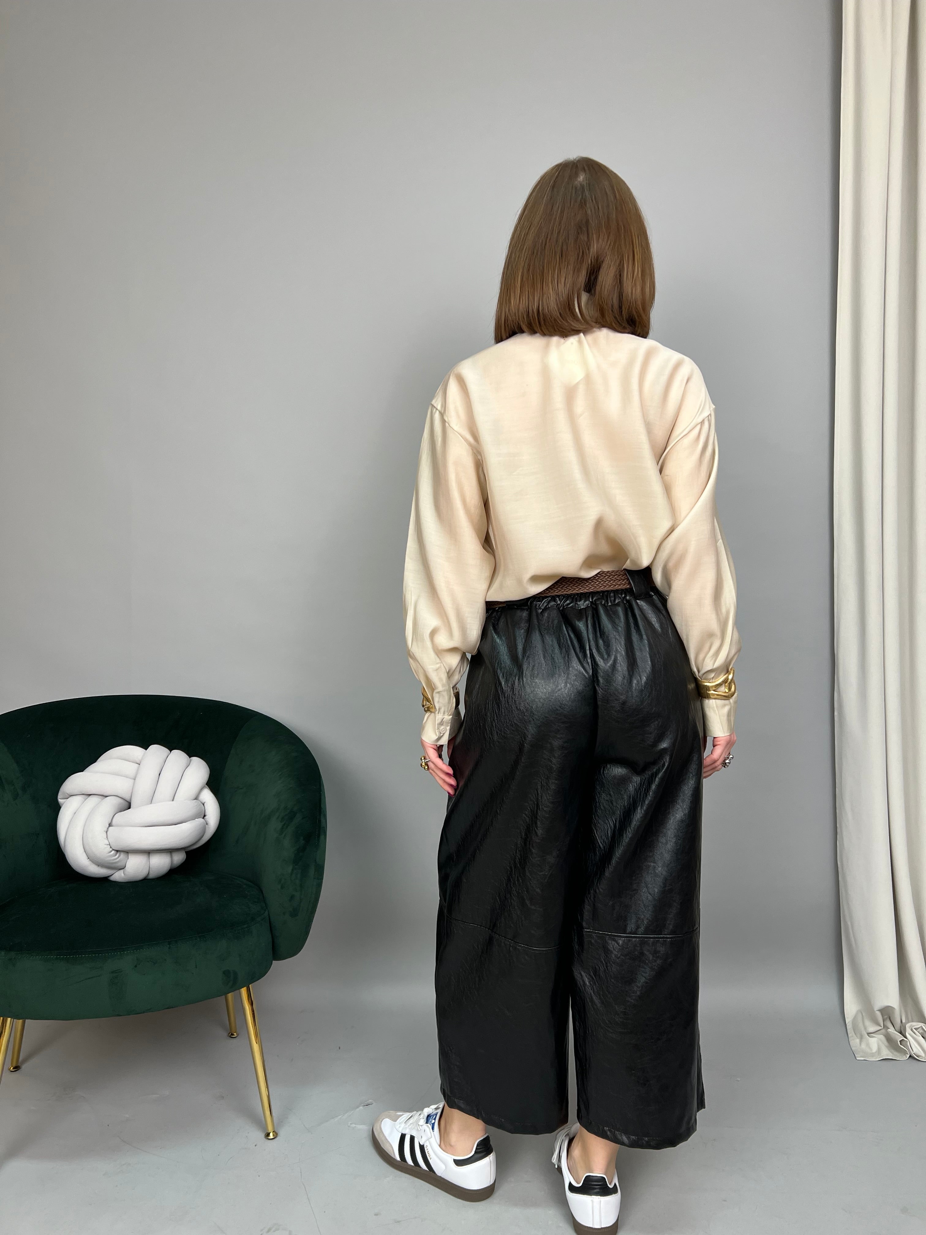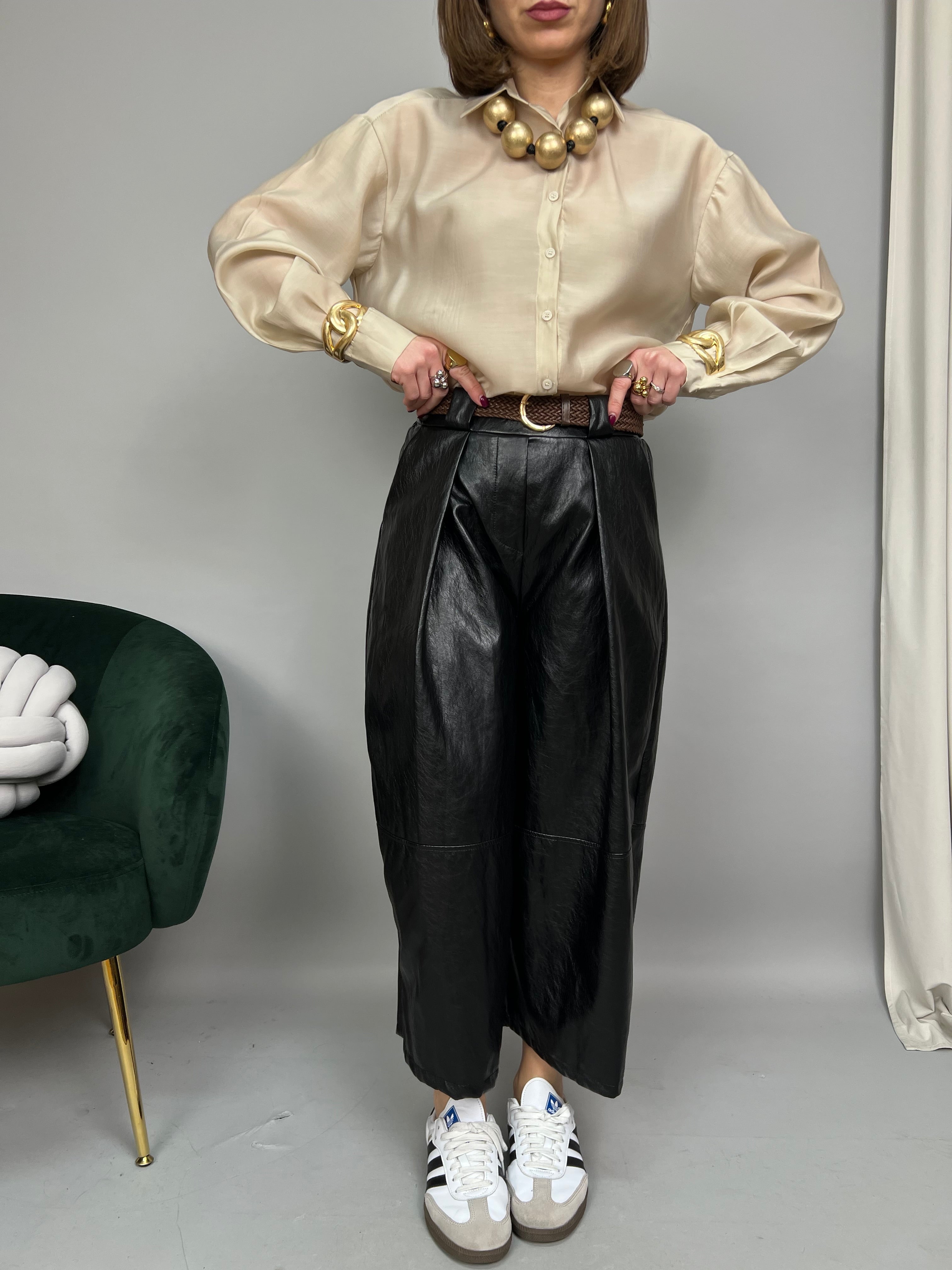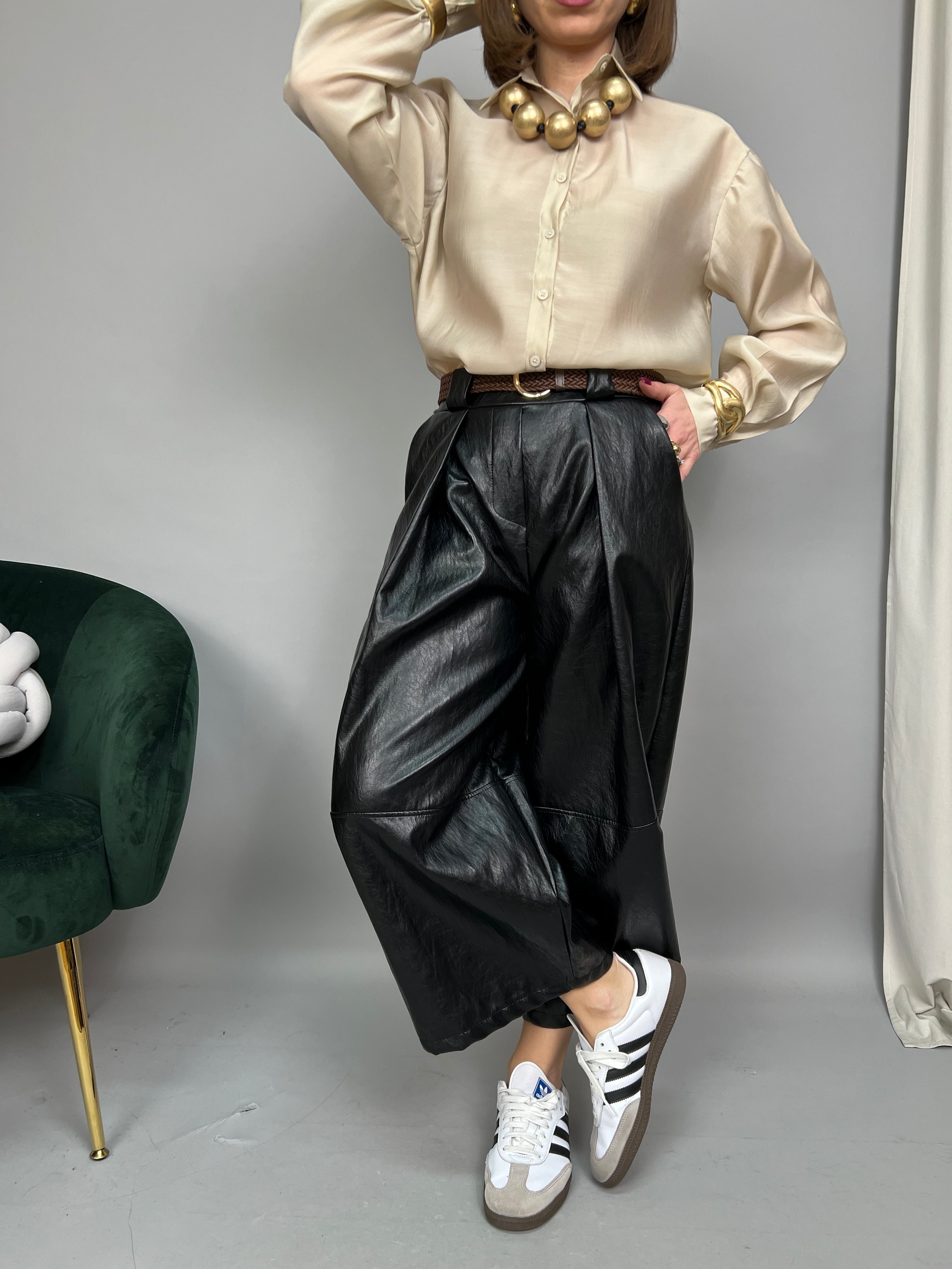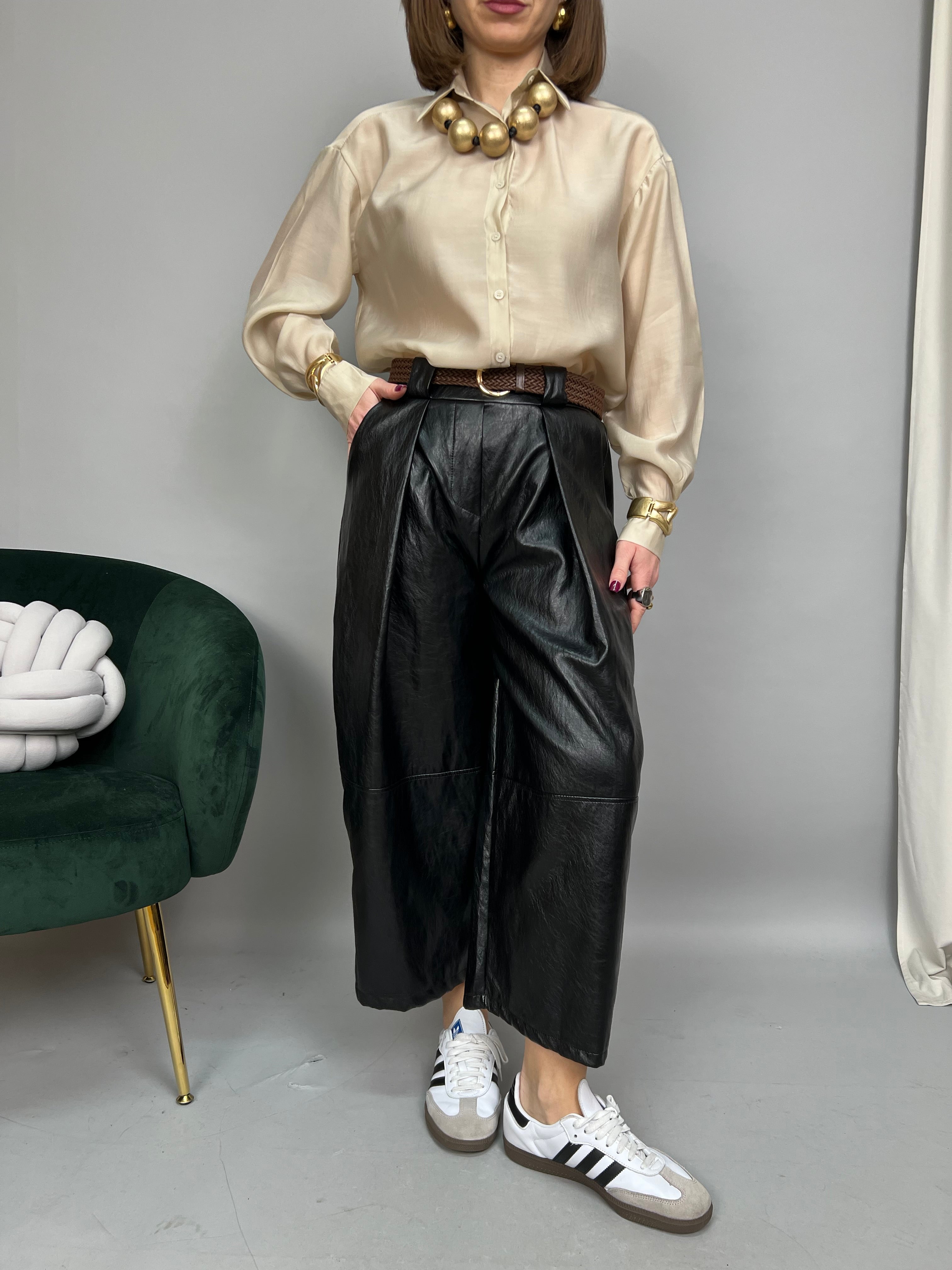 Pantalone in ecopelle morbida, modello "wide leg" con lunghezza 7/8. Presenta pinces frontali, elastico sul retro e tasche laterali. La vestibilità è comoda. La cintura è inclusa.